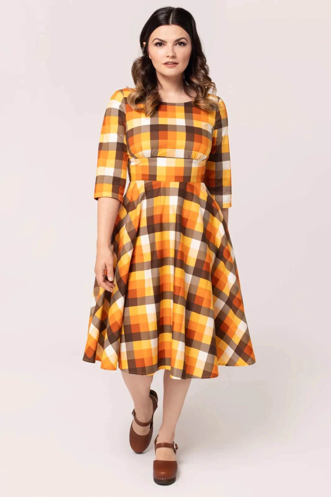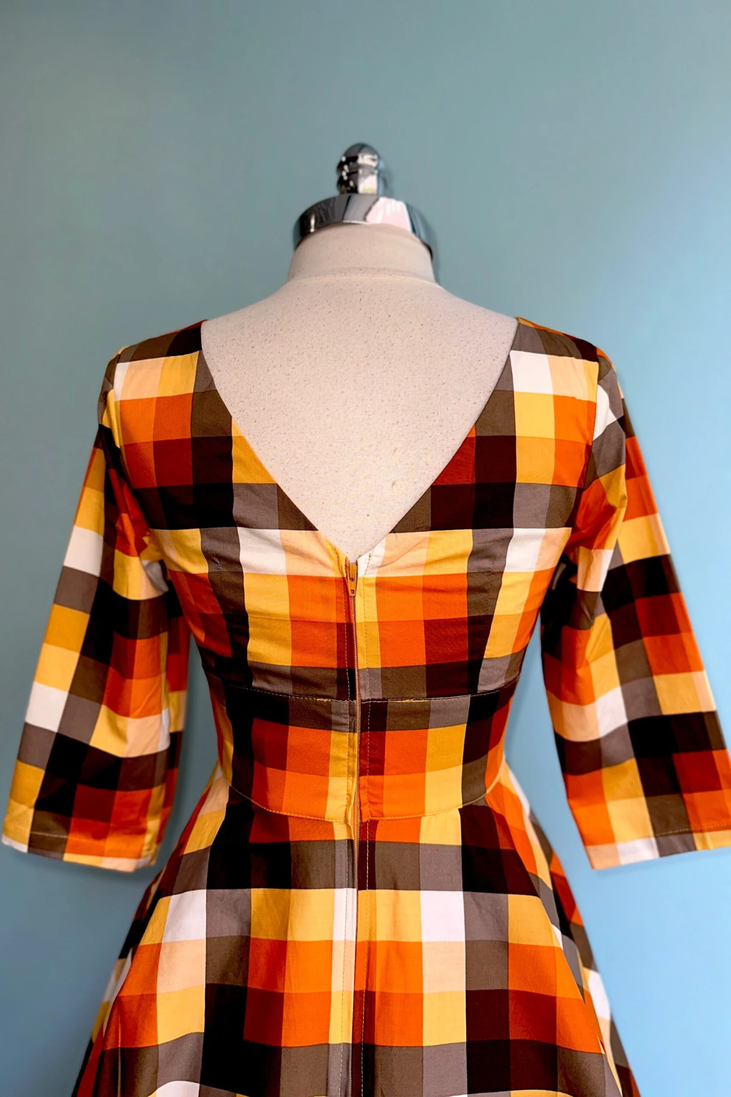 Orange, brown, yellow and off white plaid dress with elbow length sleeves and a nice full skirt. This dress has a back zip and pockets. The back has a soft V shape and the front is a bateau neckline. There is a wide waist band with gathering under the bustline. This is a great addition to your spooky wardrobe!