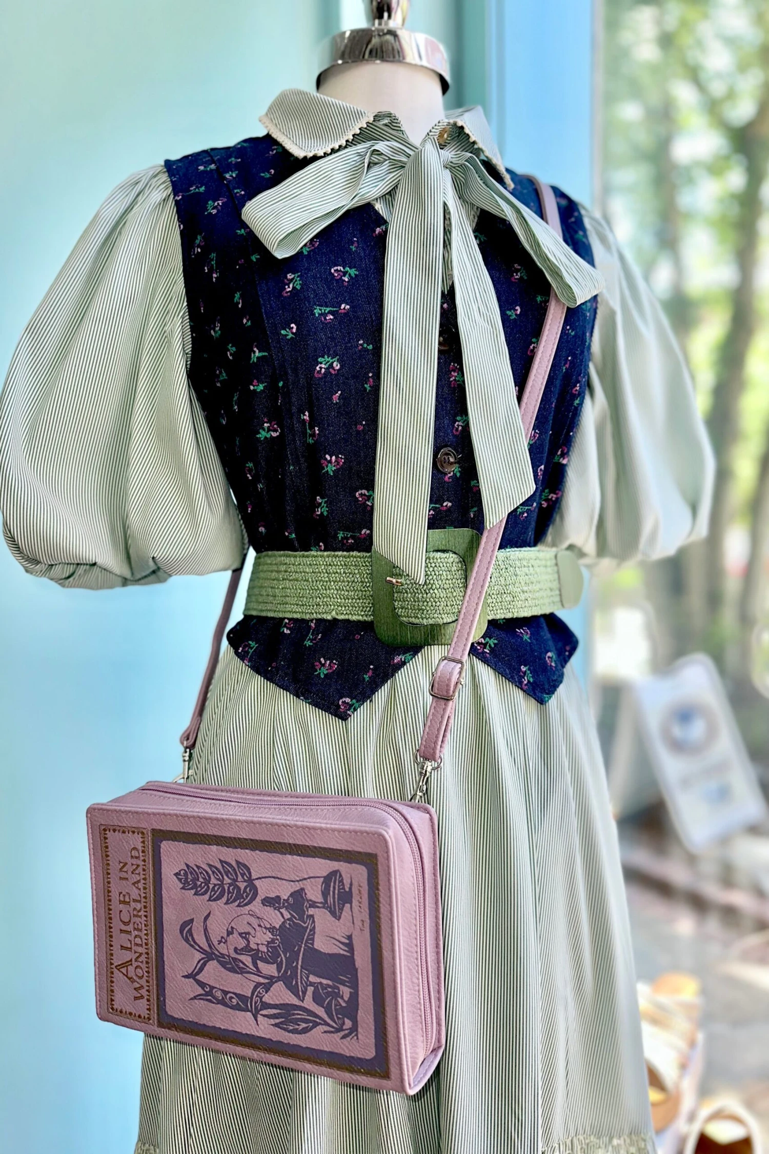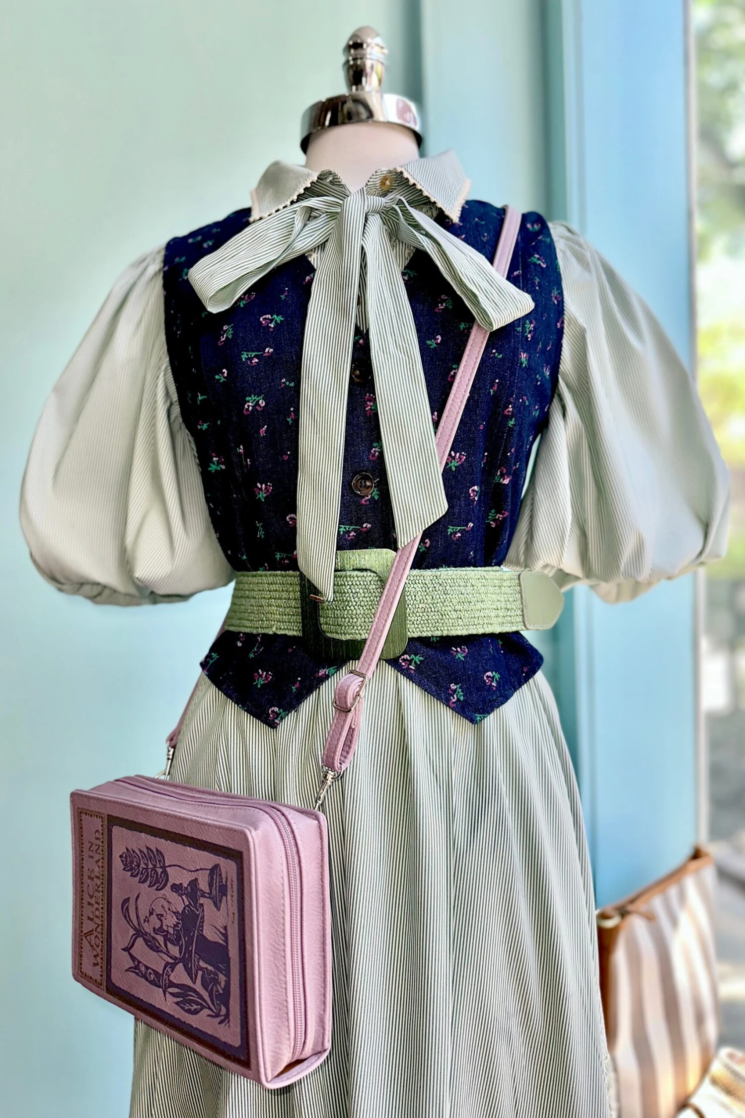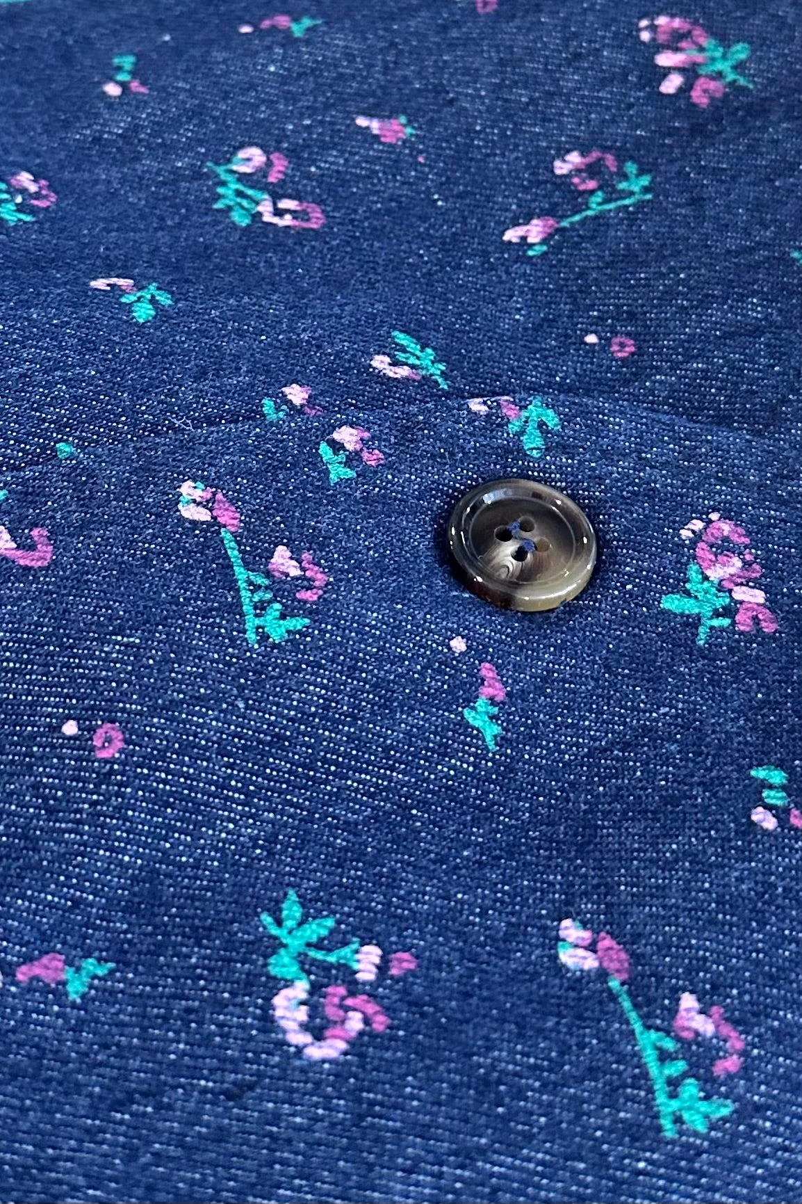 Denim V-neck vest with a pink ditsy floral print throughout. This vest is lined and has a summary front.