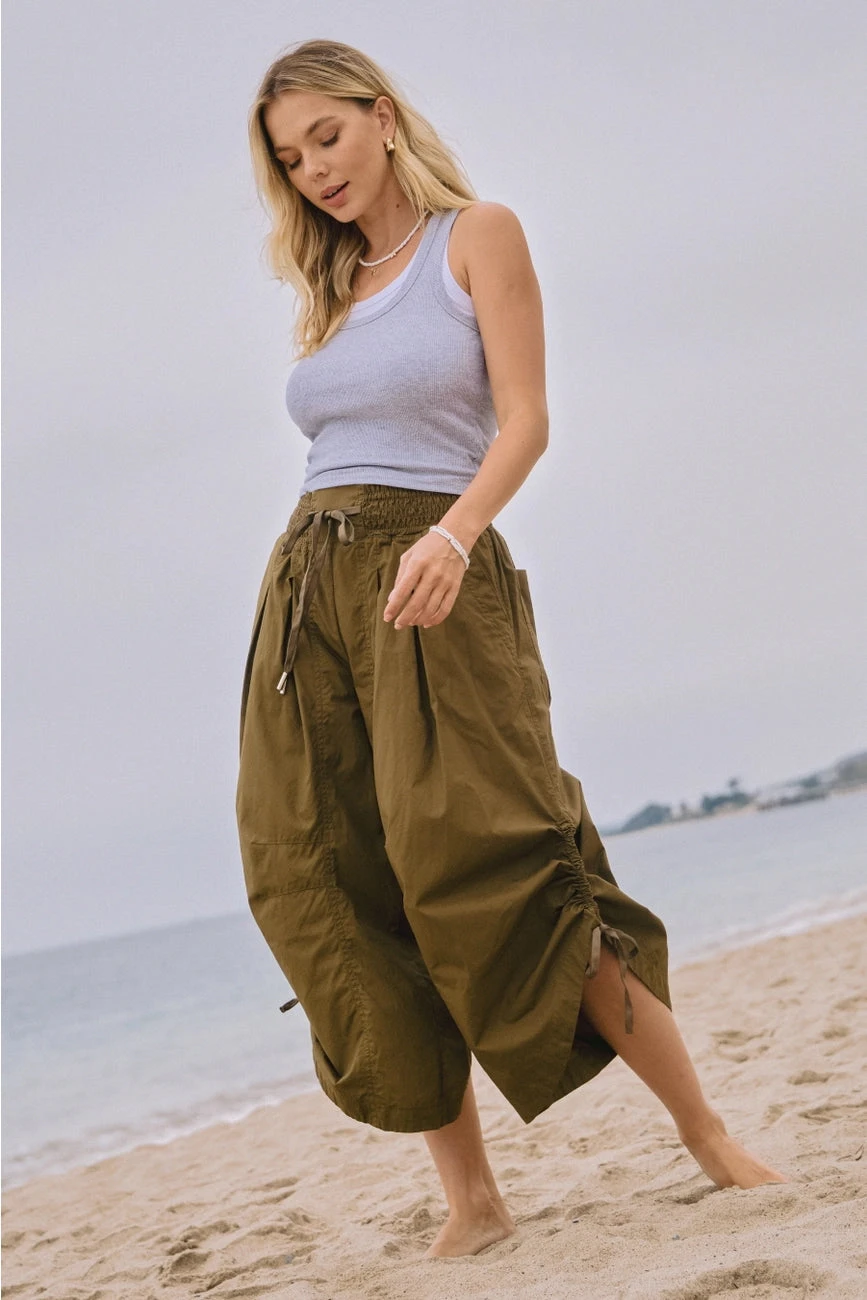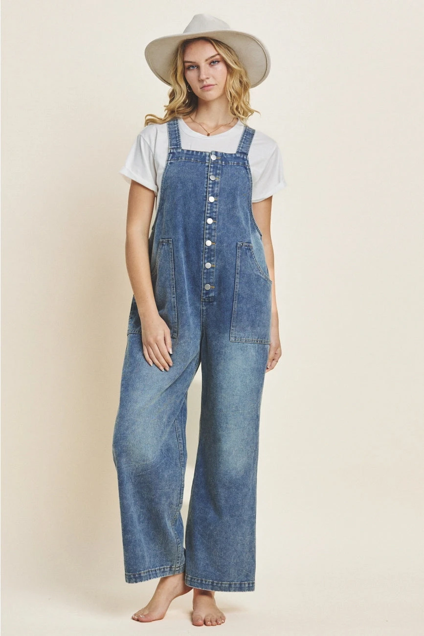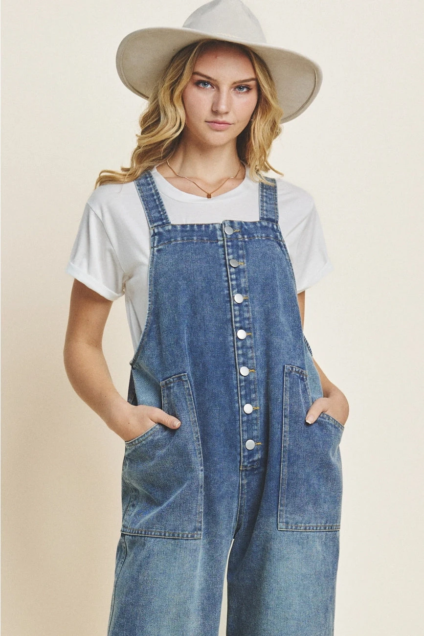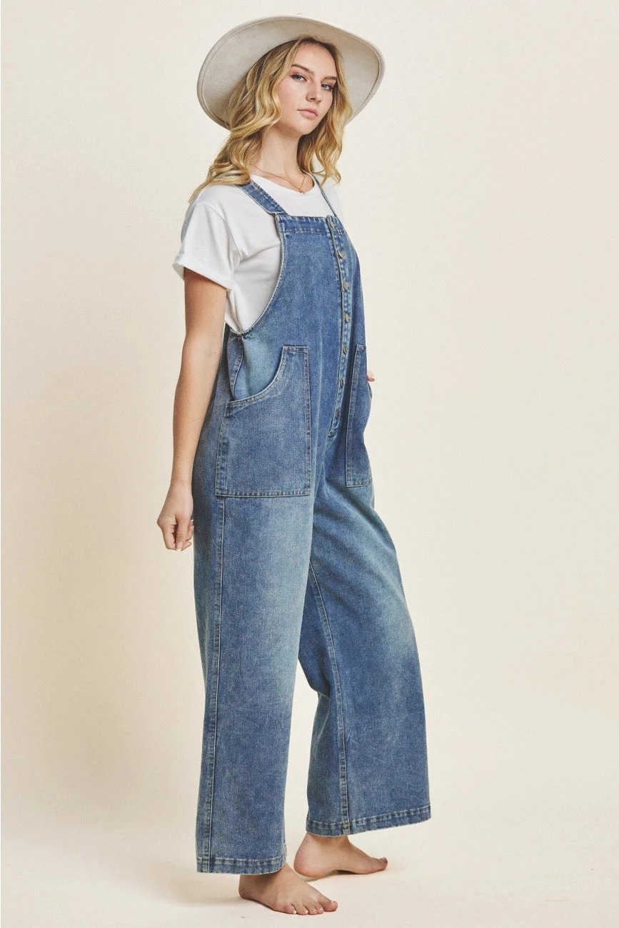 Denim overalls jumpsuit with adjustable straps and a summary front. The pants have a full wide leg and front pockets.