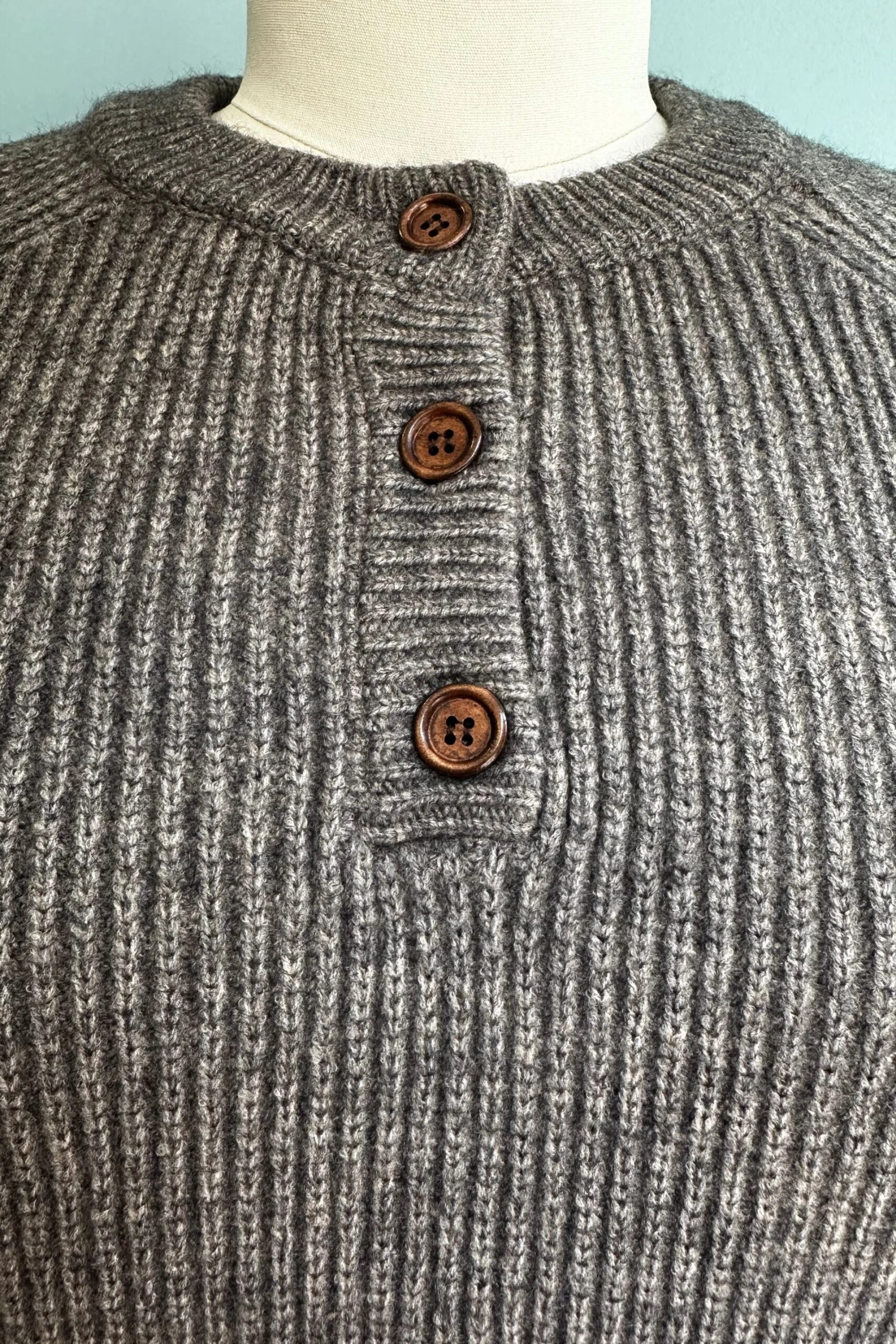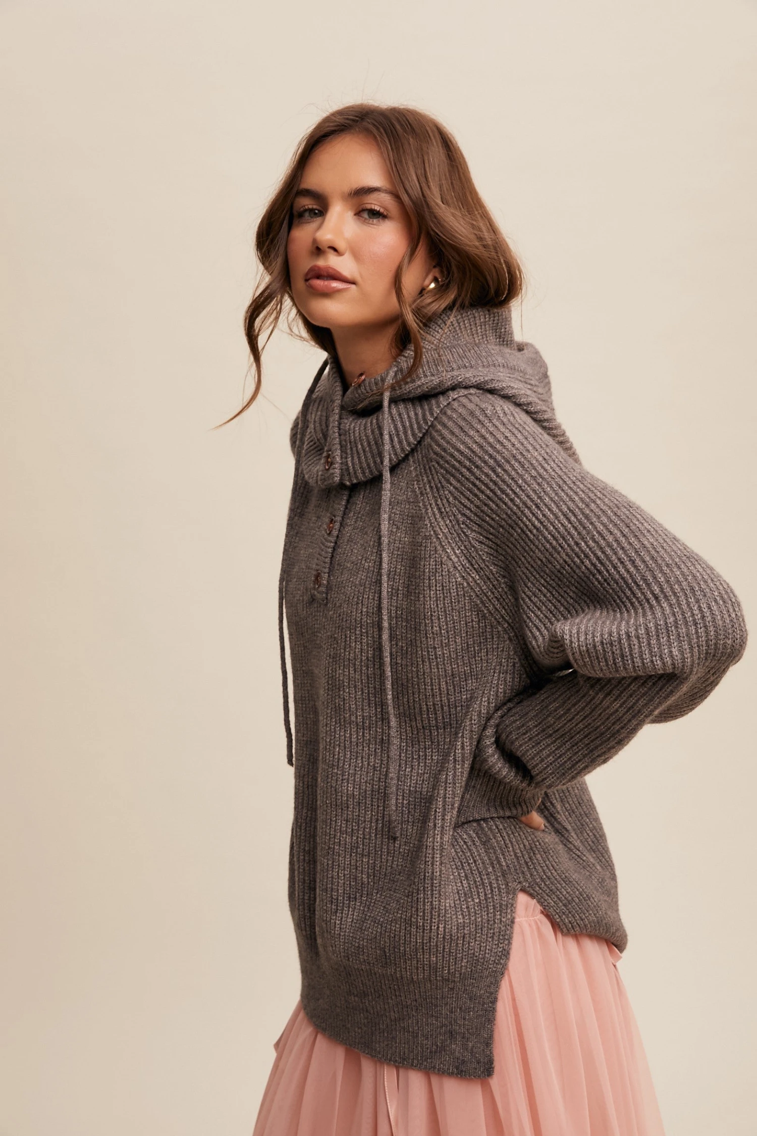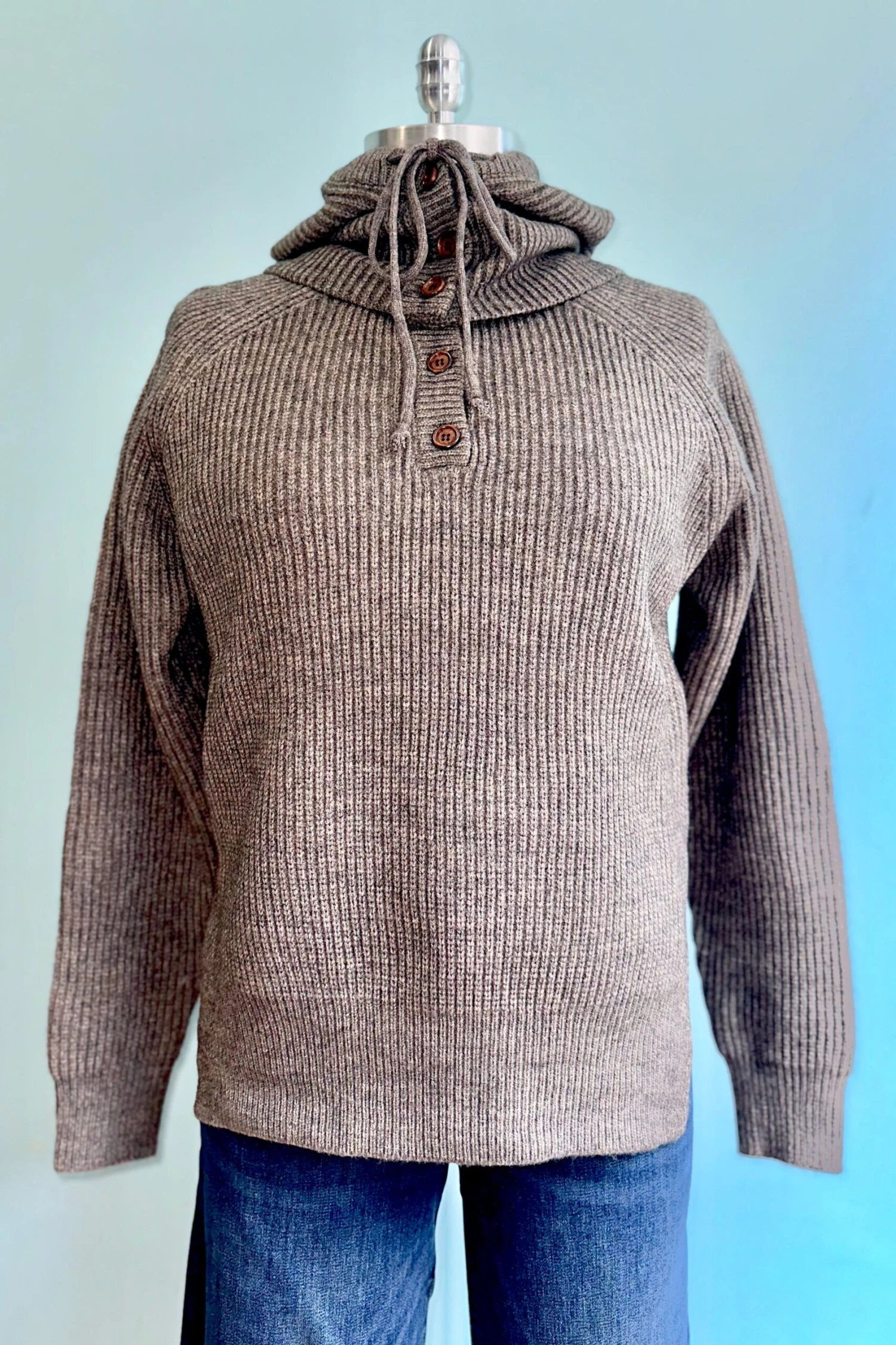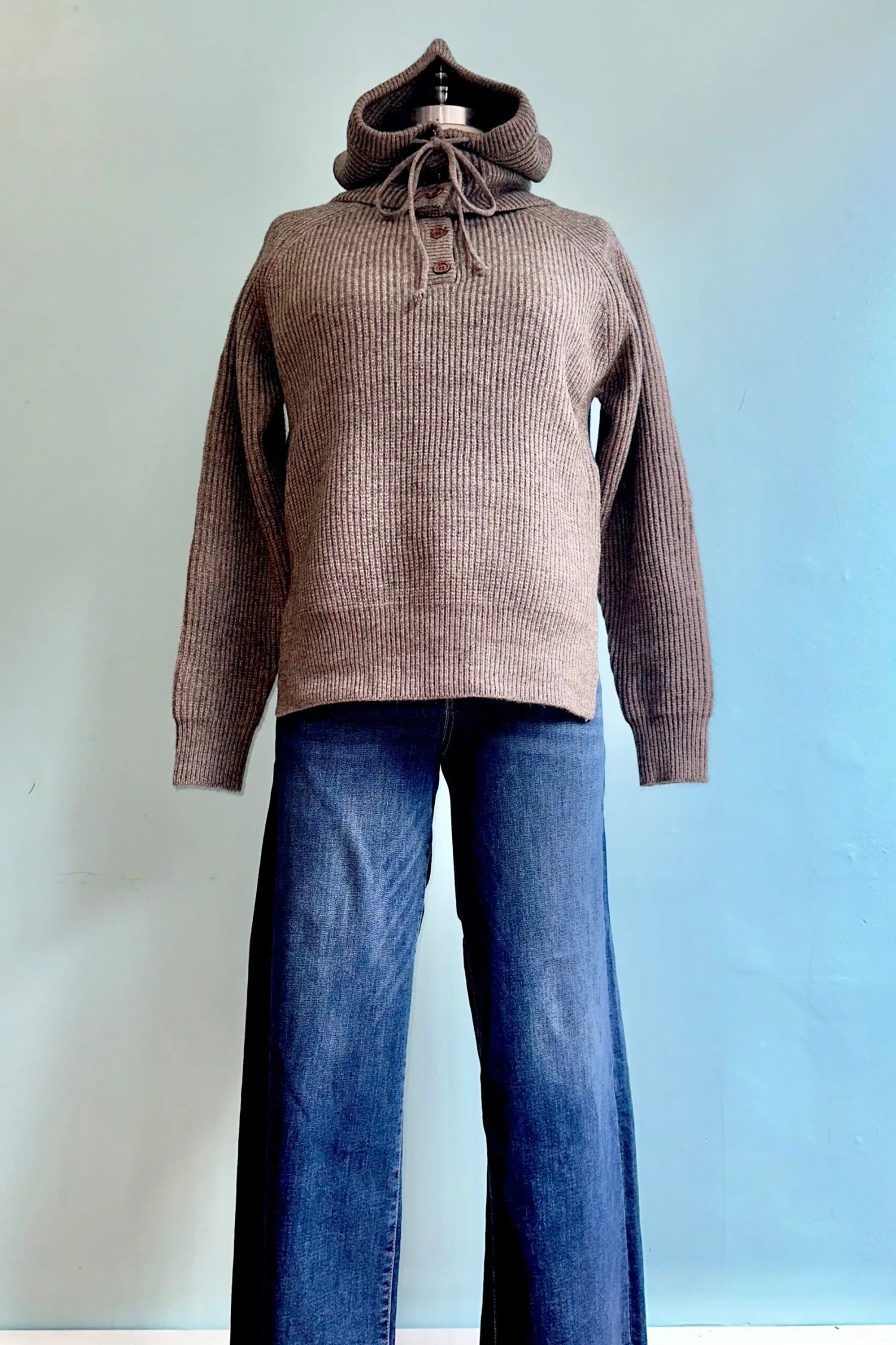 Pullover sweater in mocha with a summary neckline and a detachable summary front hood. This sweater has long sleeves and is a very relaxed cozy fit.