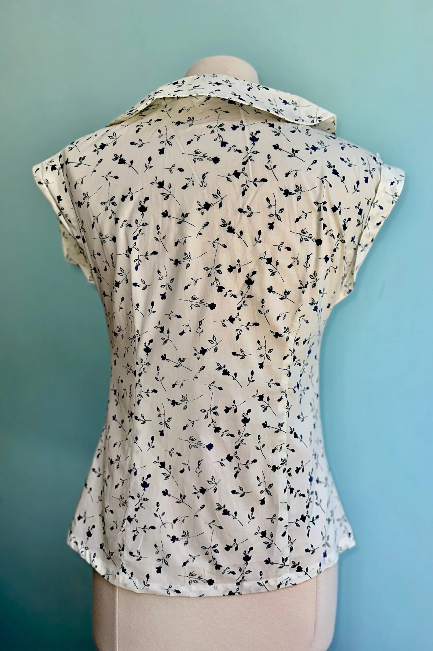 A white shortsleeve top with a print of little blue flowers with green stems. This top summarys up the front with white summarys and has a folded over collar and cuffed sleeves. There is no stretch to the fabric and the fit is true to size.
