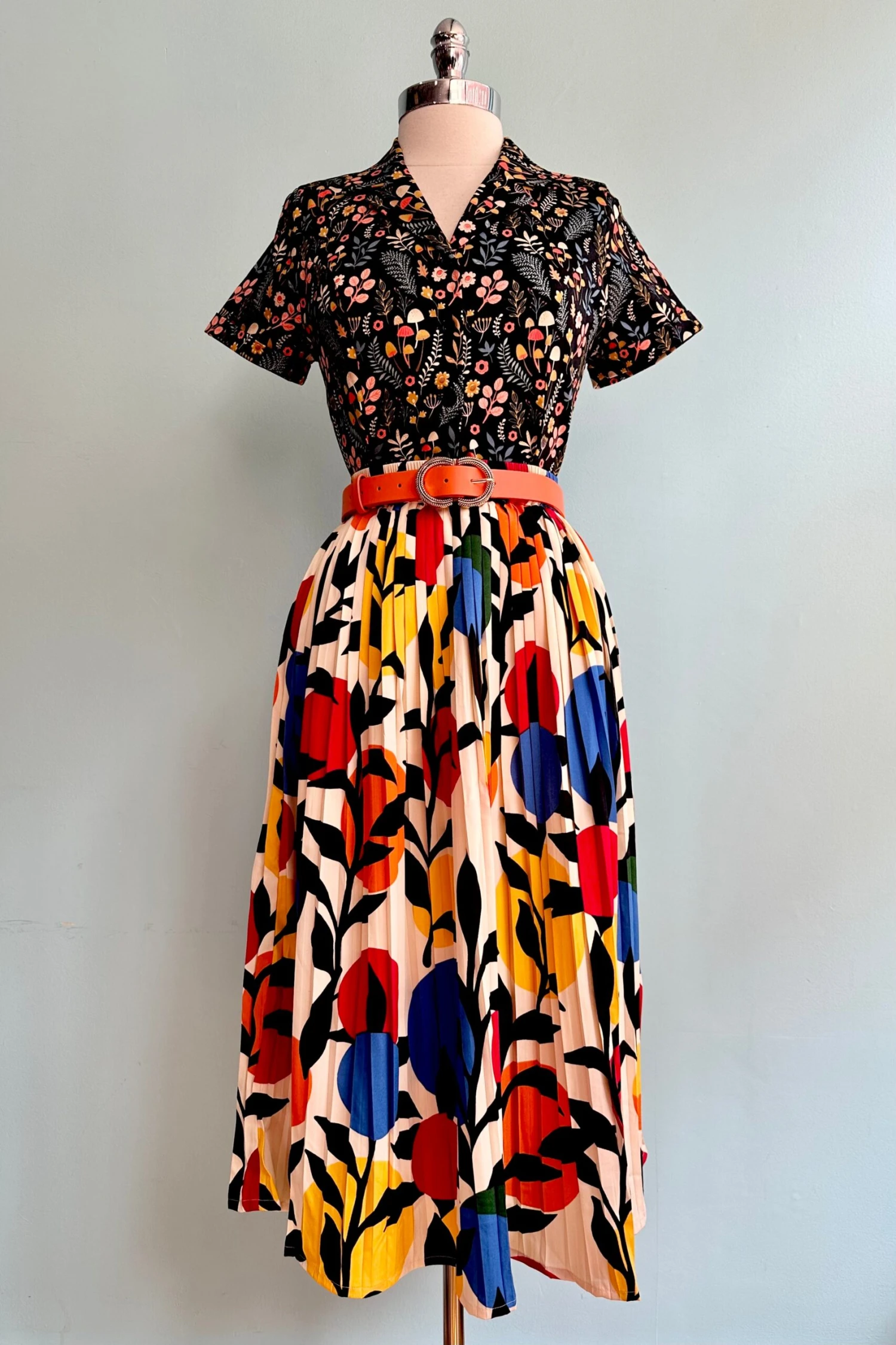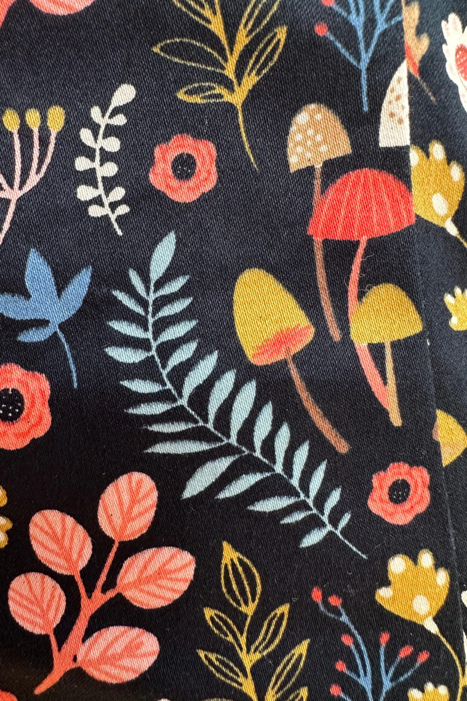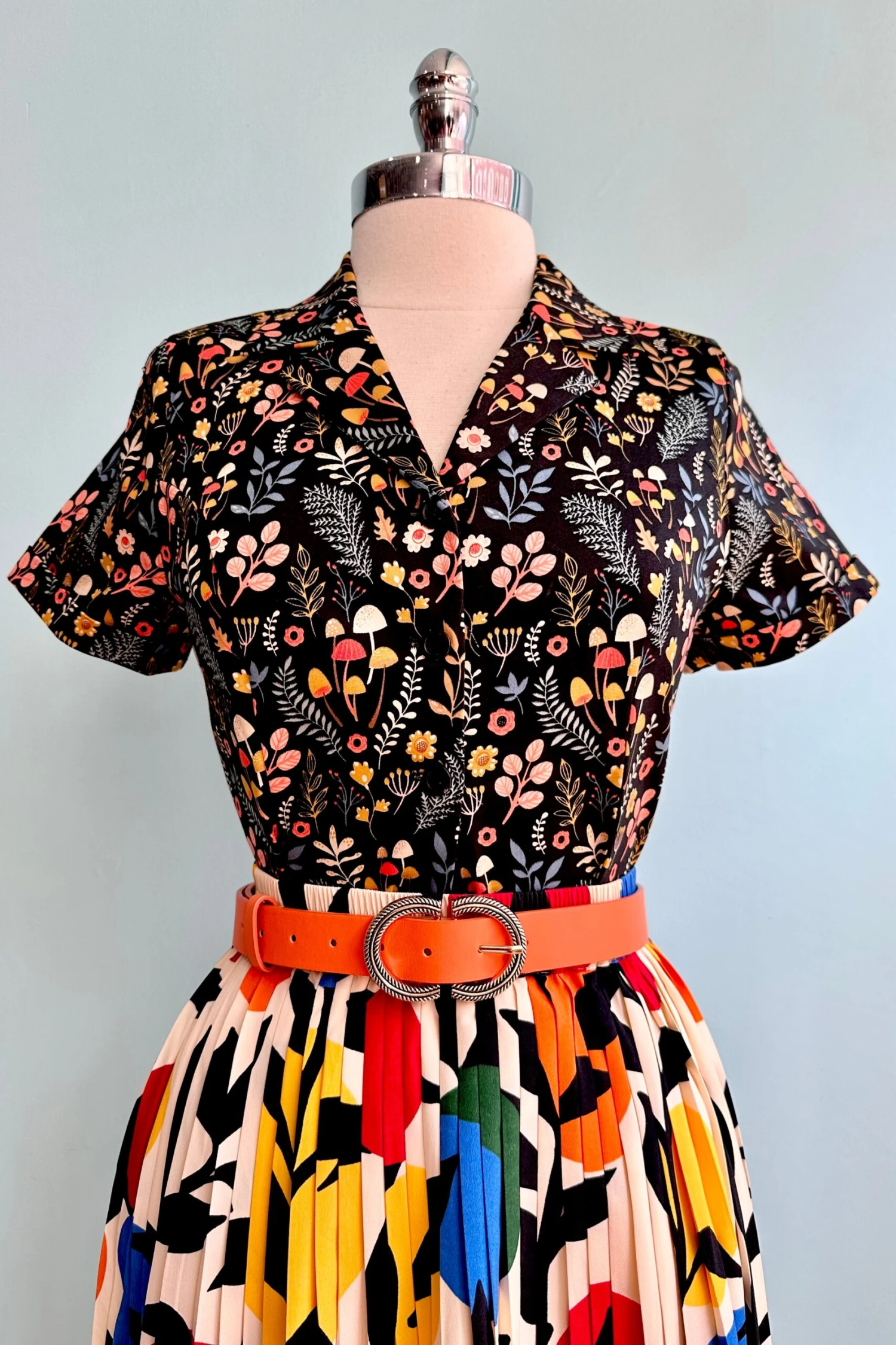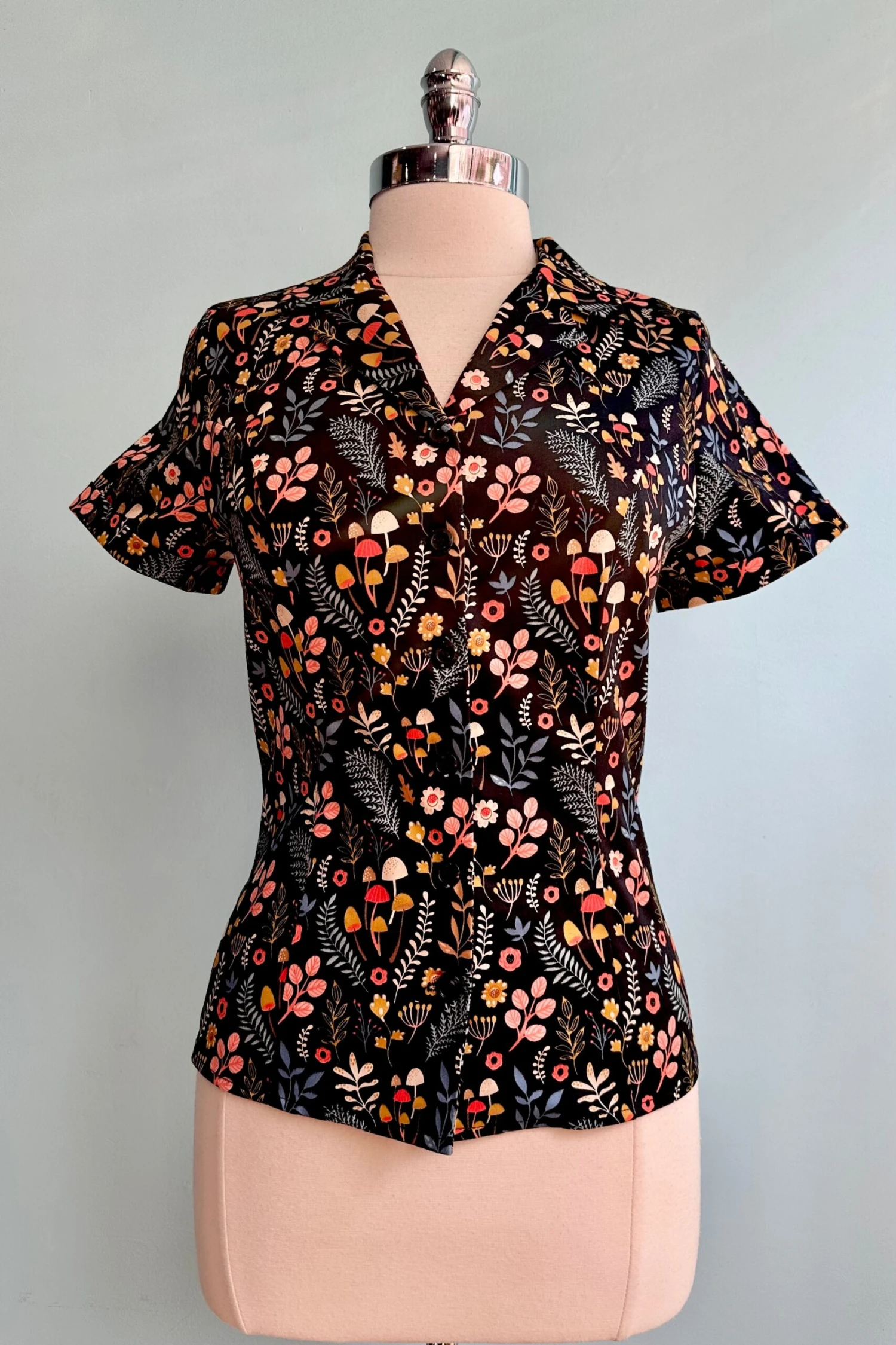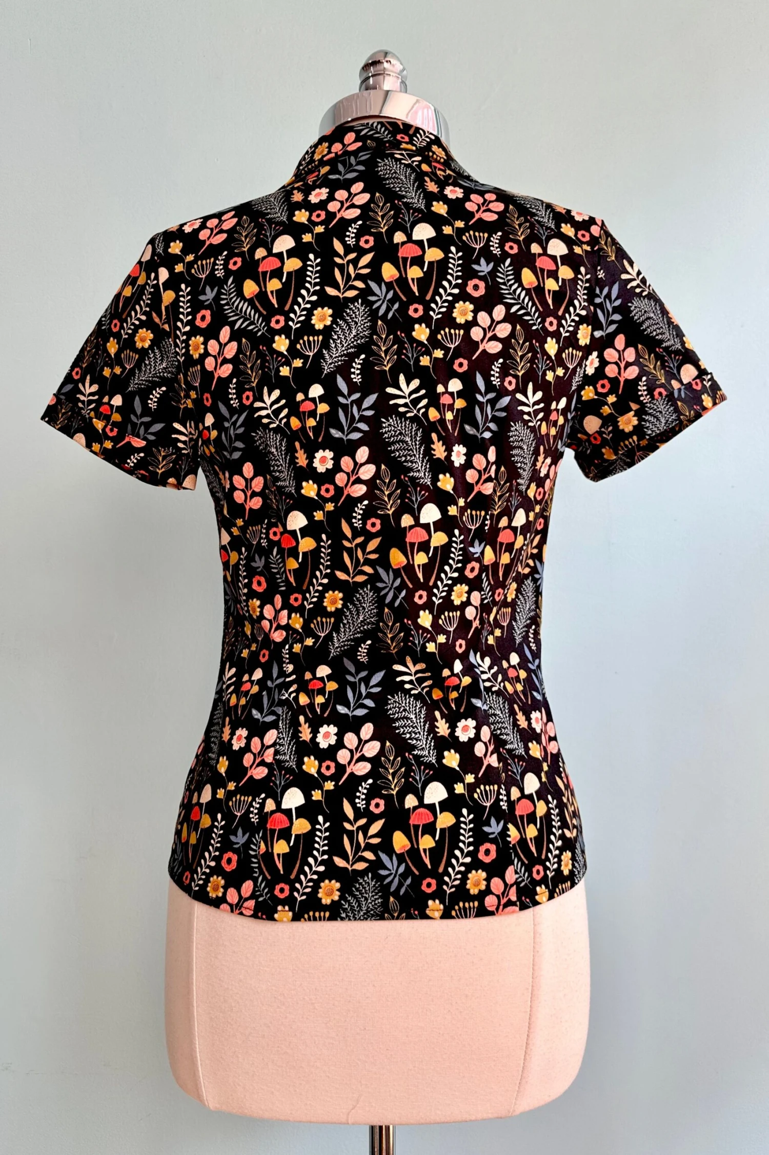 Short sleeve summary down top in our ditsy mushroom print. The fabric has a black background with a print of mushrooms flowers and leaves in peach, blue, orange white and gold. The sleeves are short and cuffed. The front summarys down and has a fold over collar.