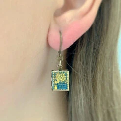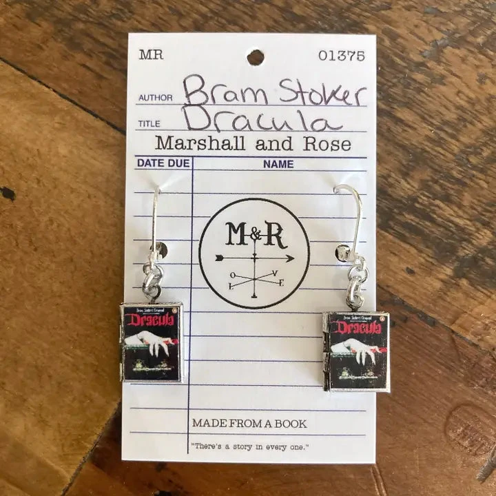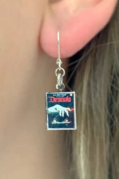 Book Locket earrings in Dracula! Our new book locket earrings are made with nickel free materials and feature the most beloved classic and modern books! They are on lever back style backers and are sealed with a gloss finish for durability. Each little locket measures about 1/2 long and 3/8 wide and is a little less than 1 1/2 inch long while wearing them.