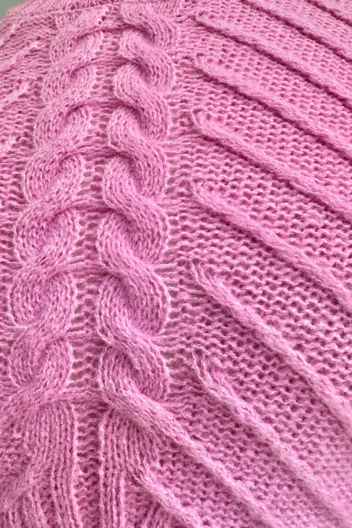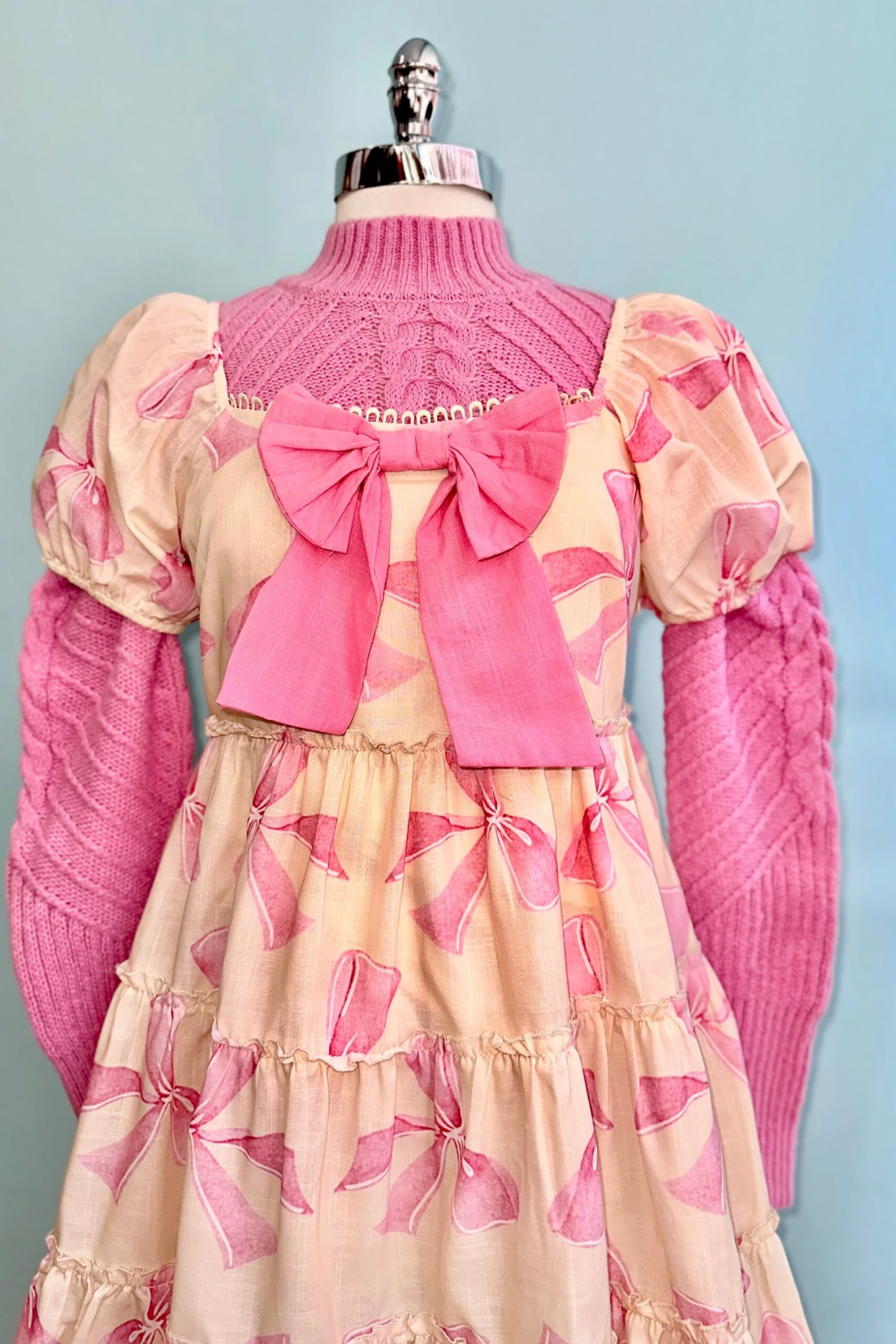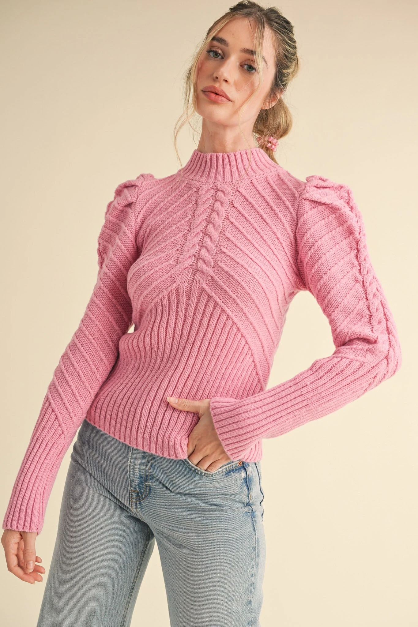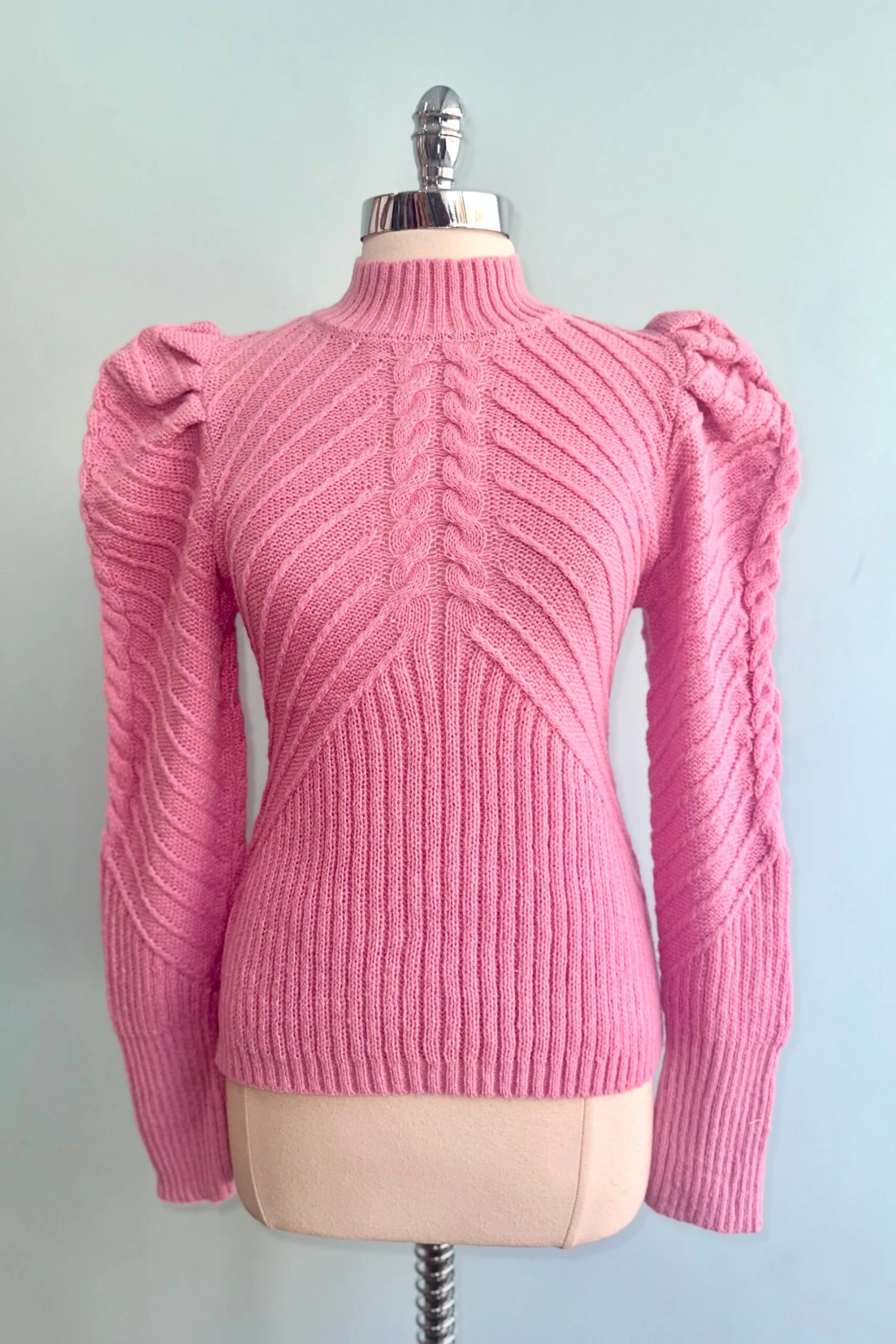 Dusty pink pullover sweater with a mock neck and big puff shoulders. This sweater has long sleeves, different textures throughout the knit and has a below the waistline length.