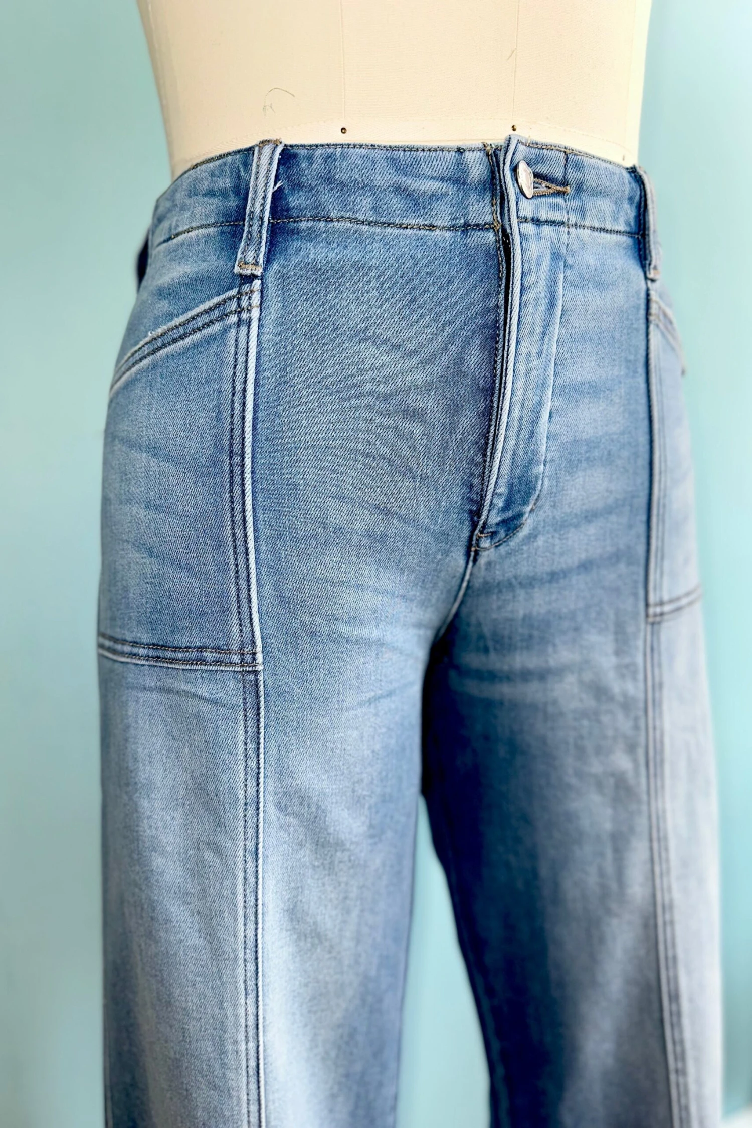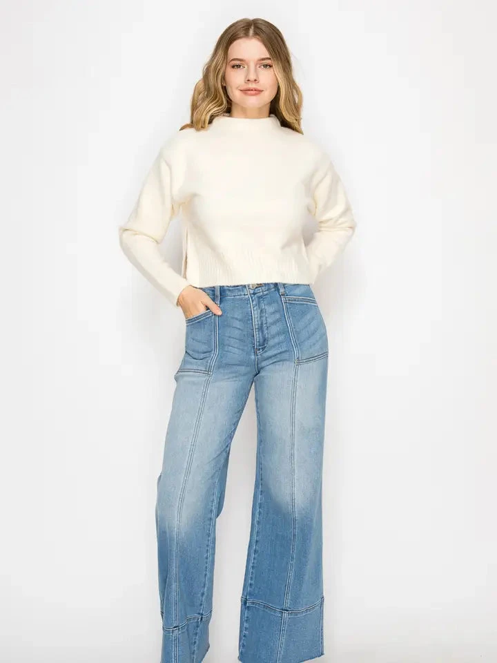 Designed with a supportive waistband that smooths and shapes your midsection for a flattering fit and made of an eco friendly fabric. These jeans are a medium stone wash with a palazzo leg, high waist, and a raw hem.