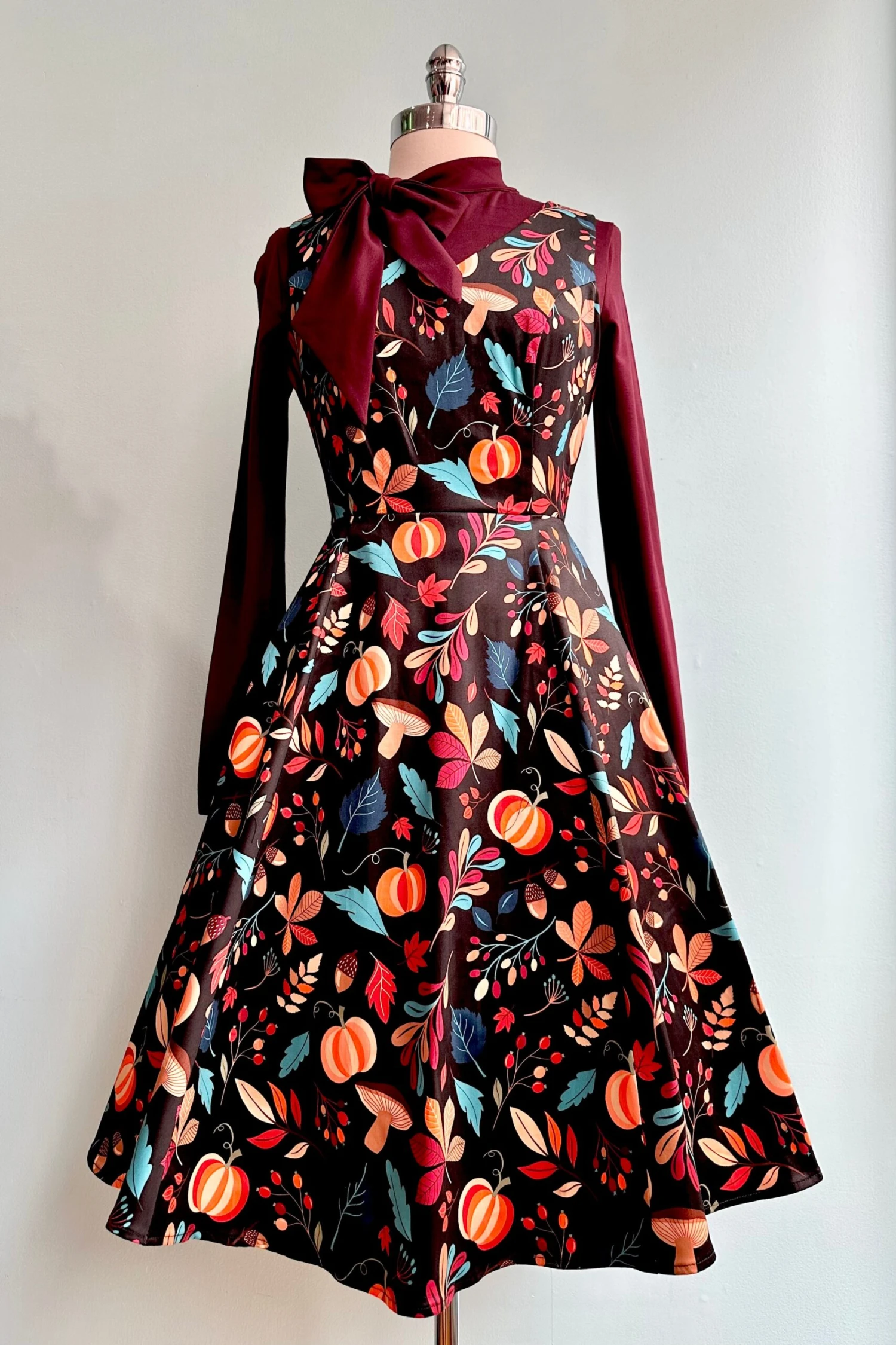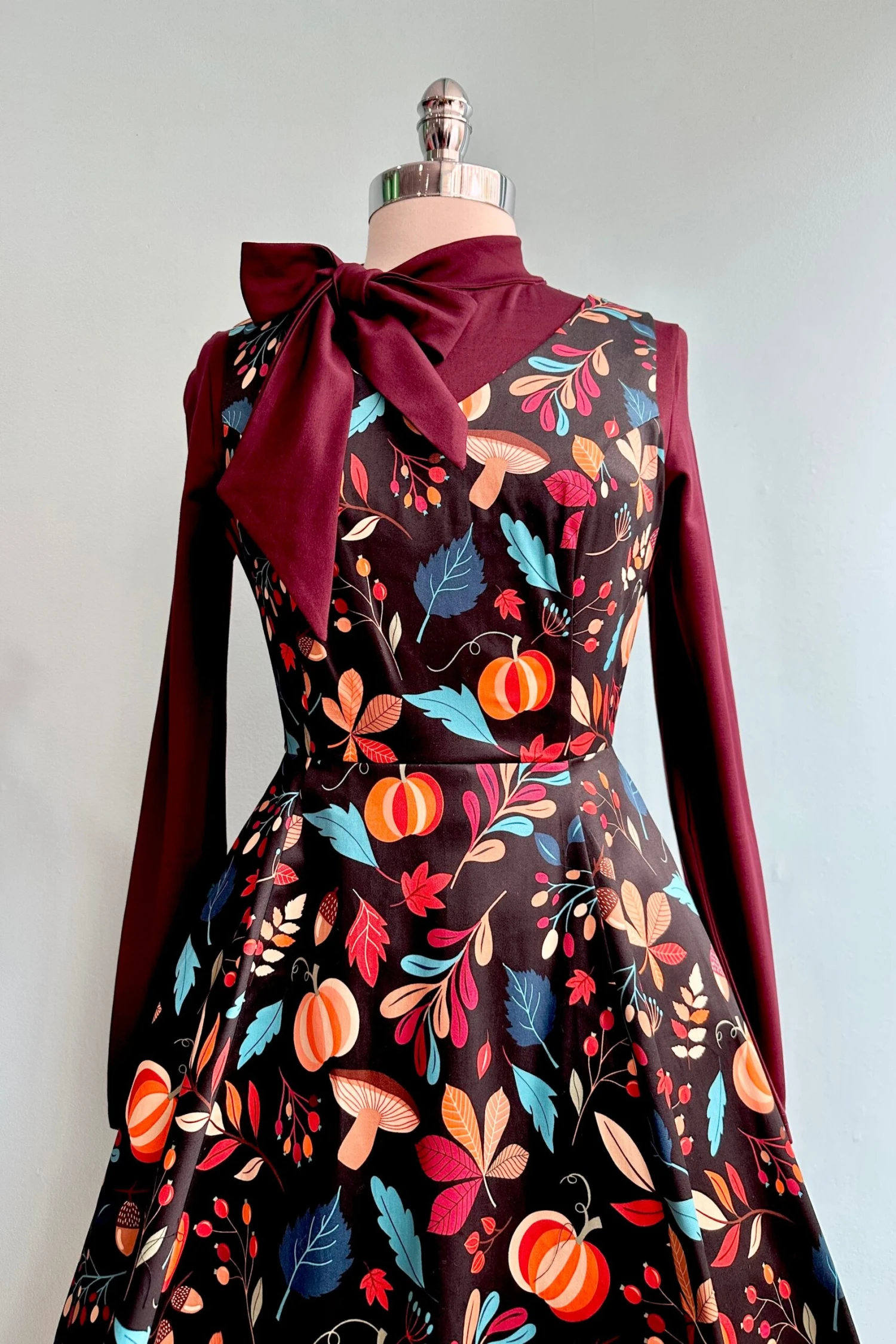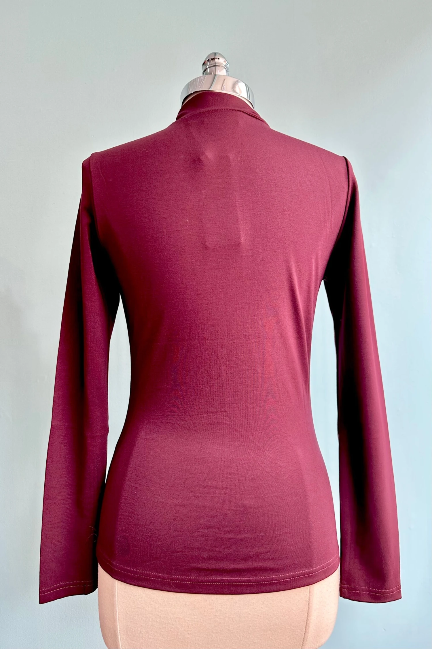 Eggplant purple fitted jersey tie neck top with long sleeves and a high neckline.