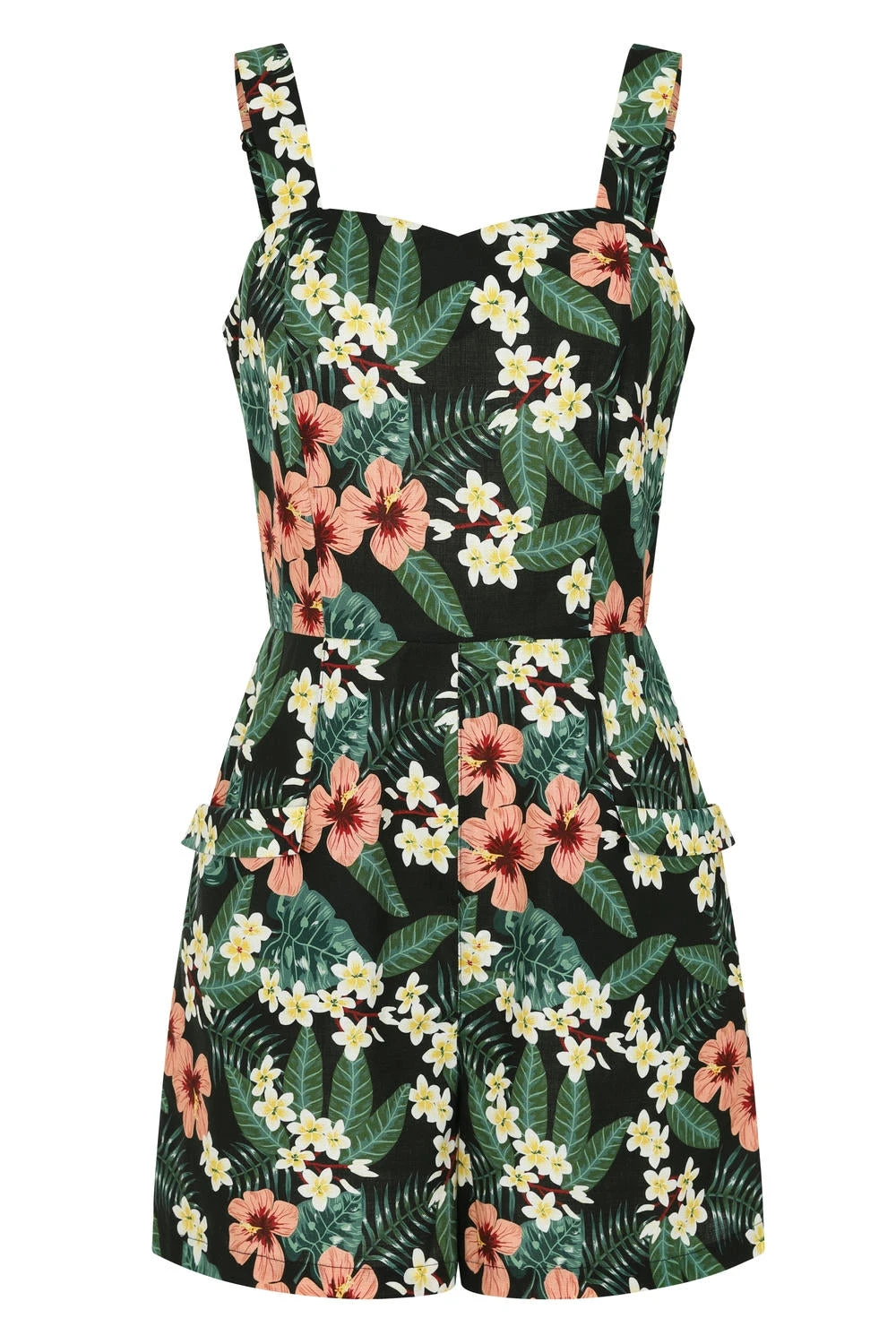 Black romper with a print of green tropical leaves with peach and white flowers. This romper has adjustable shoulder straps, a sweetheart neckline and side pockets. There is a back zip closure.