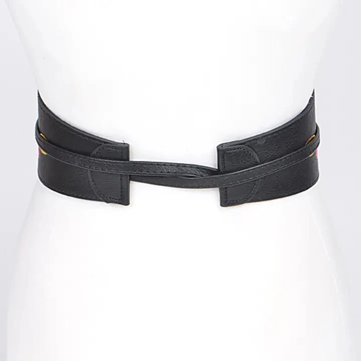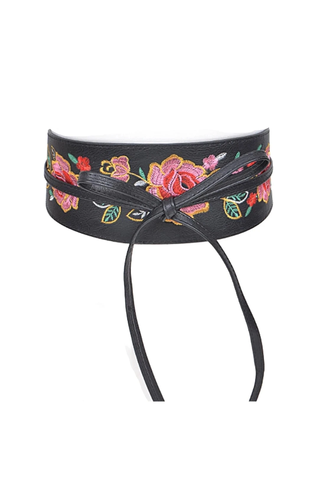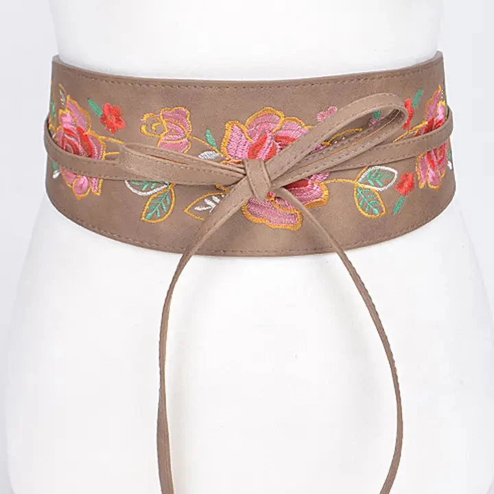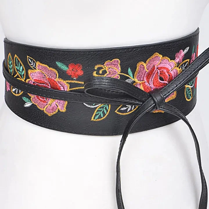Wrap belt with embroidered flowers in pink, red, green, and yellow on the front. This belt has long straps making it great for many sizes!
