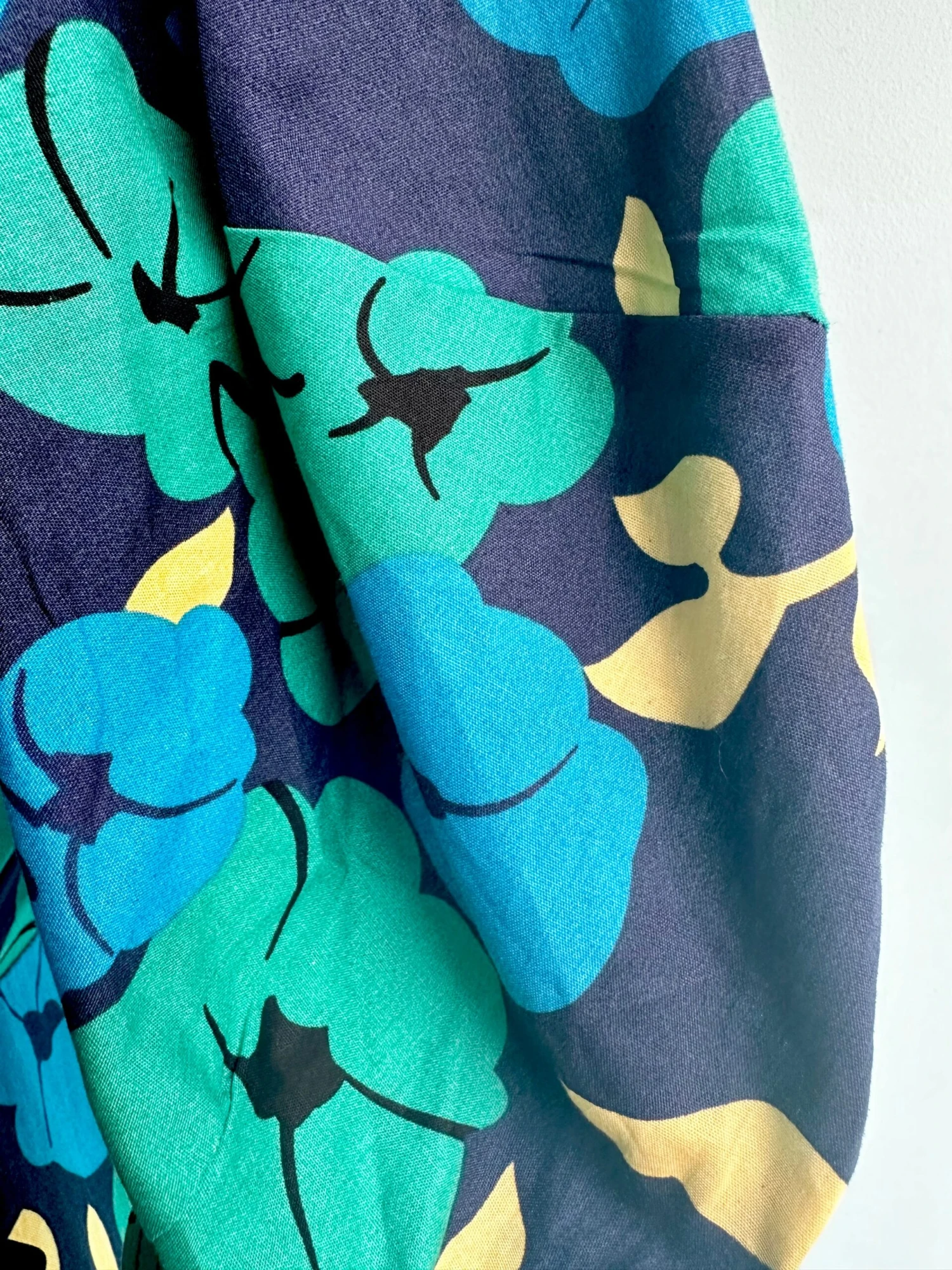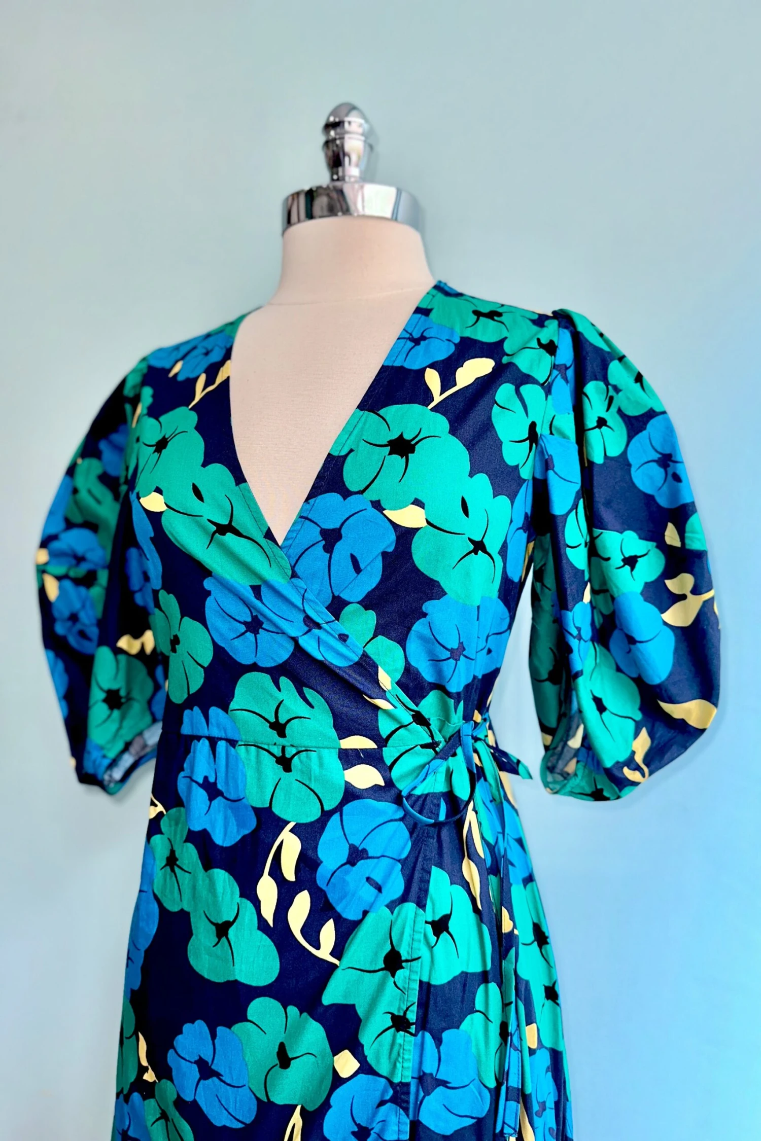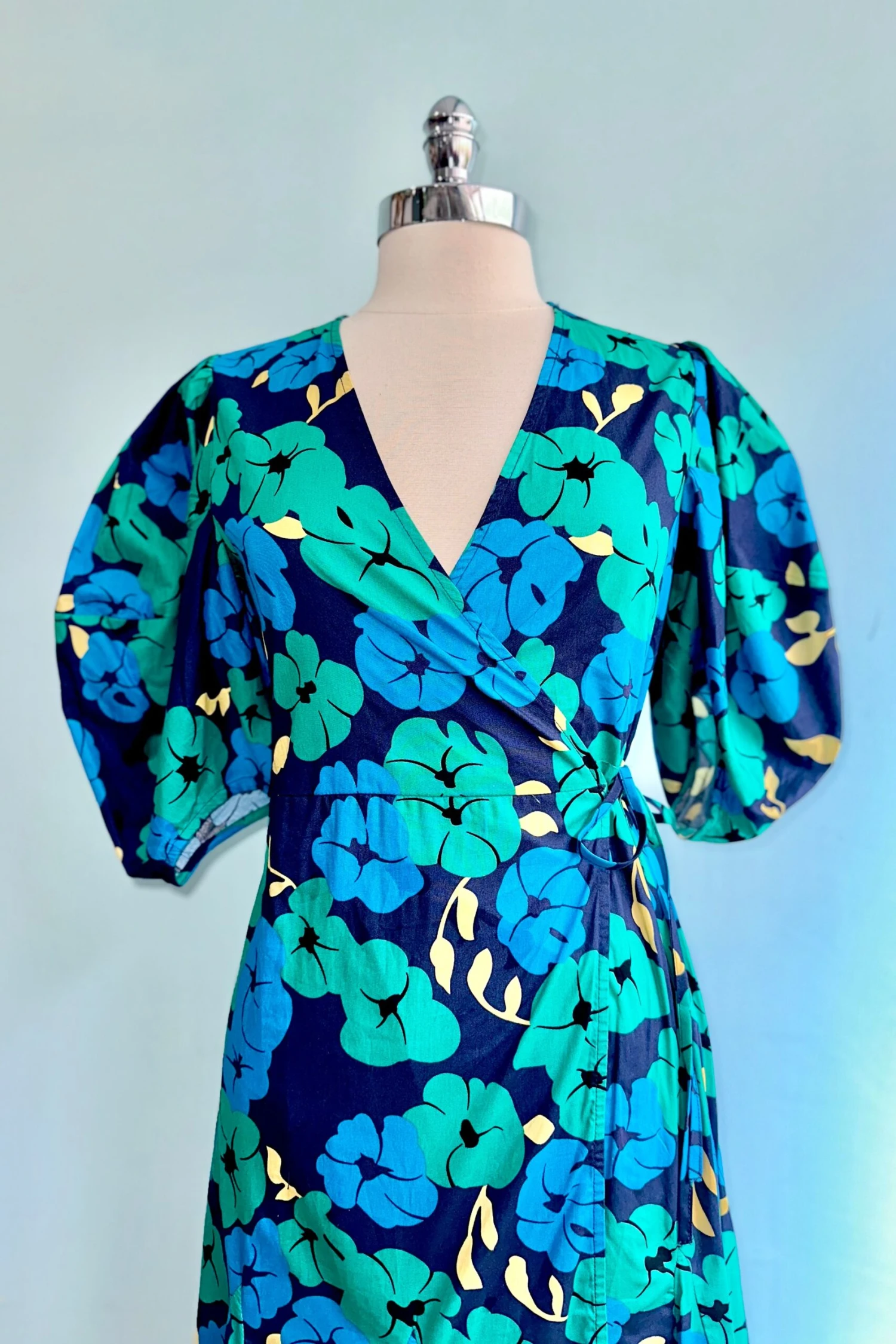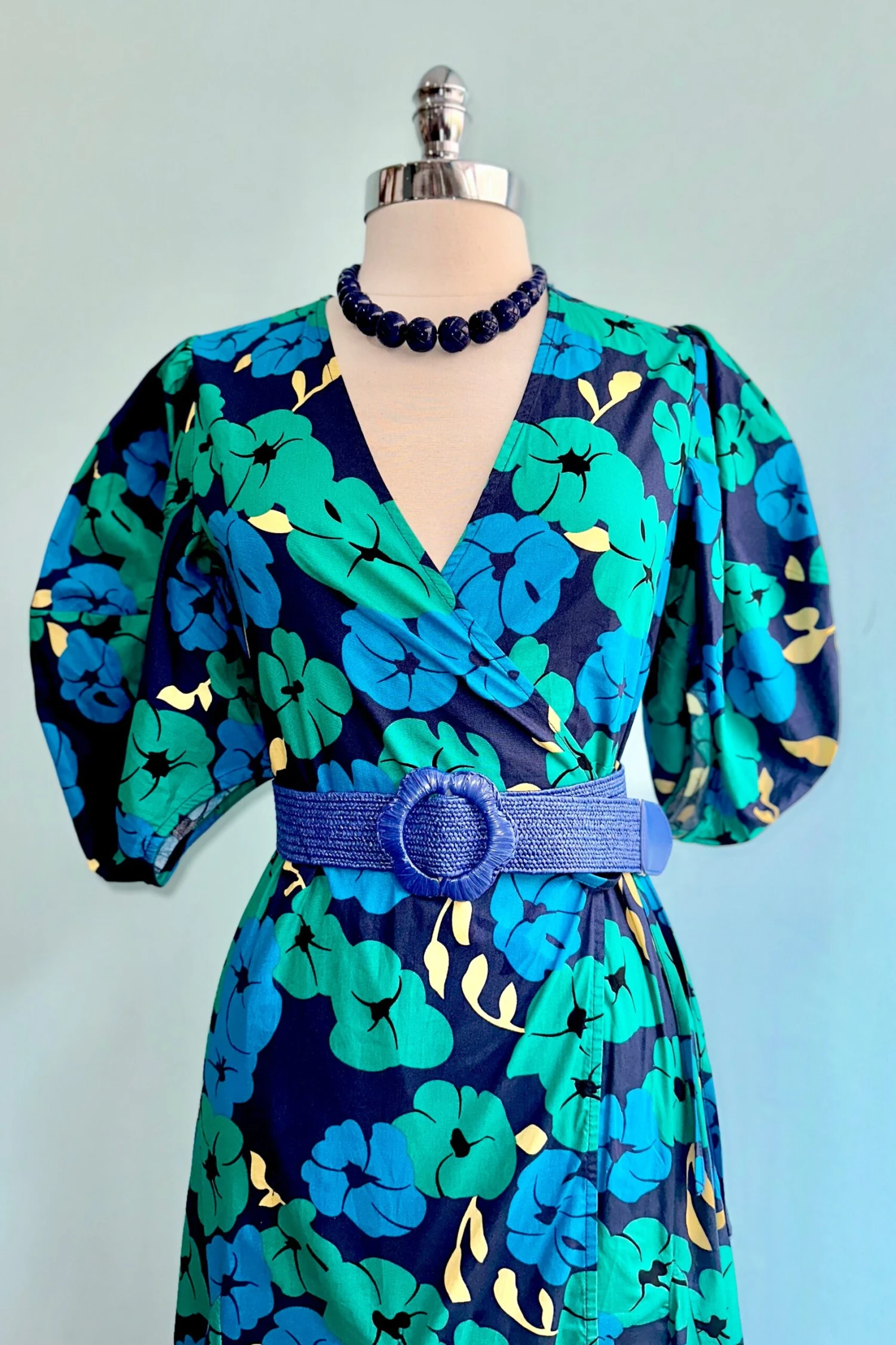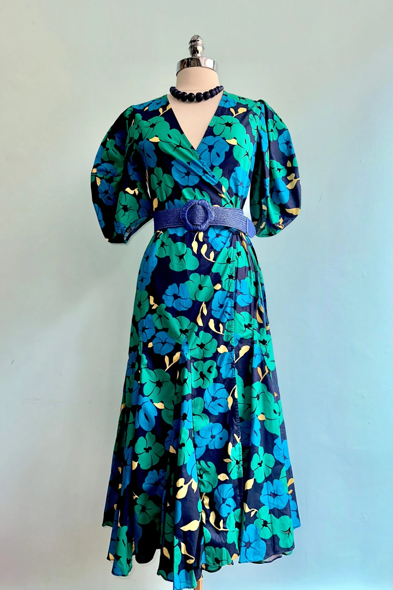 Cotton wrap dress in navy with large emerald and blue flowers. This dress has large, elbow length balloon sleeves and an A-line skirt. This is a true wrap with tie to fasten.
