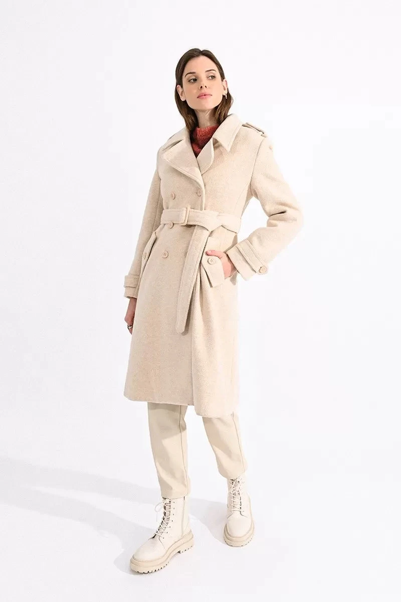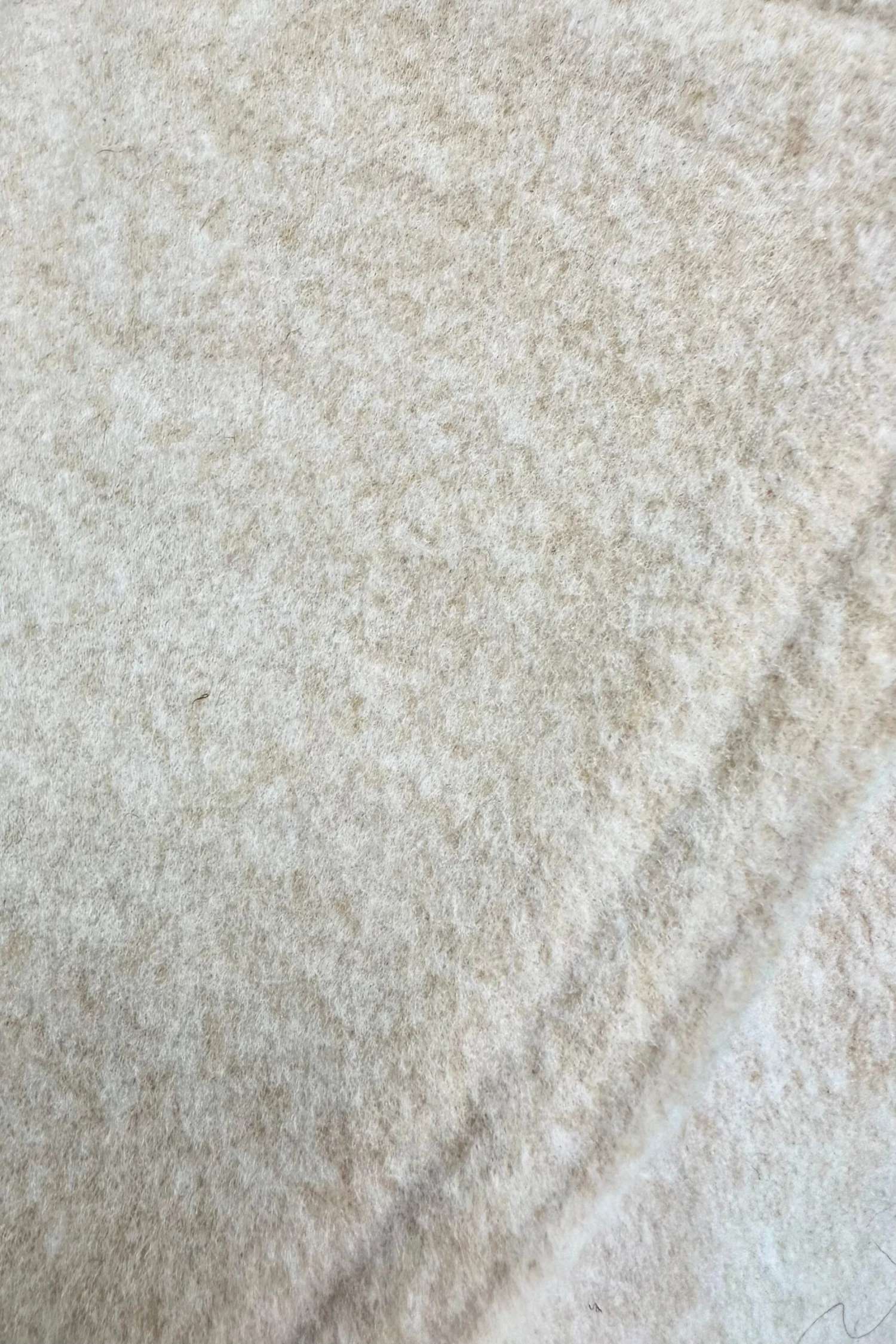 Beige heavy felt coat with a double breasted bodice. This coat is fully lined in satin for easy on and off. The fabric is a heavy felt, very cozy and warm. The neckline has a wide fold over collar and shoulder epaulettes. The waist can be cinched in with the coordinating belt. The arms are roomy which are great for movement.