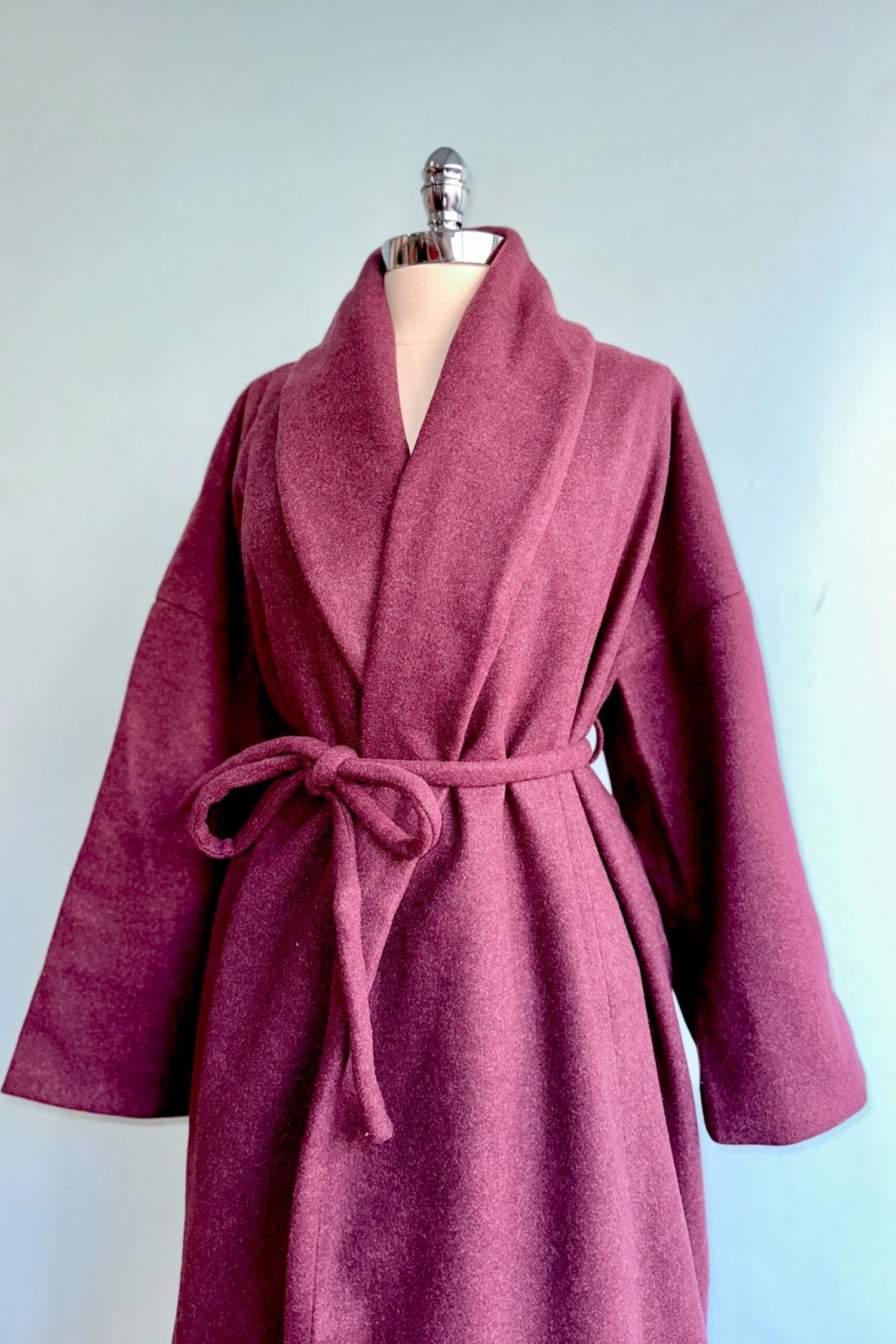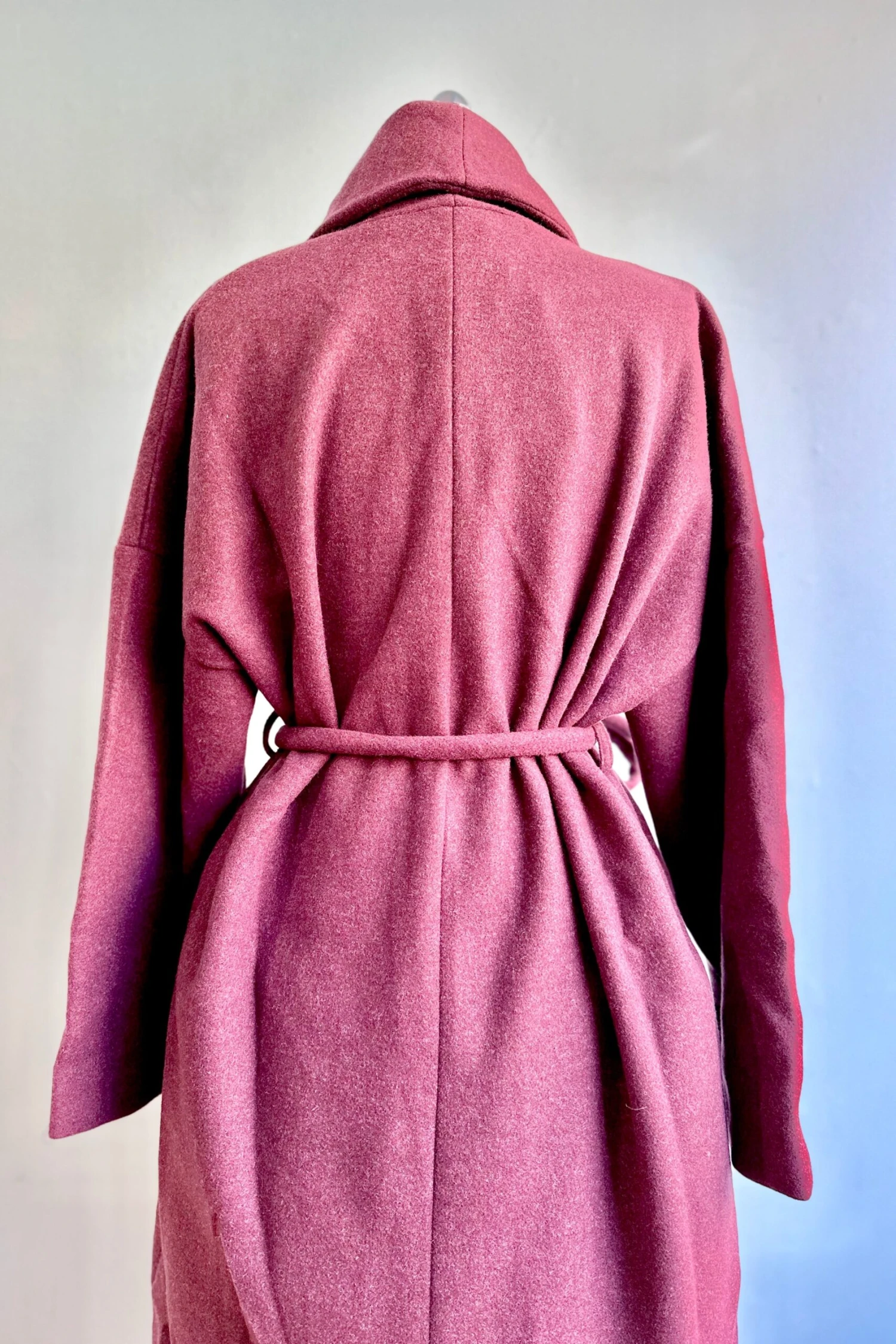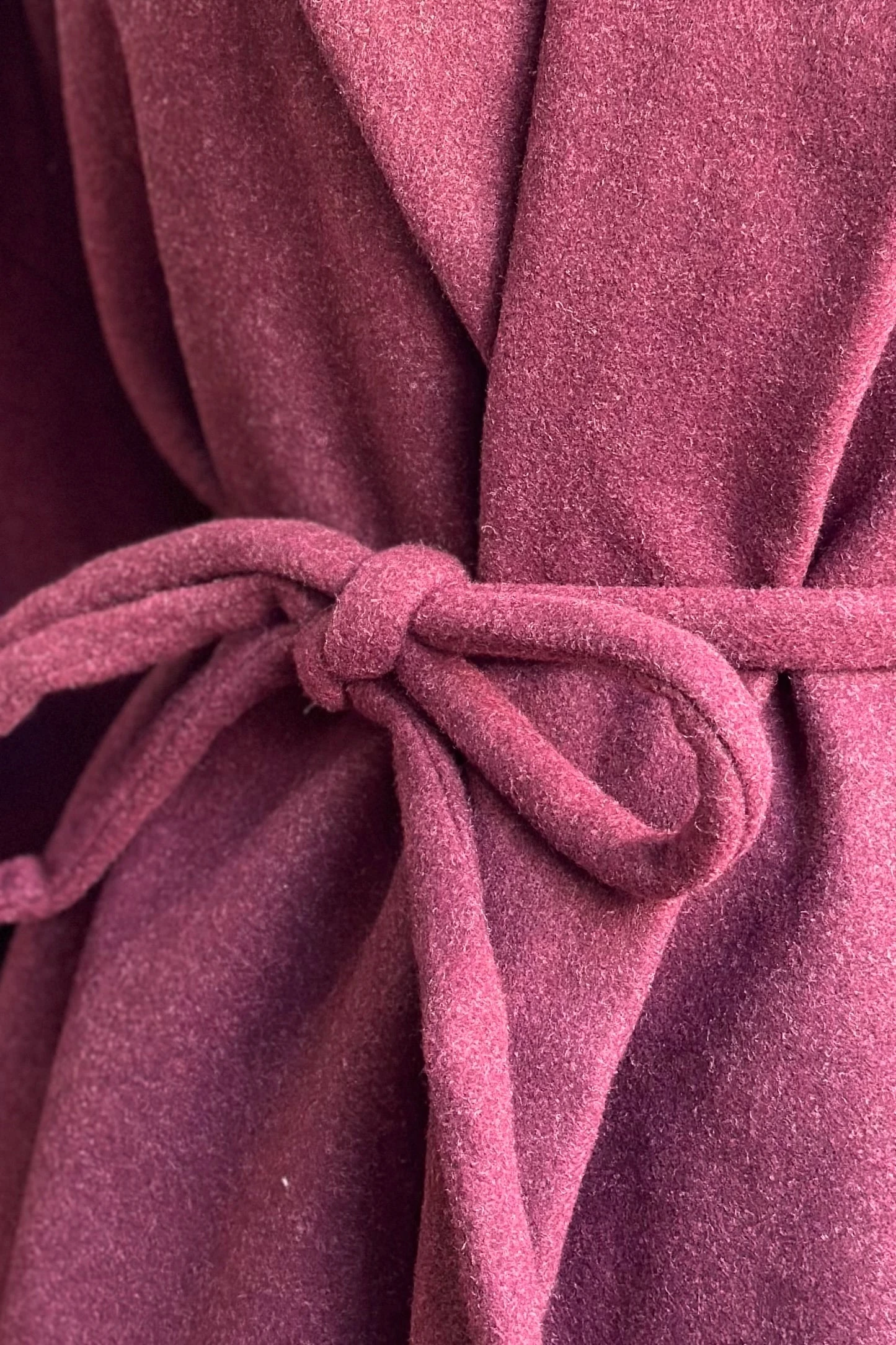 Soft felted wrap coat with a shawl collar in burgundy. This coat has a tie fastener at the waist and side pockets. Lined in satin. Generously sized. Fabulous fall coat!