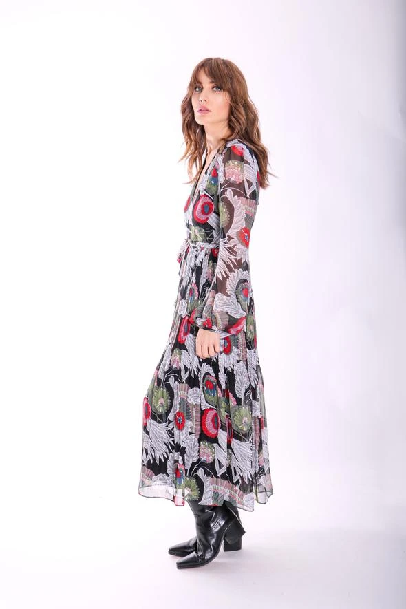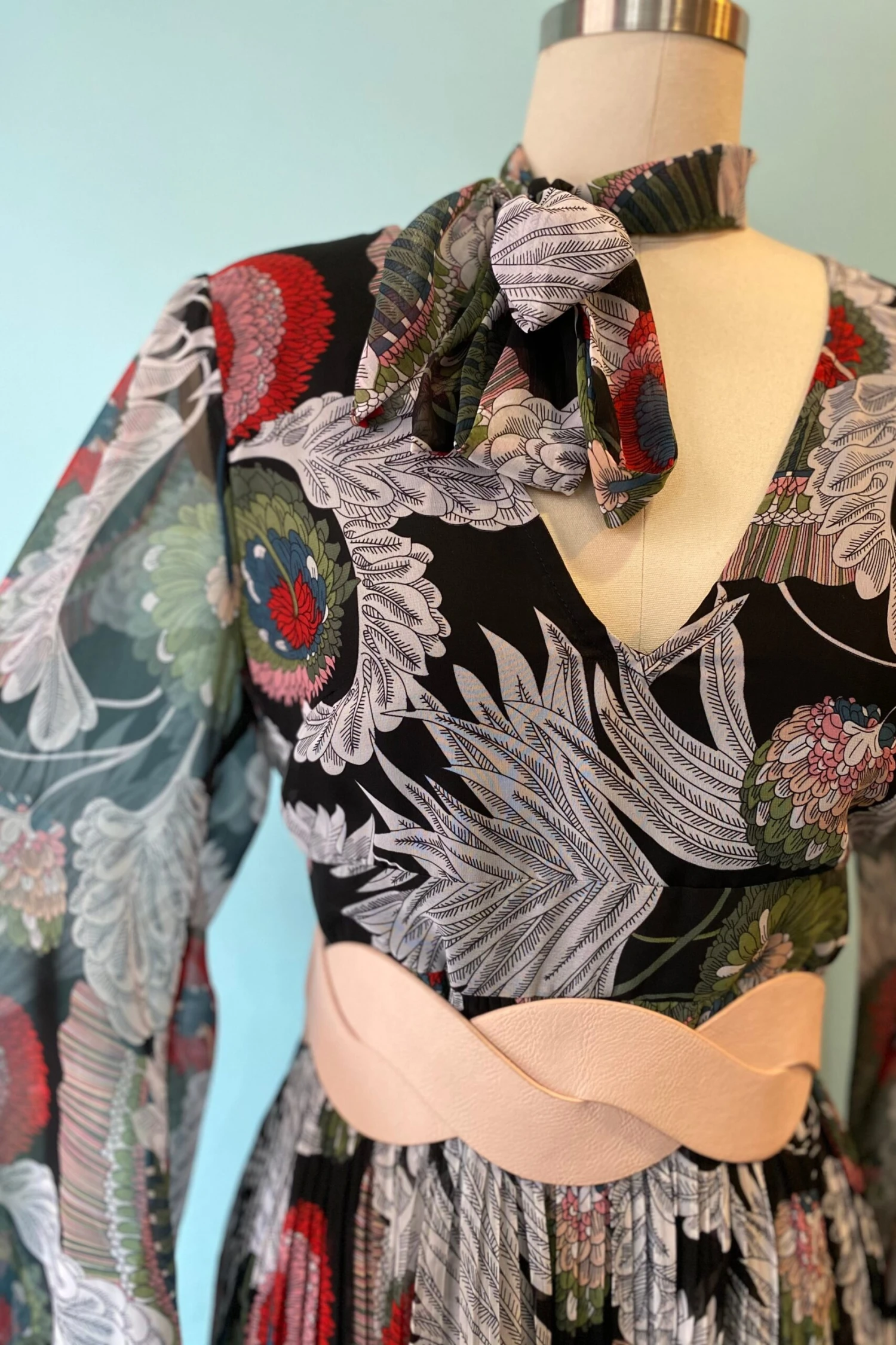 We adore the laid-back yet formal vibes of the fathomless dress! Decorated in wisteria blooms, this chiffon style is cut to an effortless long-sleeved silhouette that falls from the v-neck bust to a pleated calf-grazing hem. This style zips up the side, is un-lined, and does not have pockets.