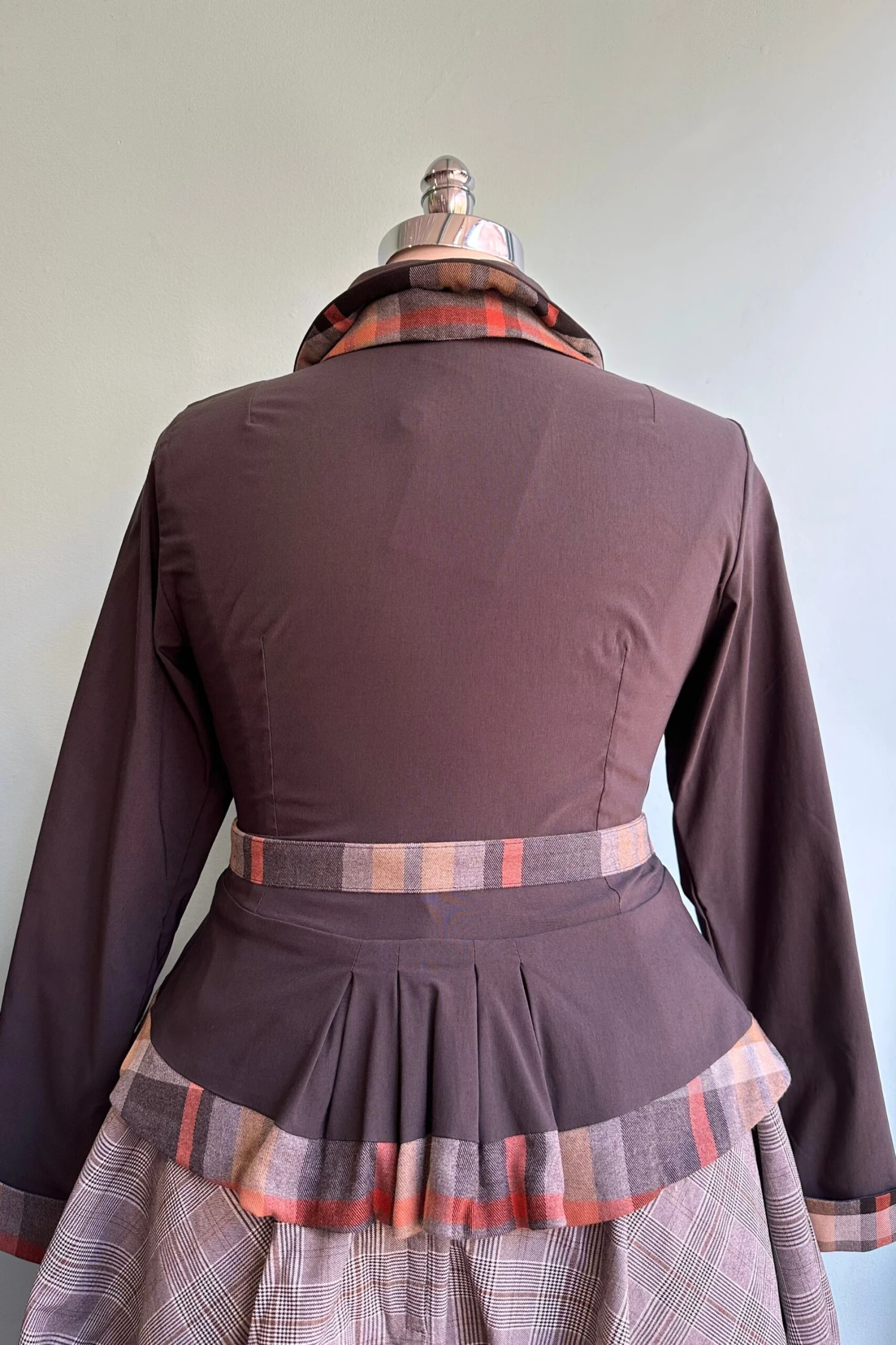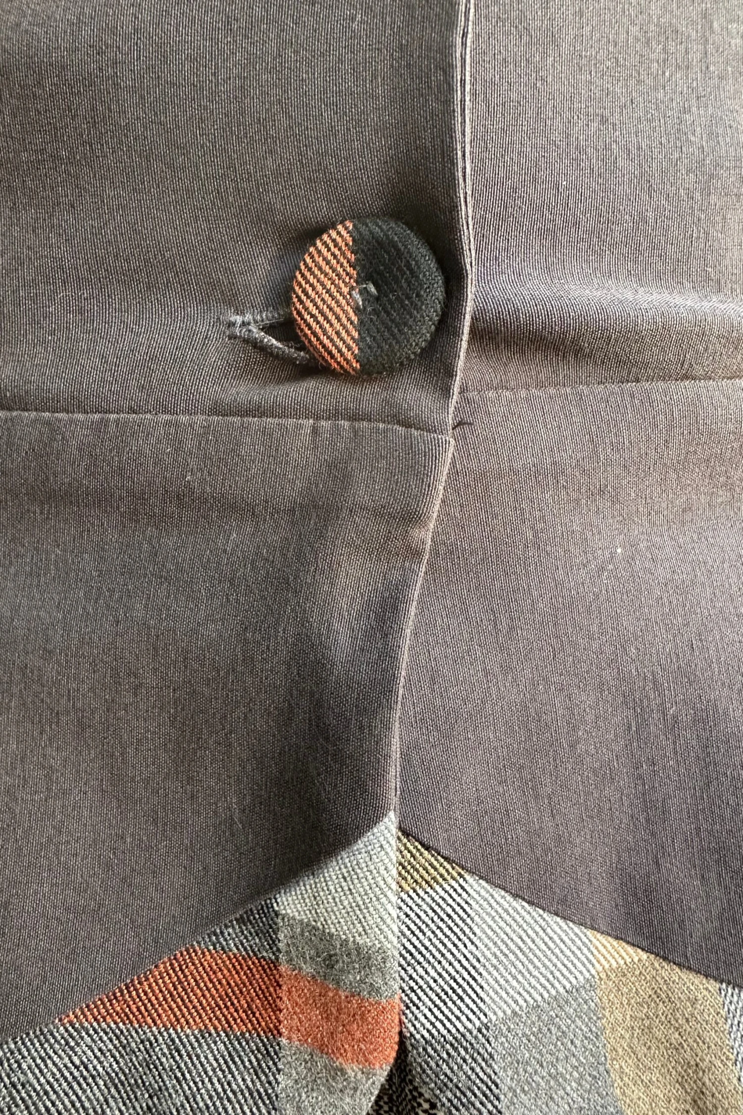 Fitted dark grey bengaline blazer trimmed in rust, black and tan plaid. There is a second collar in plaid, as well as the jacket hem, cuffs, summarys and belt. Unlined, no pockets.