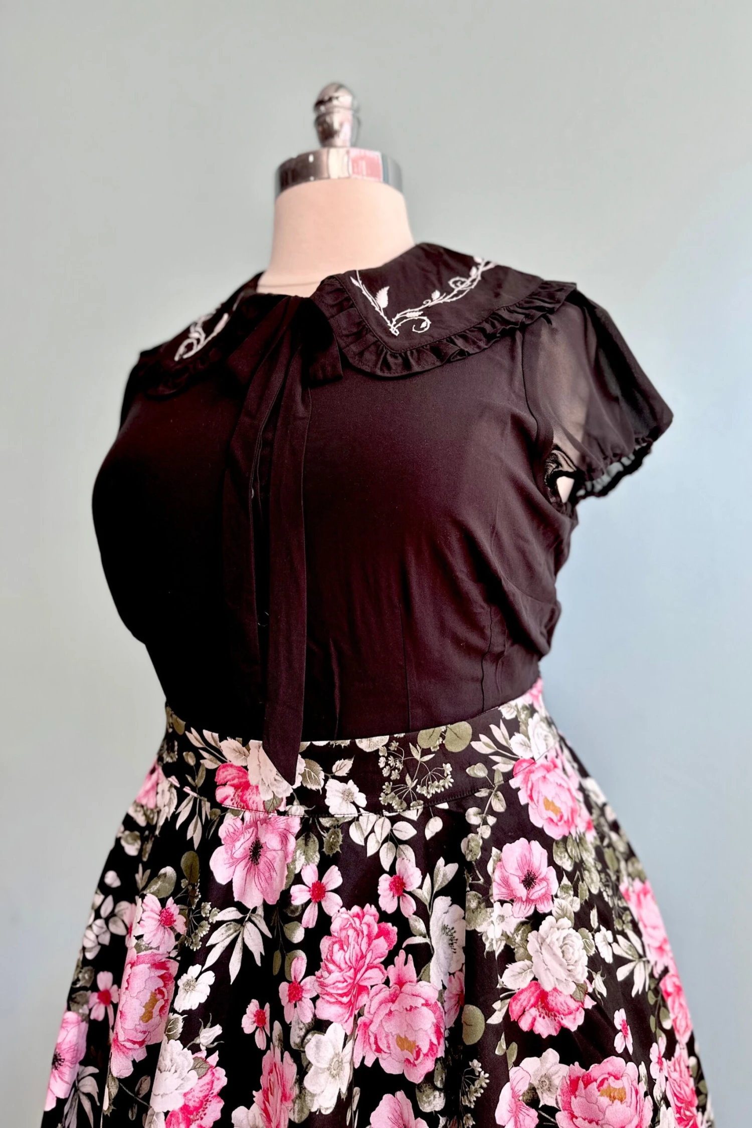 Black circle skirt with a pink, white, and green floral print. This skirt has a back zipper and side pockets. Unlined.