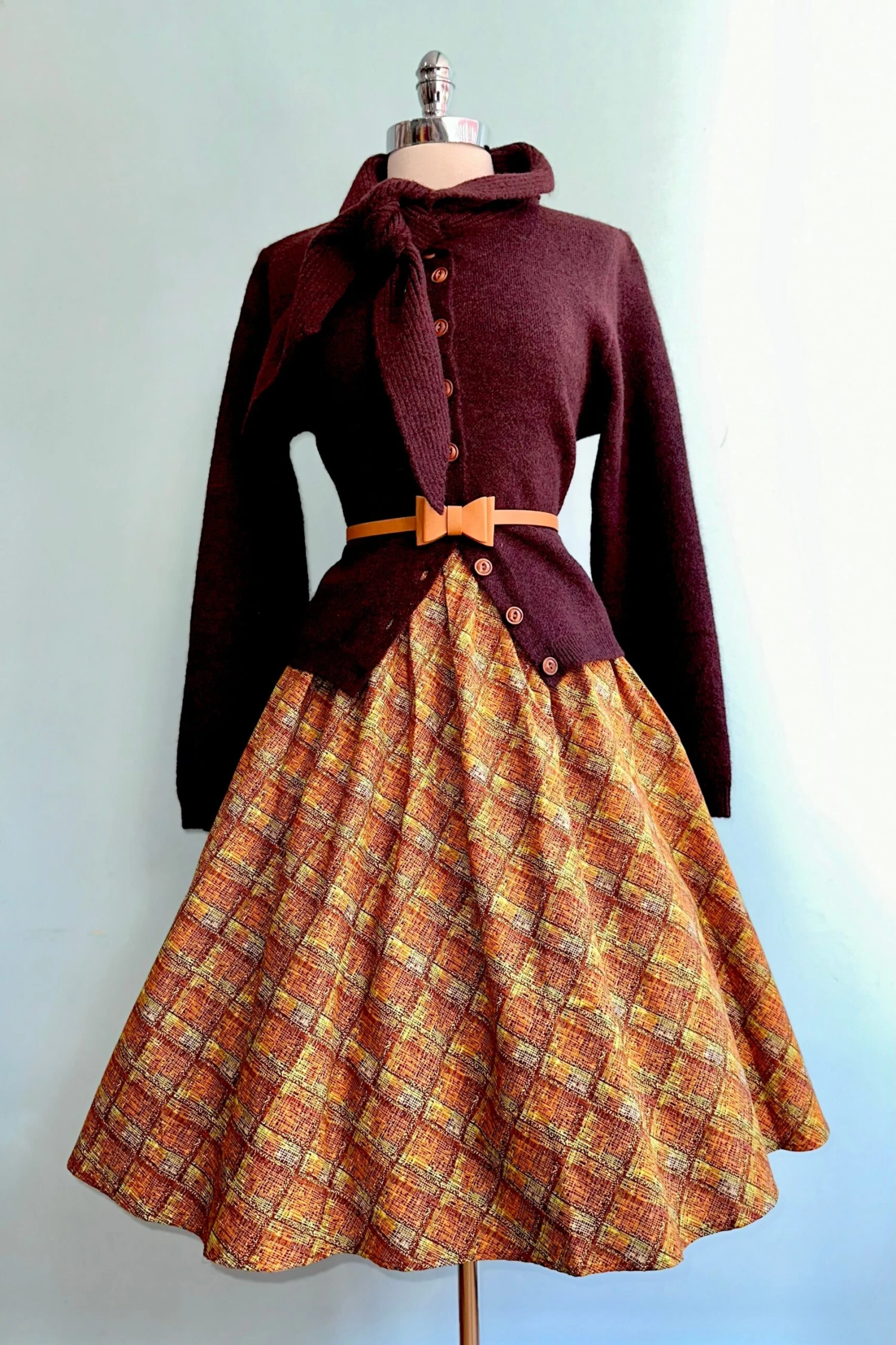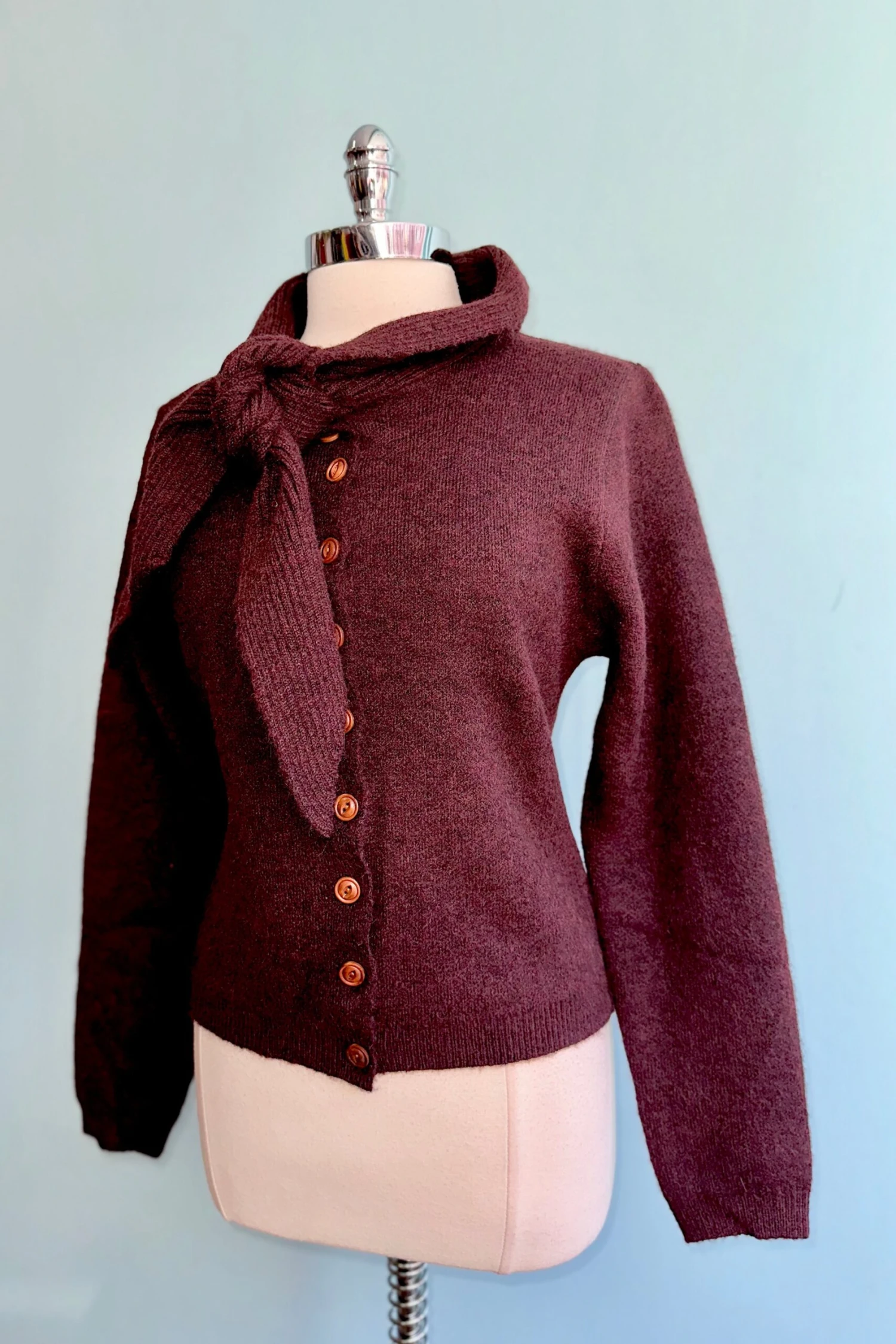 Midi cardigan in burgundy with a summary front and a tie collar. So super soft and cozy, great for cold weather!