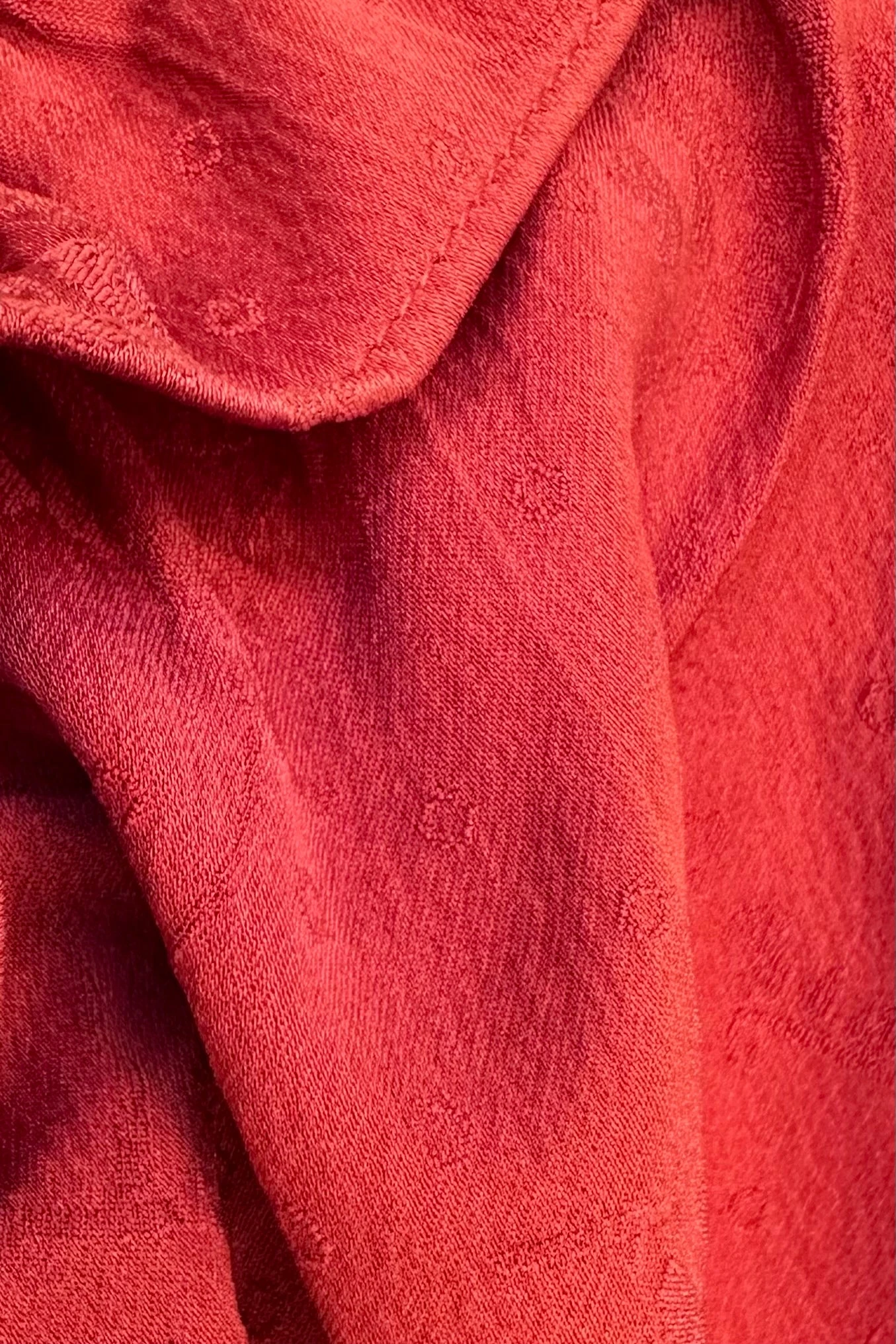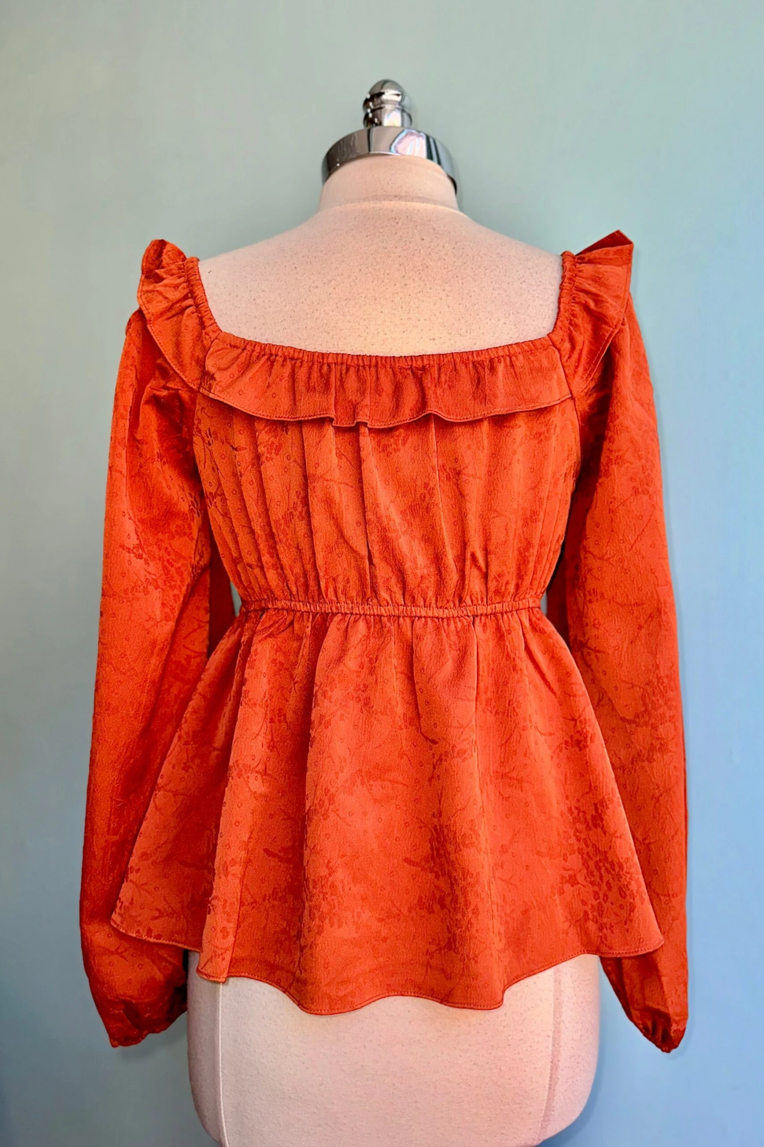 Rust jacquard billowy sleeve top with a ruffled v-neck. This top has an empire elastic waist and an elastic at the wrist.