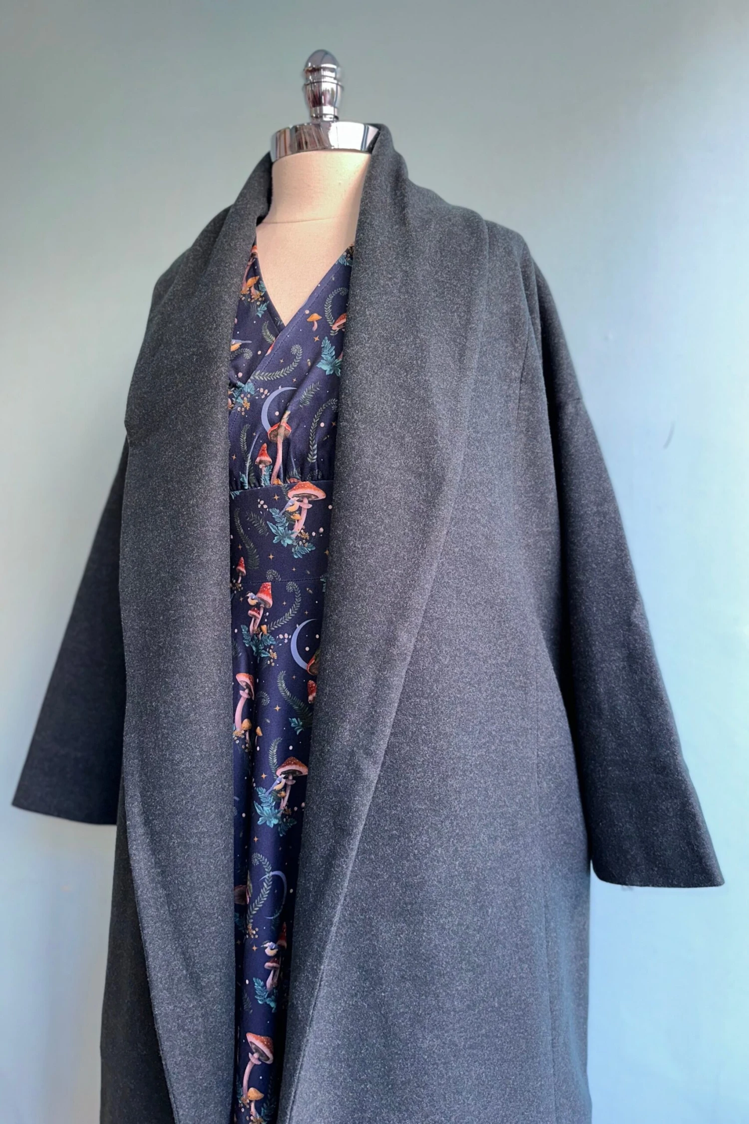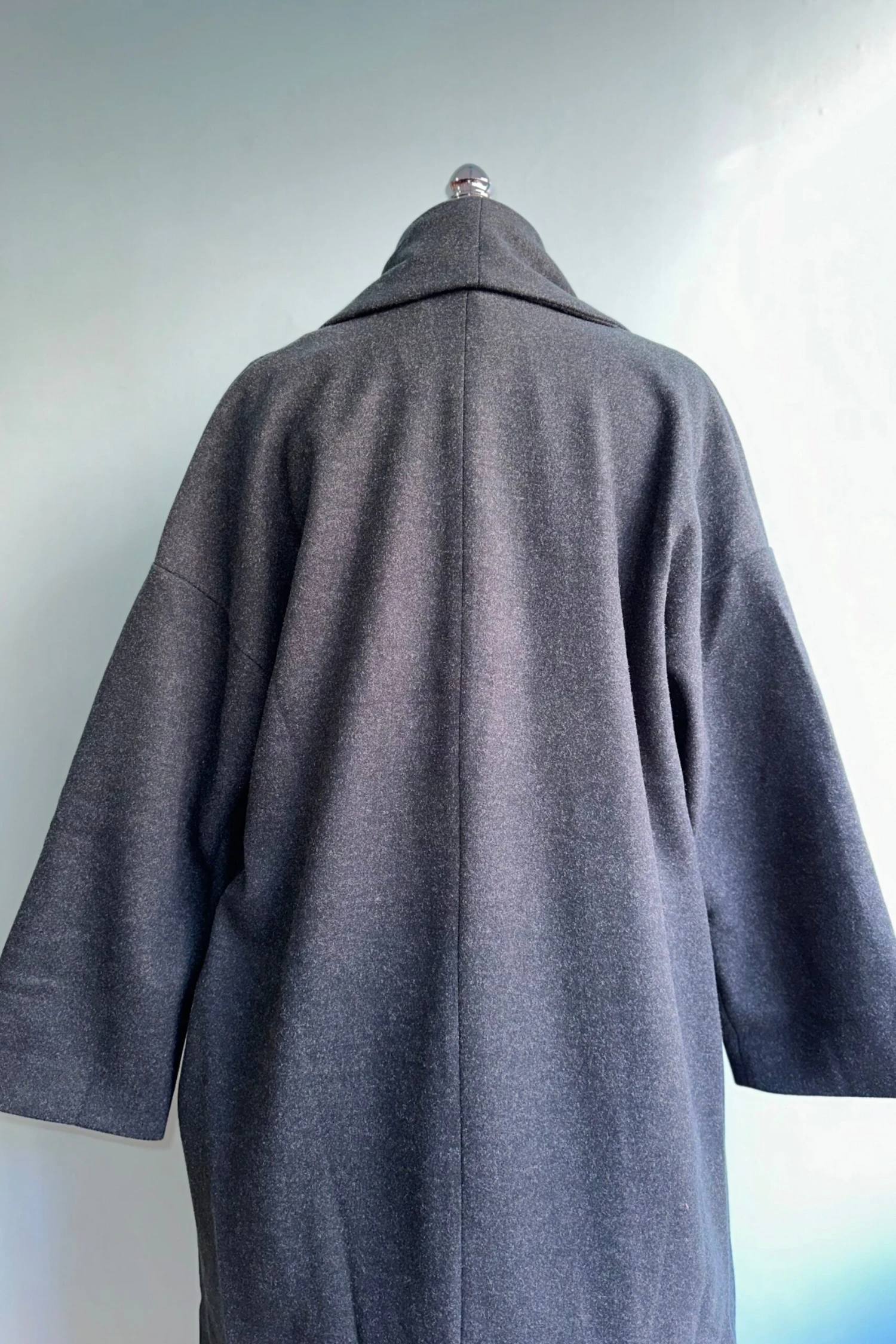 Soft felted wrap coat with a shawl collar in burgundy. This coat has a tie fastener at the waist and side pockets. Lined in satin. Generously sized. Fabulous fall coat!