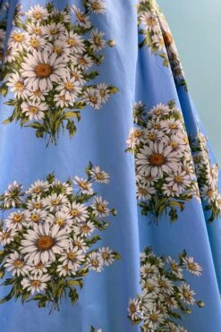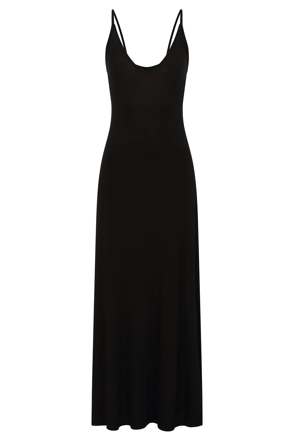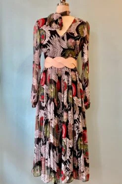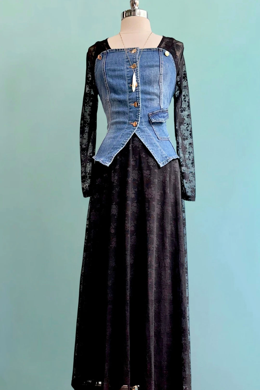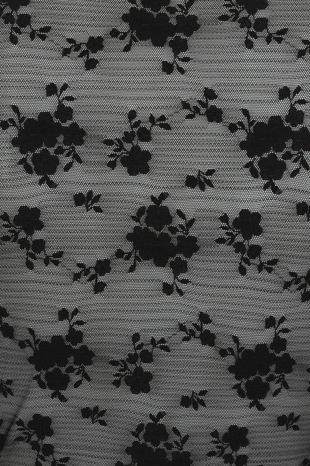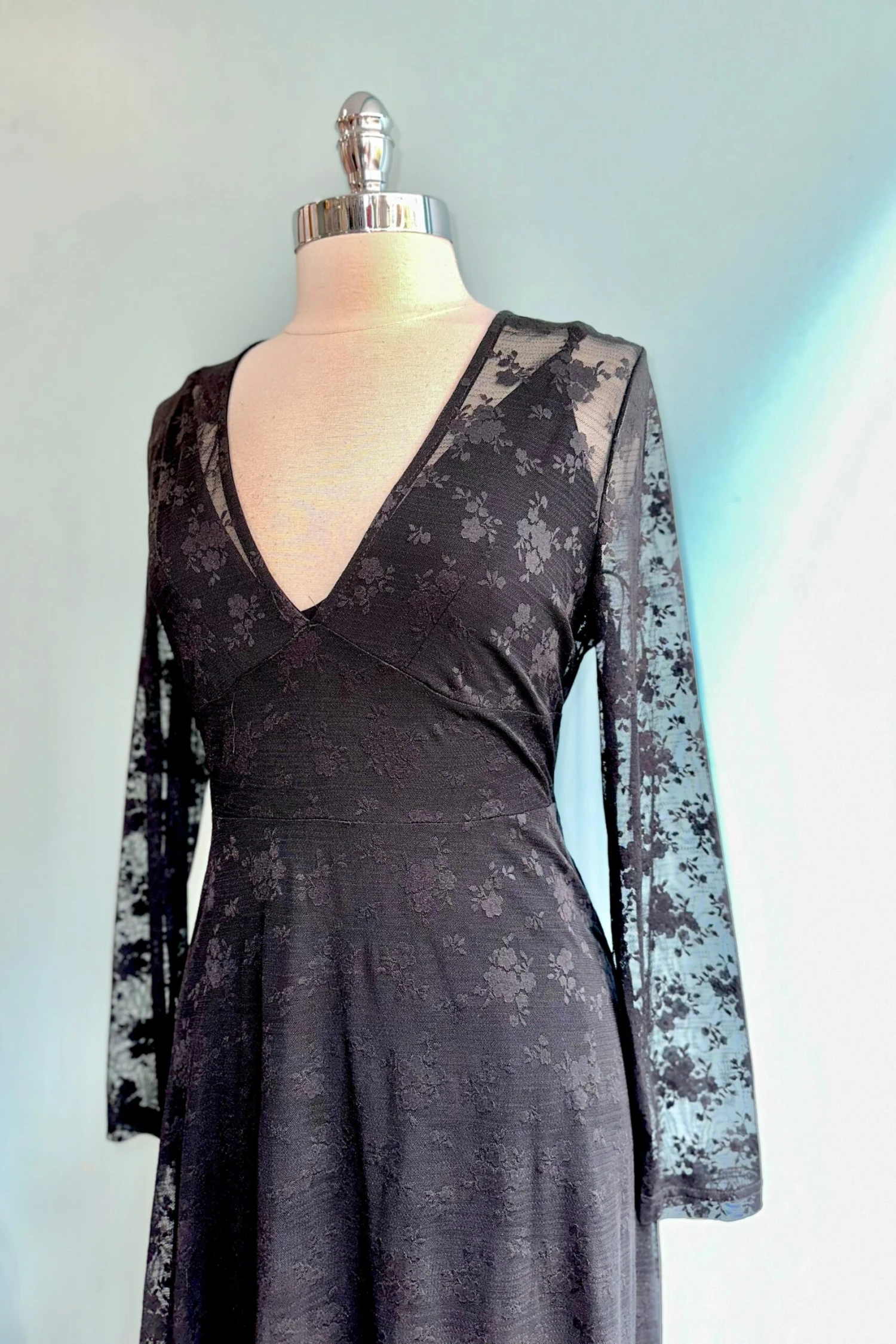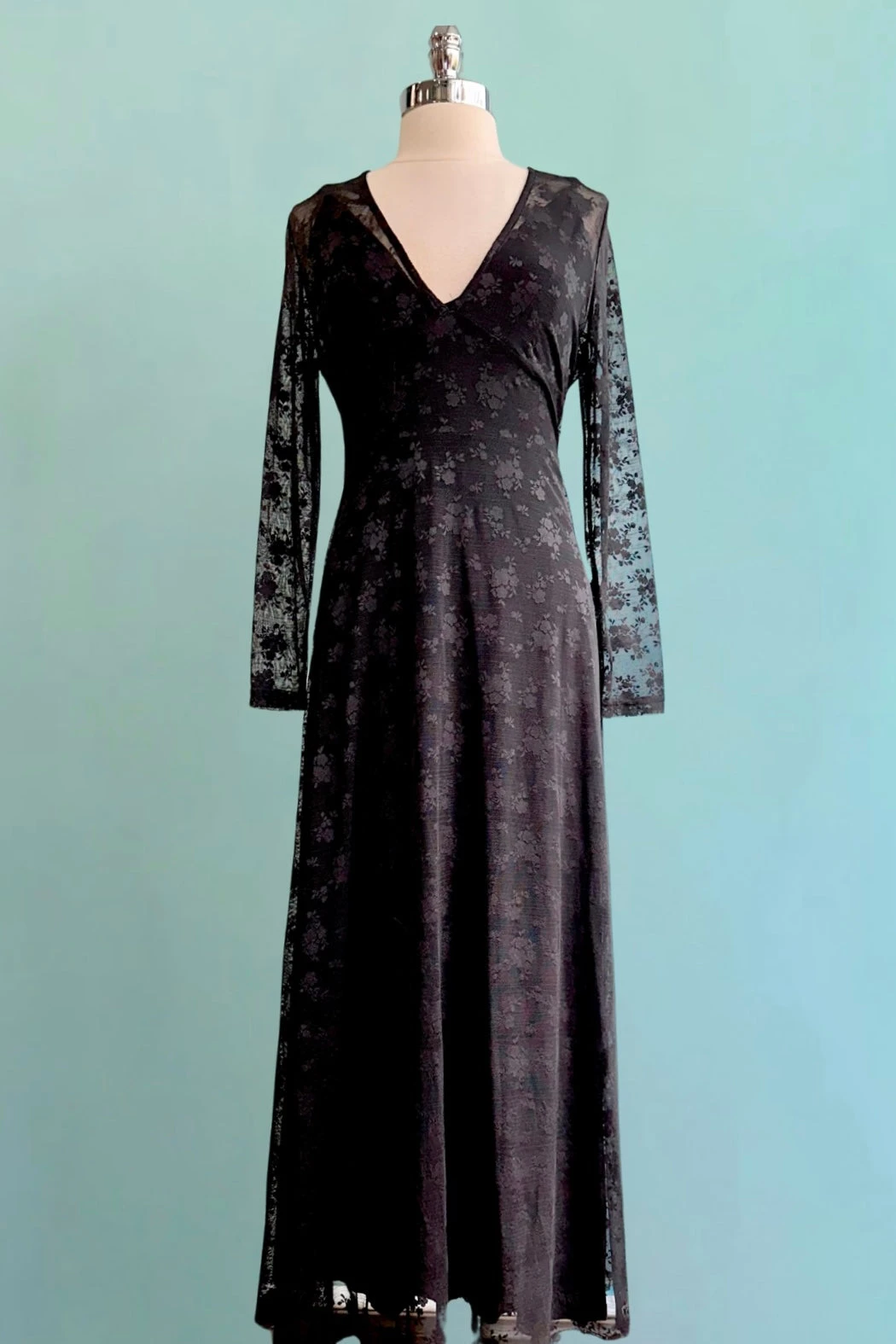 Pullover lace dress in black with a V-neck and long full skirt. Made of a sturdy stretch mesh fabric top layer and comes with a separate black jersey tank dress for lining. The fabric is black with little rosettes throughout.