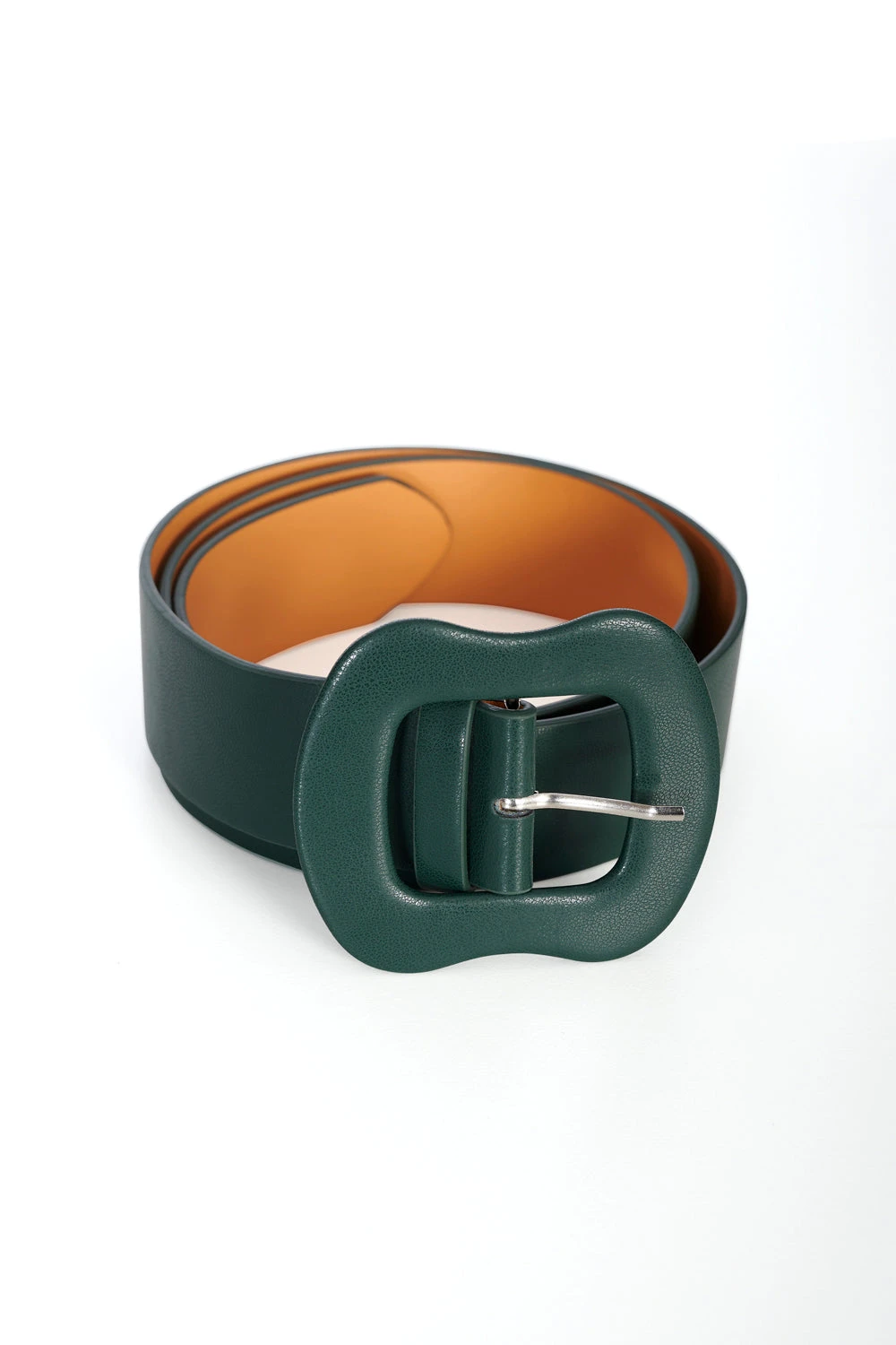 Forest green faux leather belt. 1.5″ wide, Buckle is 2.75″. This belt has adjustable holes. No stretch.