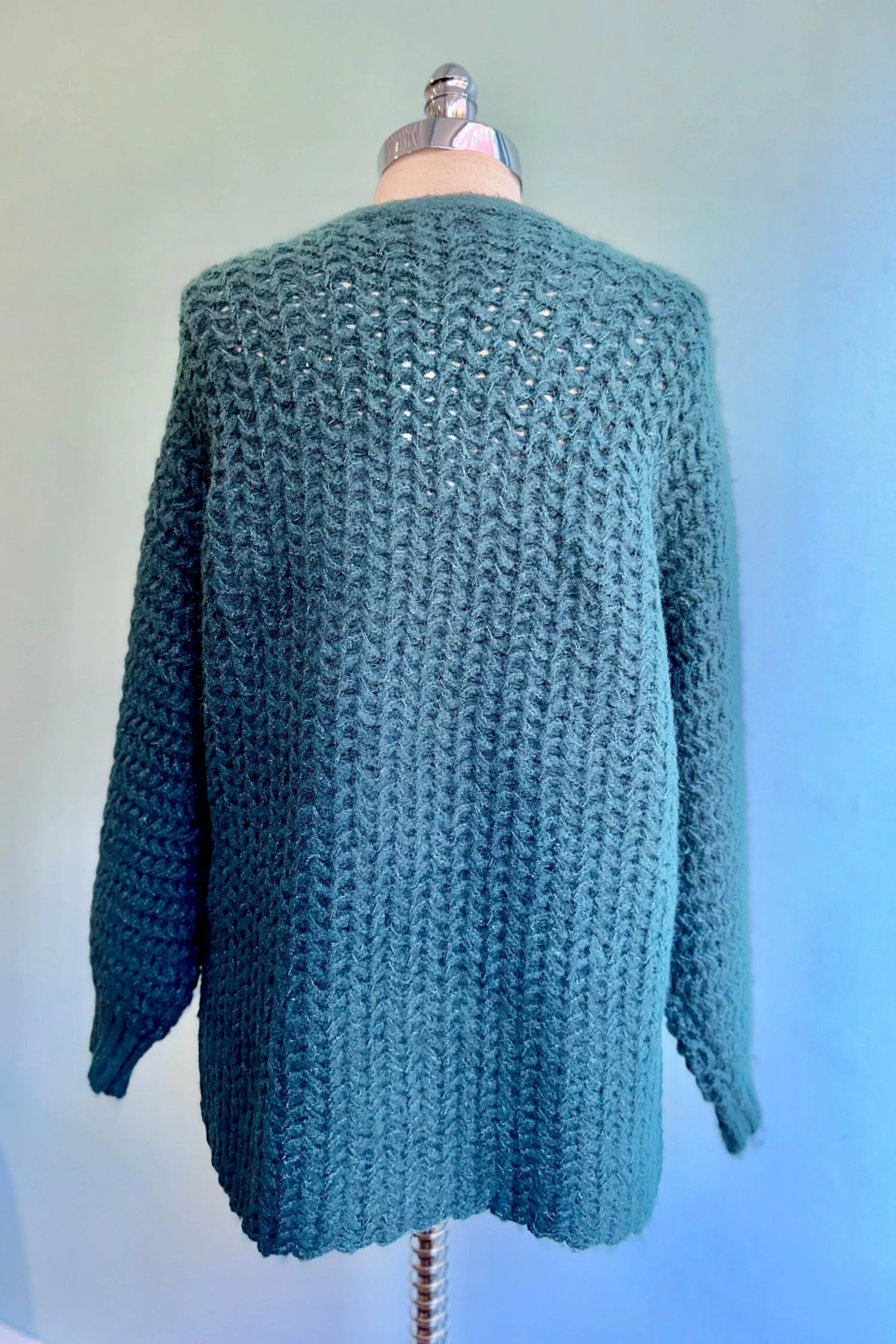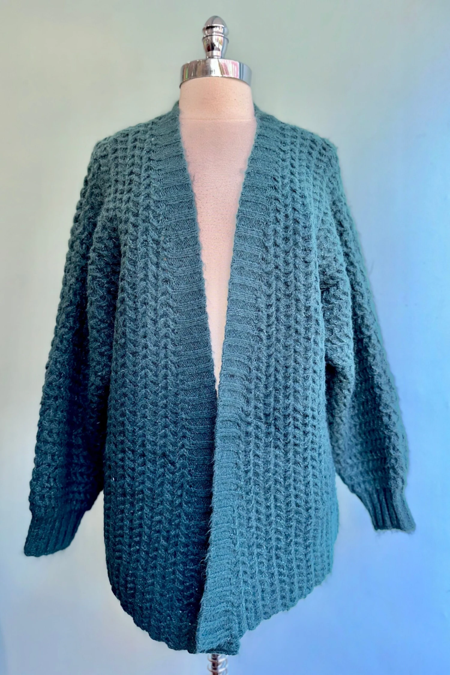 Super soft cardigan in forest green. This cardigan is open and is about hip length.