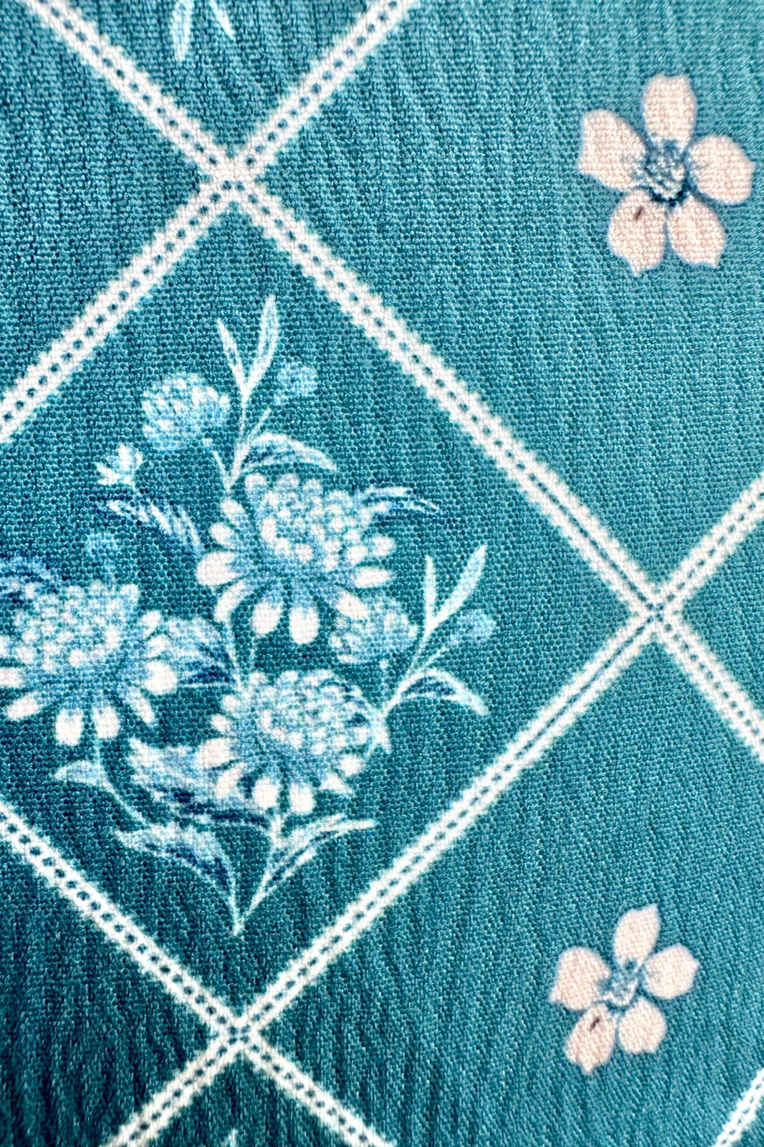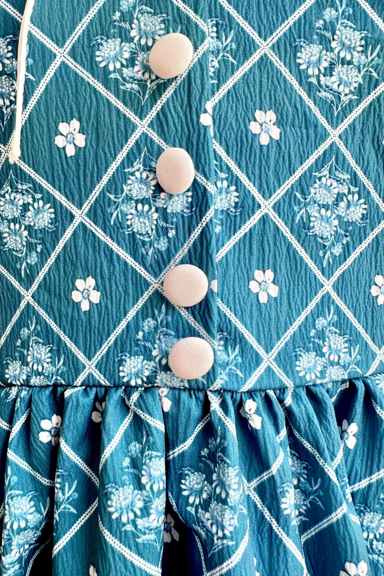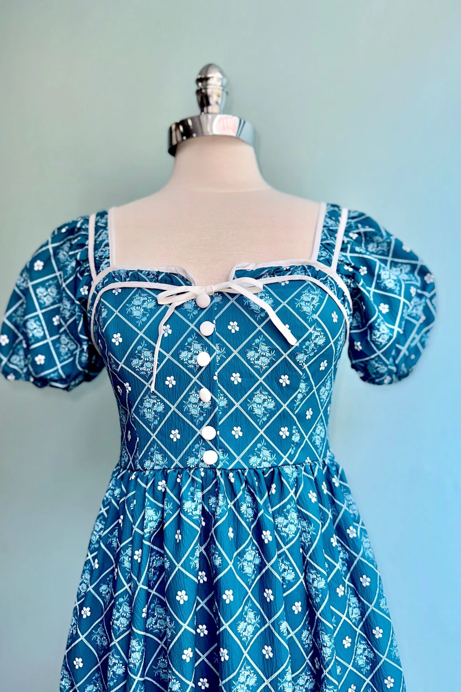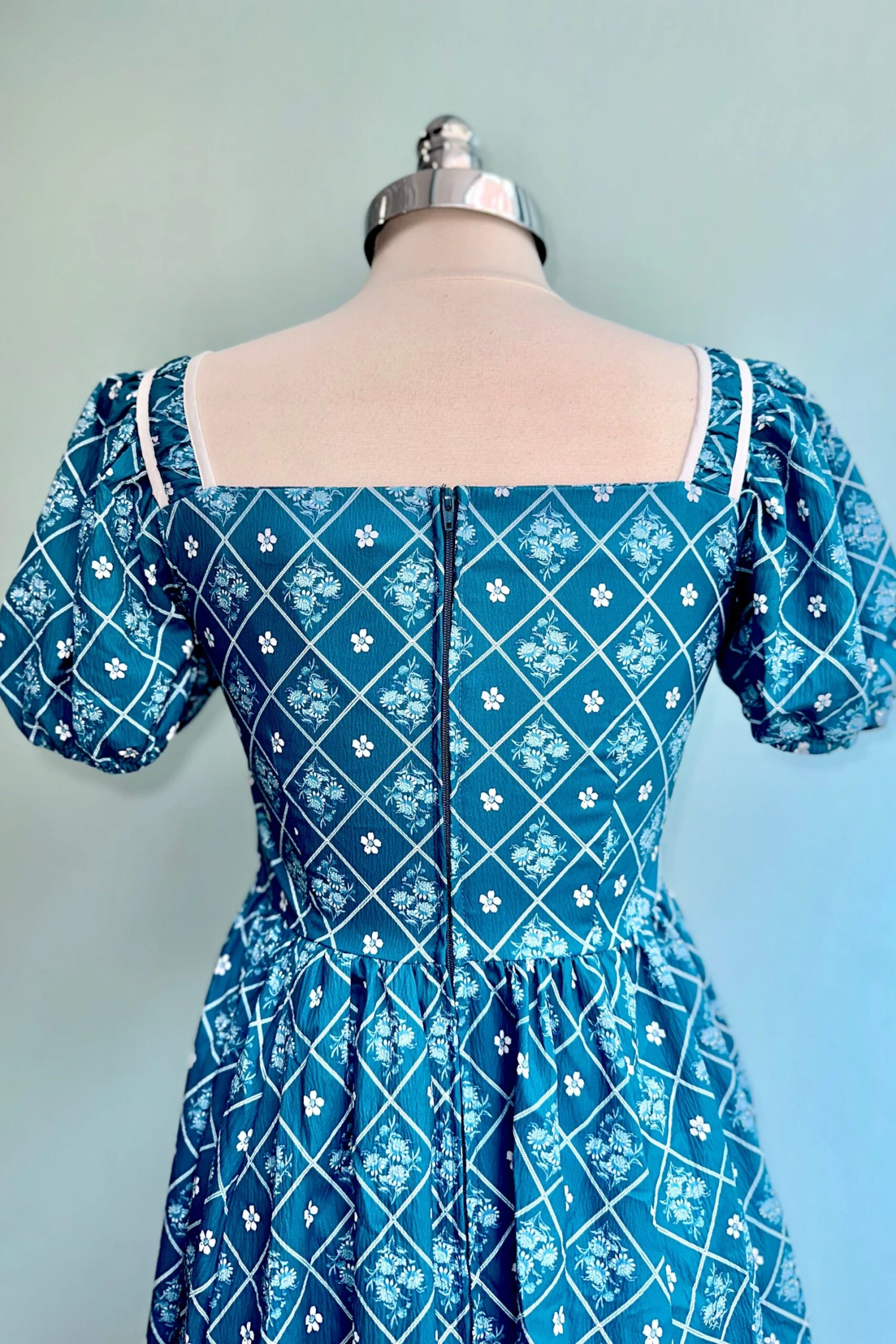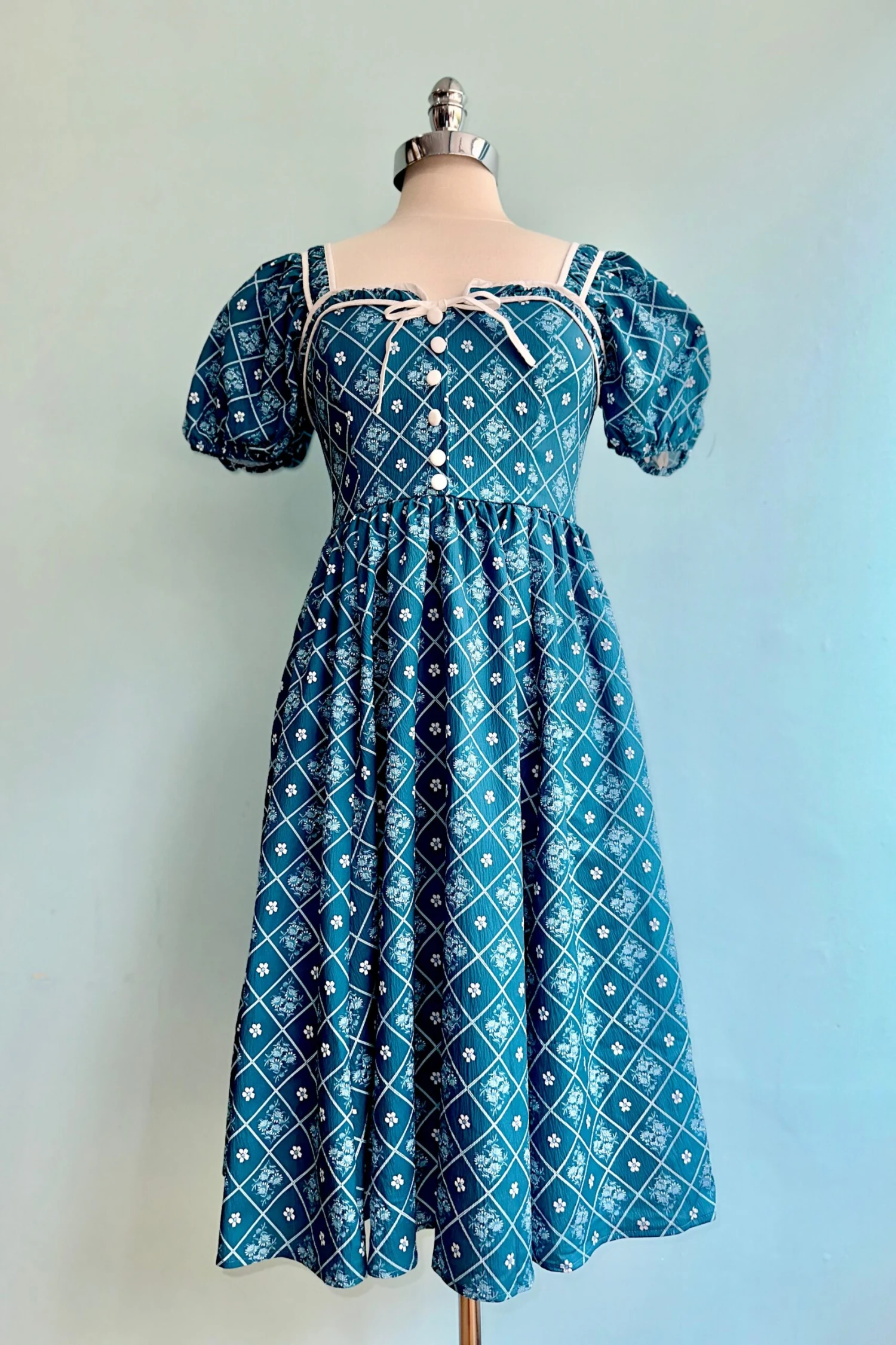 Blue diamond and floral print puff sleeve dress. This dress has short sleeves with a little puff at the shoulders. The back zips up, it is not lined, and does not have pockets. This dress also has a white trim at the neckline with a little bow and white decorative, non-functionable summarys down the front of the bodice.