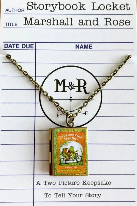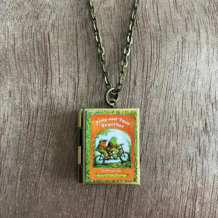 Book locket in the beloved Frog and Toad! Our book lockets are made with nickel free materials and feature the most beloved classic and modern books! They are on 24-inch chains and are sealed with a gloss finish for durability. Each locket can hold two pictures.