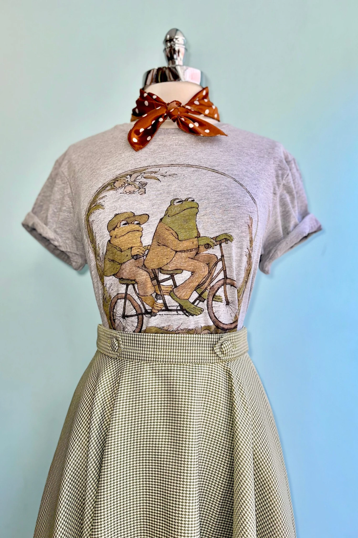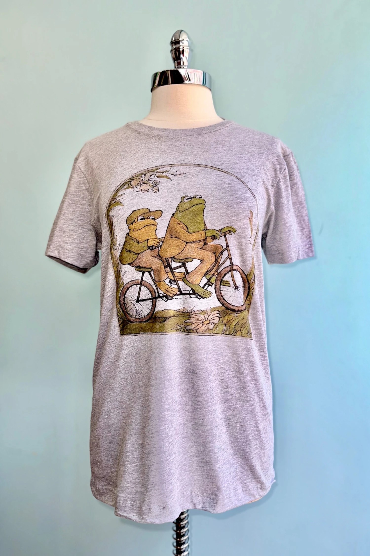A soft grey t-shirt with a printed image from the beloved children’s books Frog and Toad featuring a frog and toad in green riding a bicycle. Unisex sizing and made of 100% Cotton.