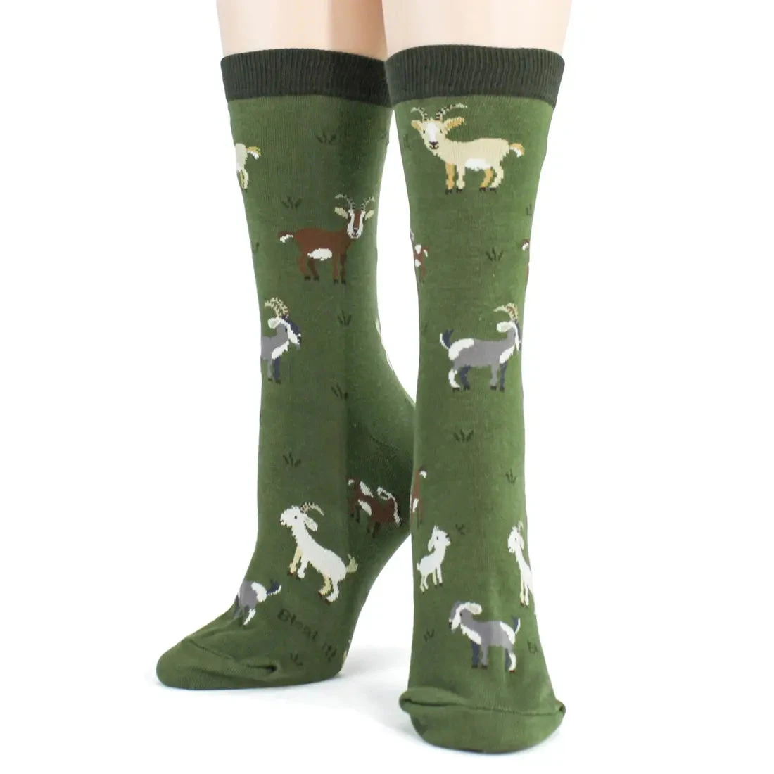 Green socks with cute little goats about. Made from a soft, breathable cotton blend and a healthy serving of stretch to keep your feet comfortable.