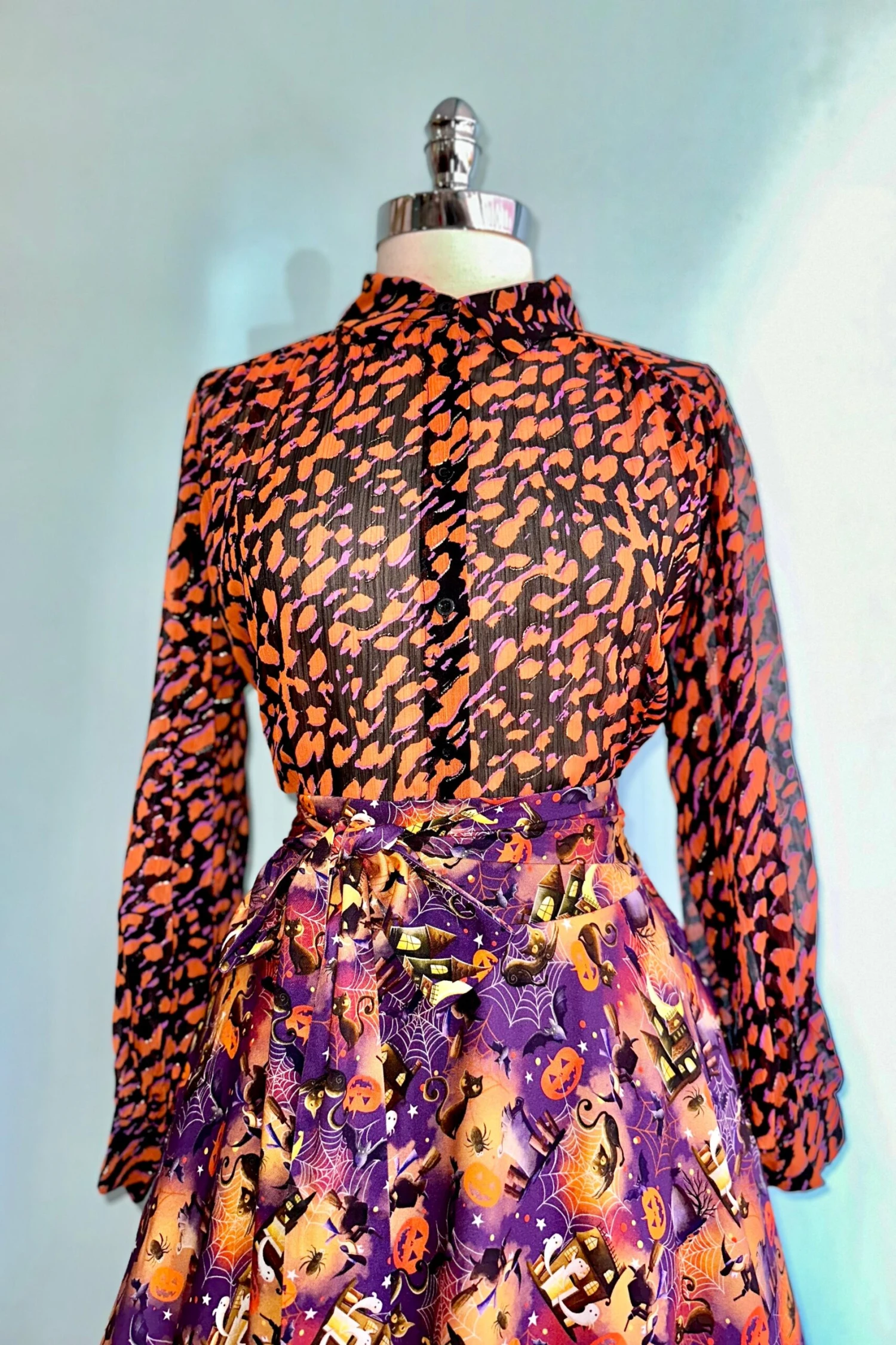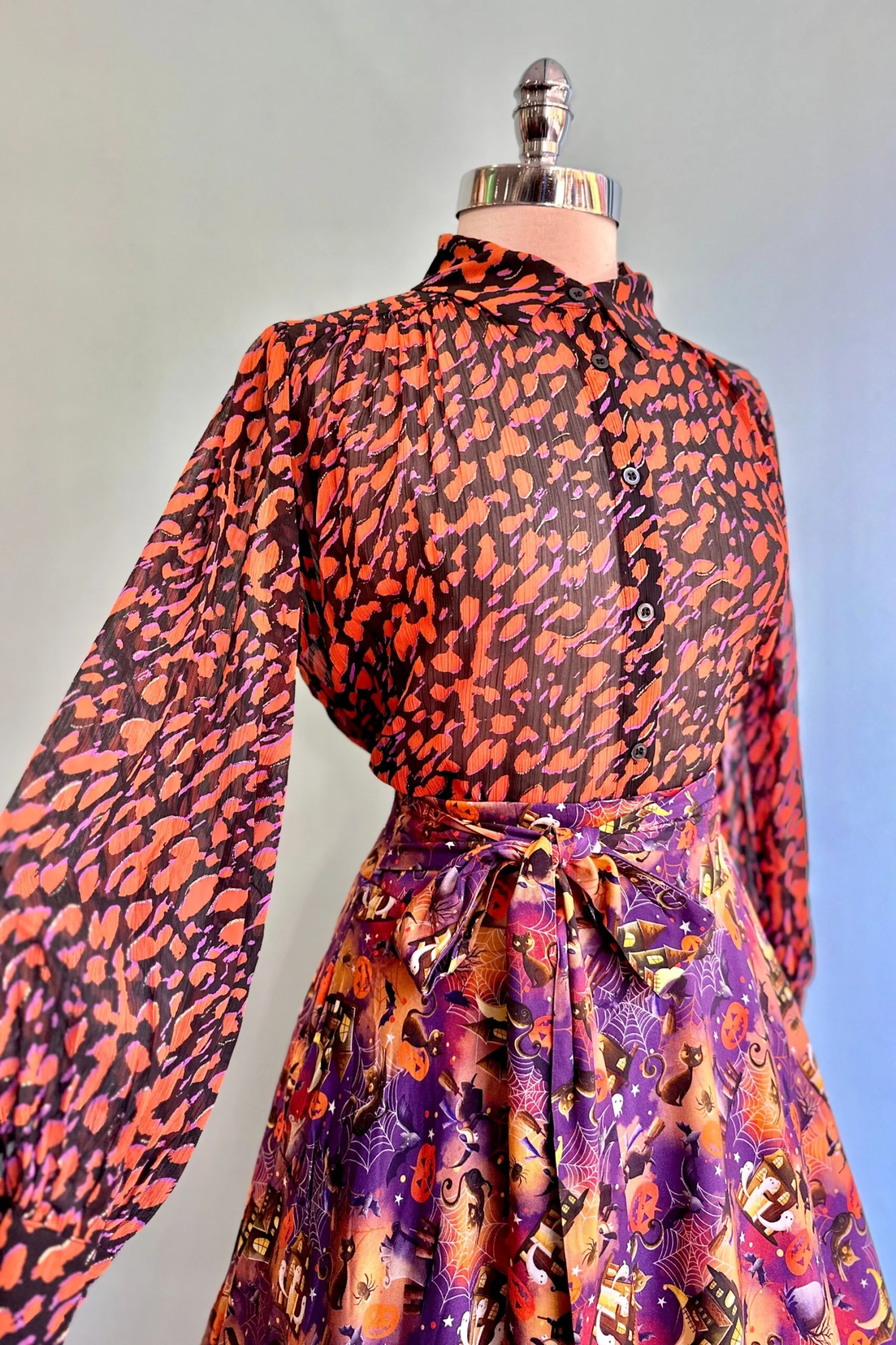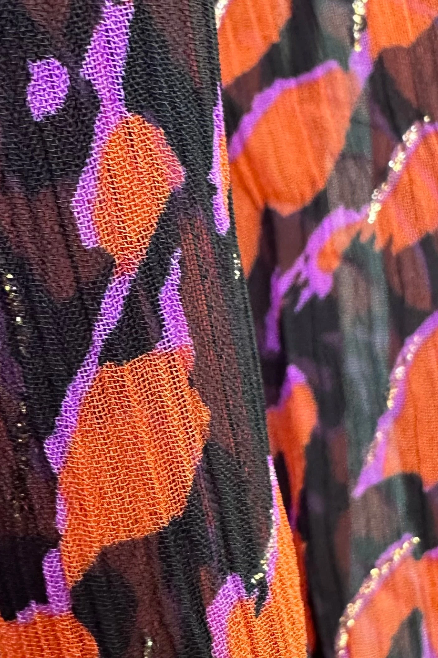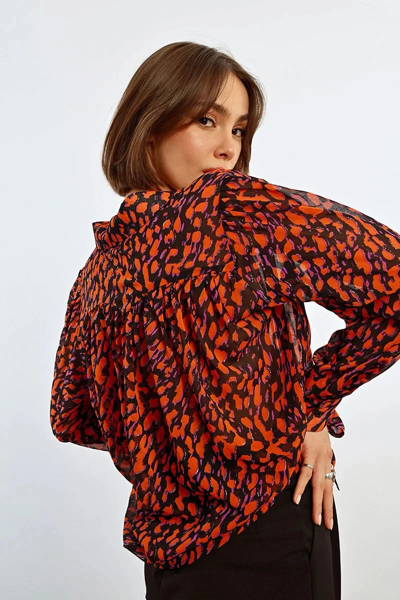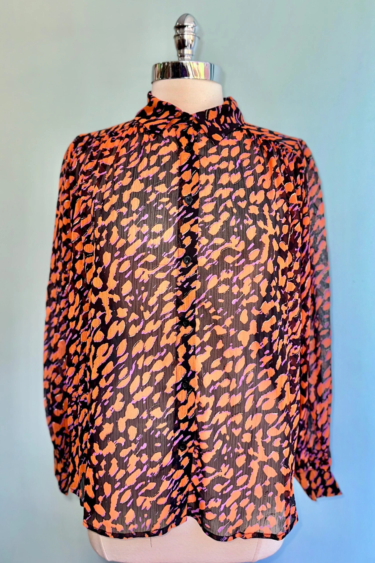 Long sleeve top with a summary front and fold over collar. The fabric is black with an orange and purple abstract print with gold detail. The sleeves are very full and billowy and fasten with a summary at the wrist. Great layering top! Semi-sheer.