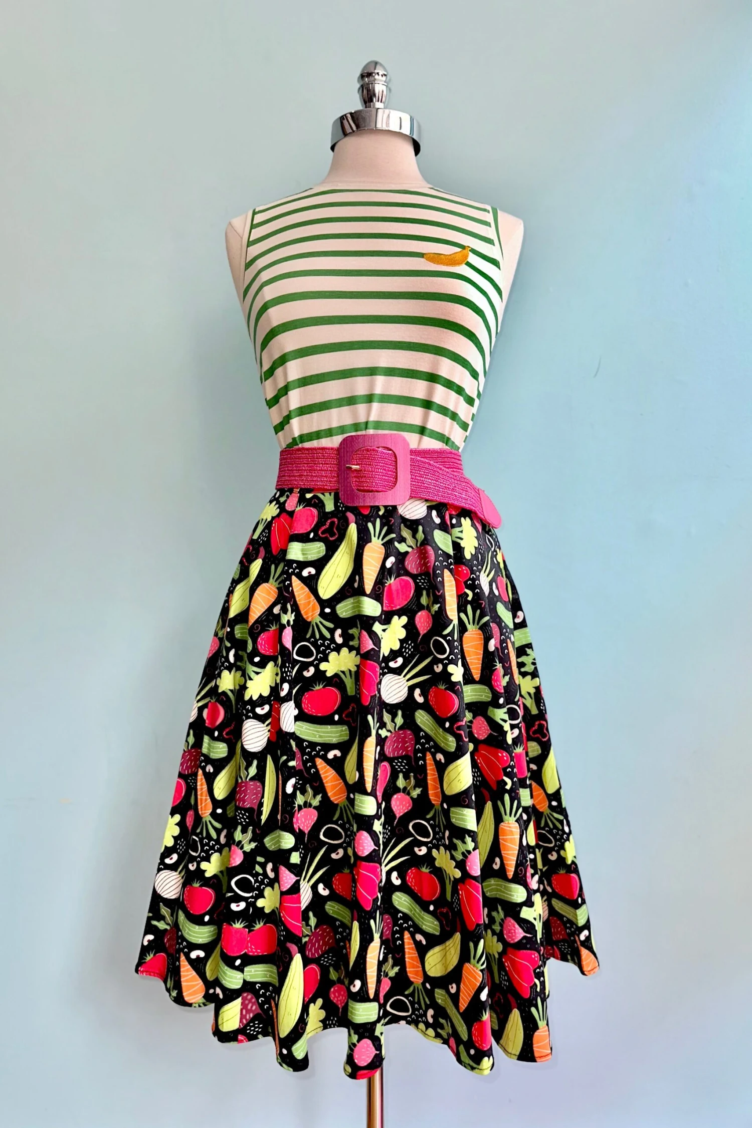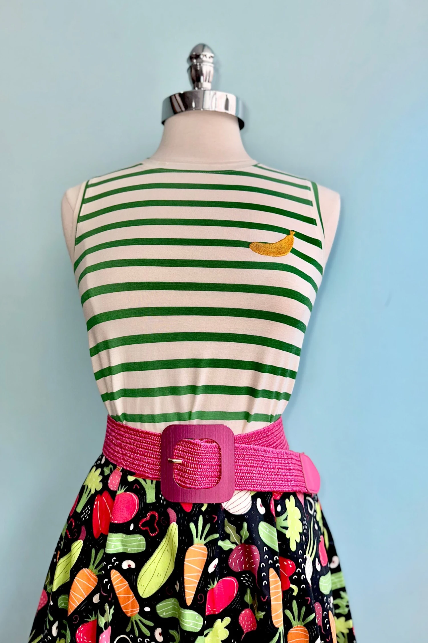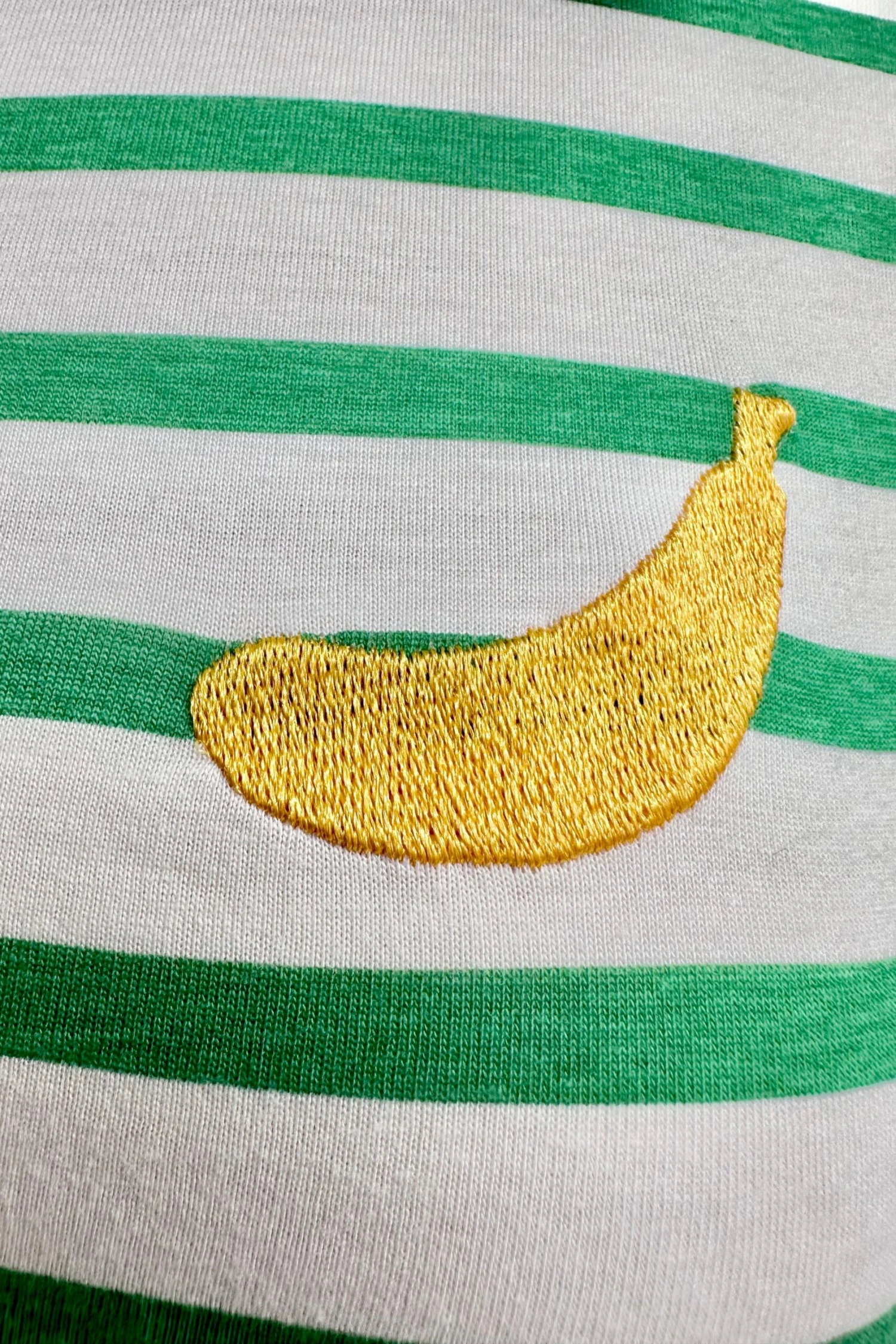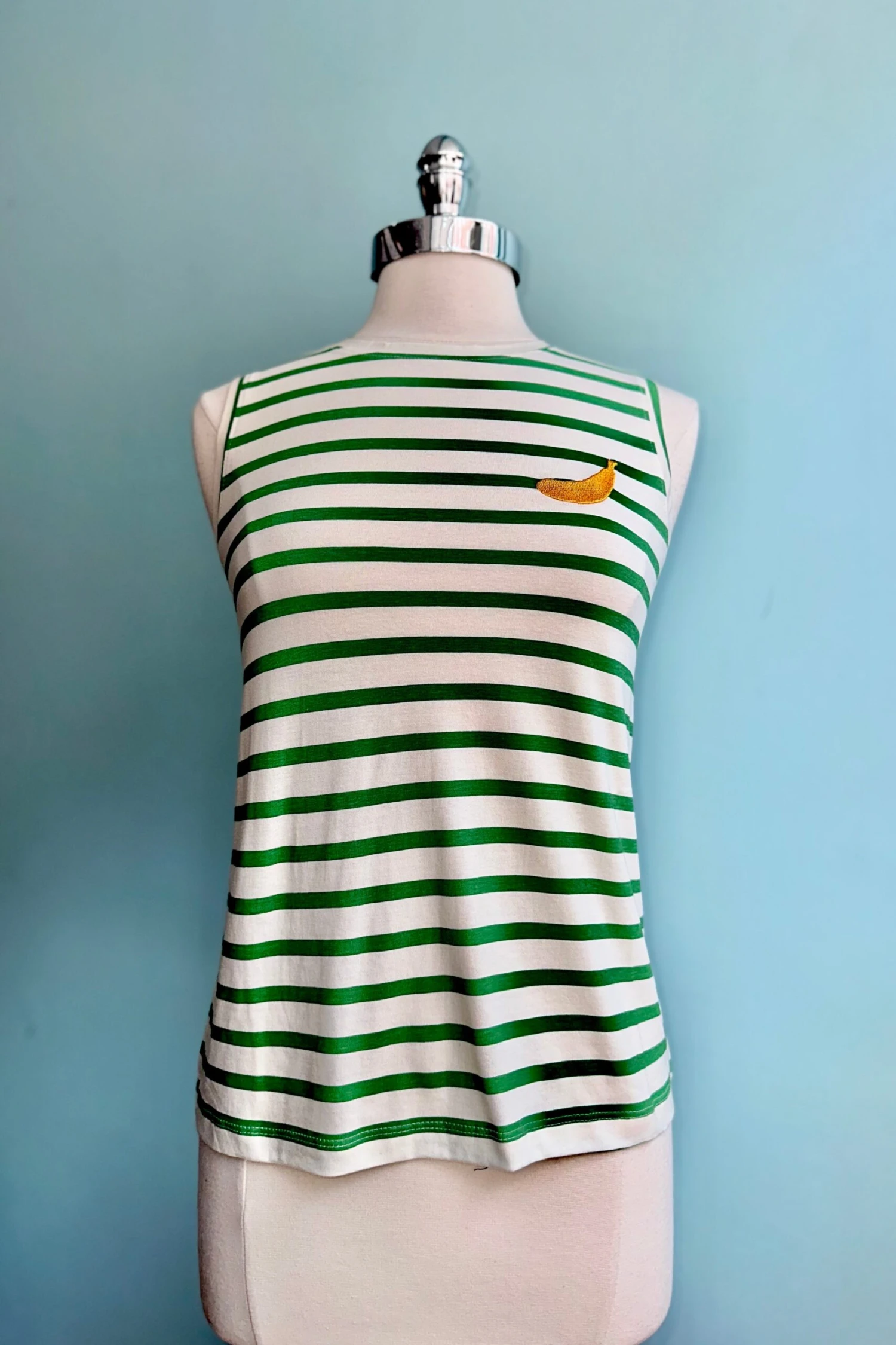 Green and white striped tank top with an embroidered banana on one shoulder. Made of a soft knit 100% cotton. This tee fits true to size and we recommend going with your usual size. There is a little bit of stretch to the fabric.