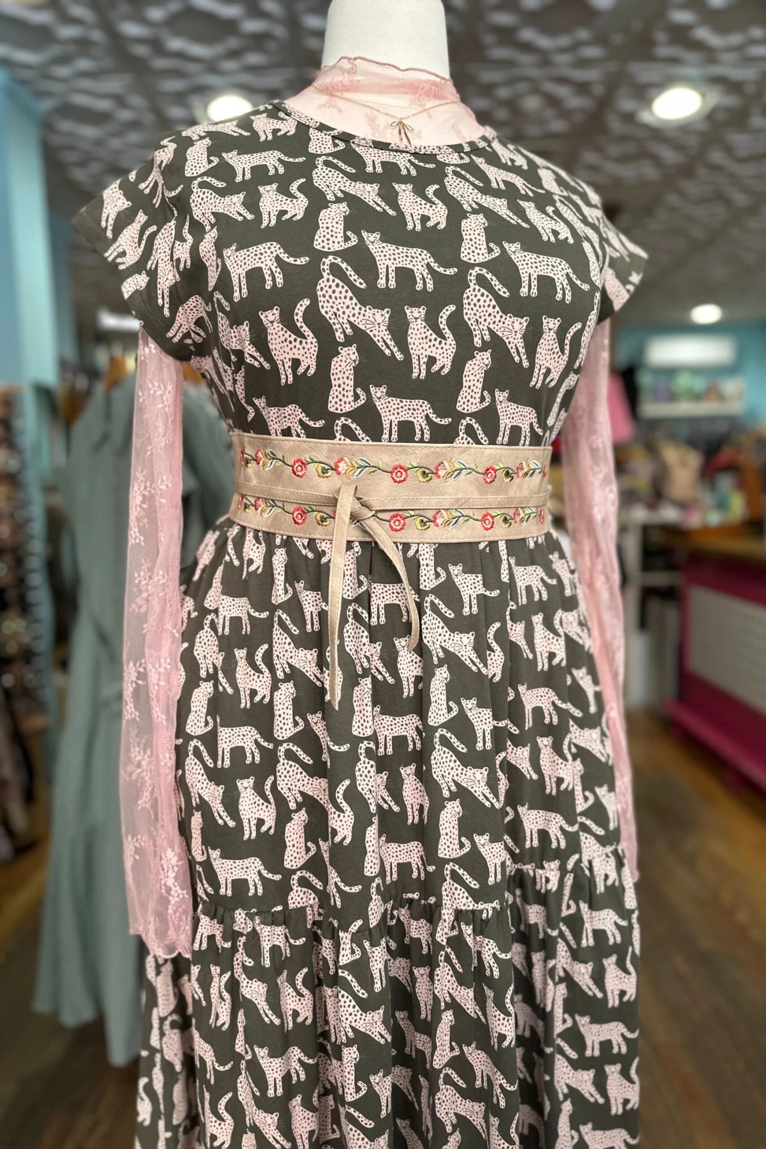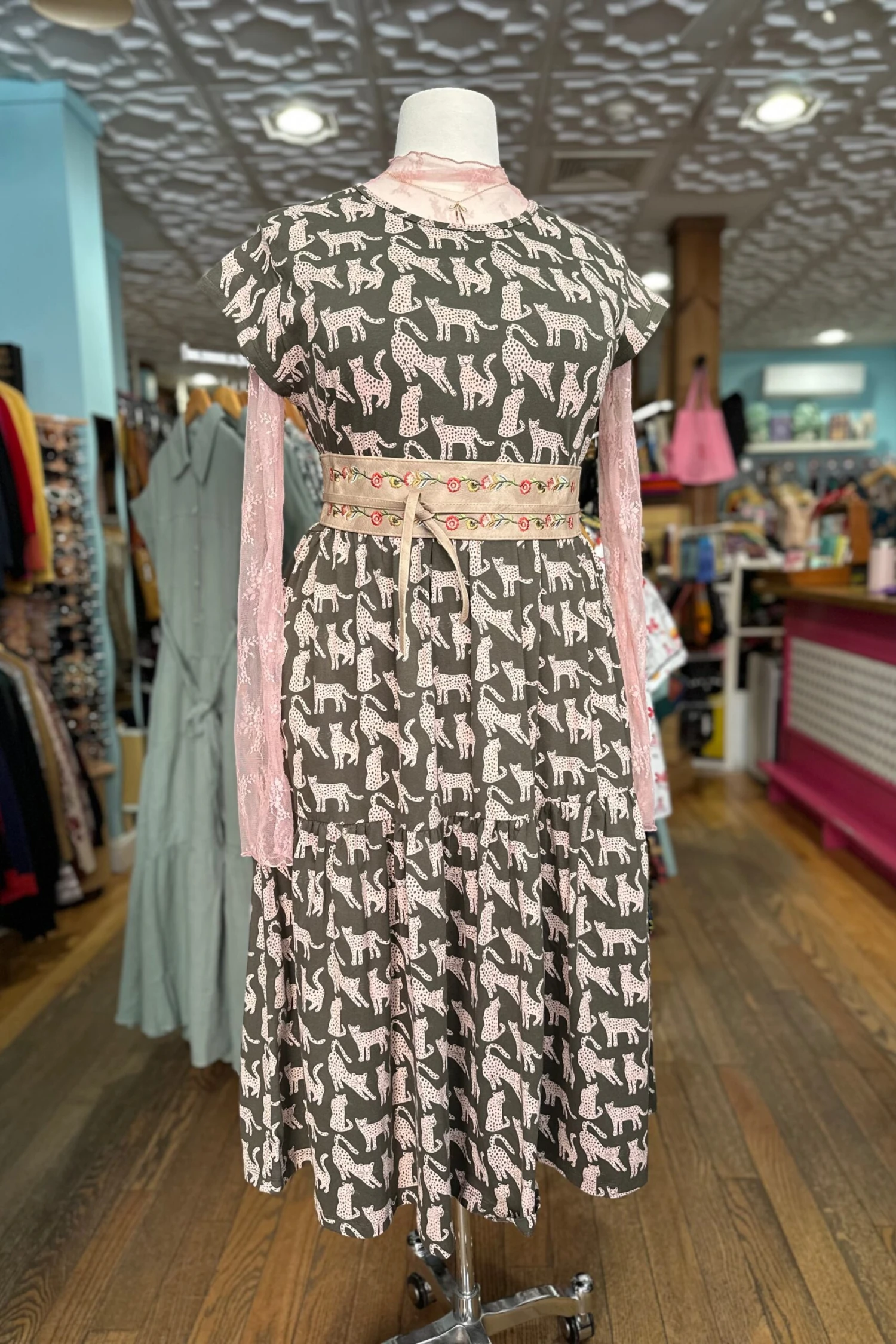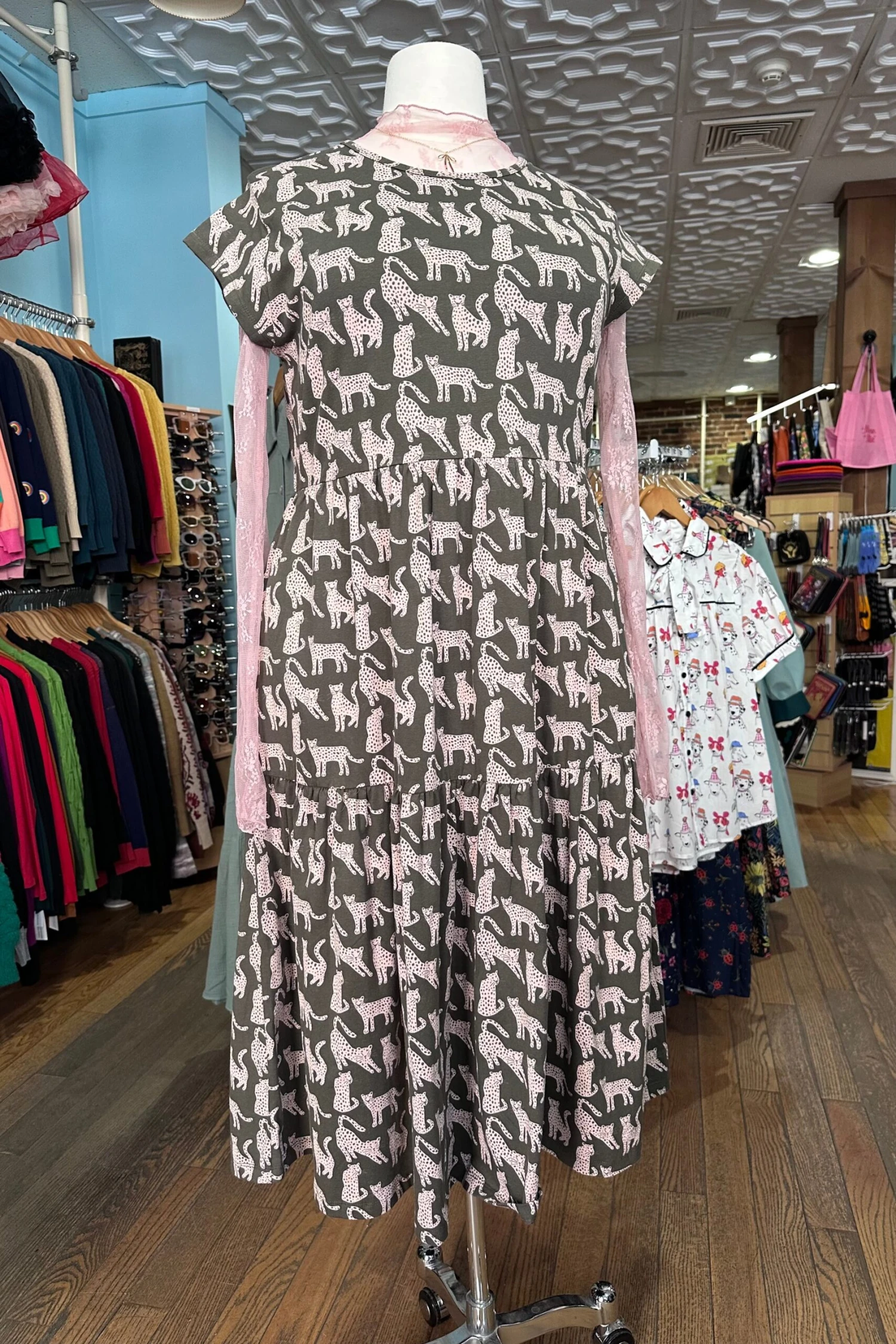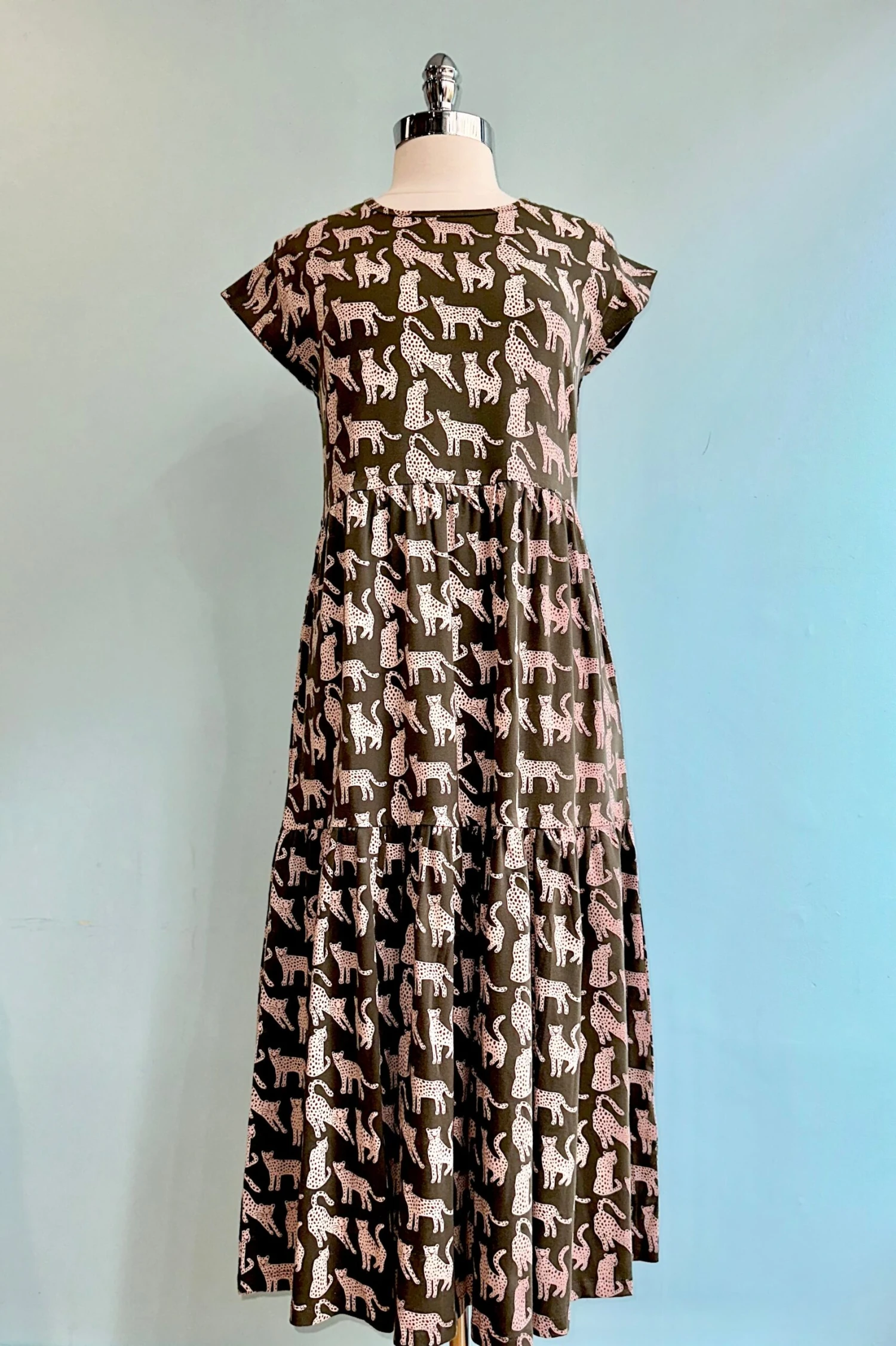 Organic cotton jersey, capped sleeve midi dress in olive green with tan leopard cats throughout the dress. The skirt is full with tiers and side pockets. Perfect summer dress!