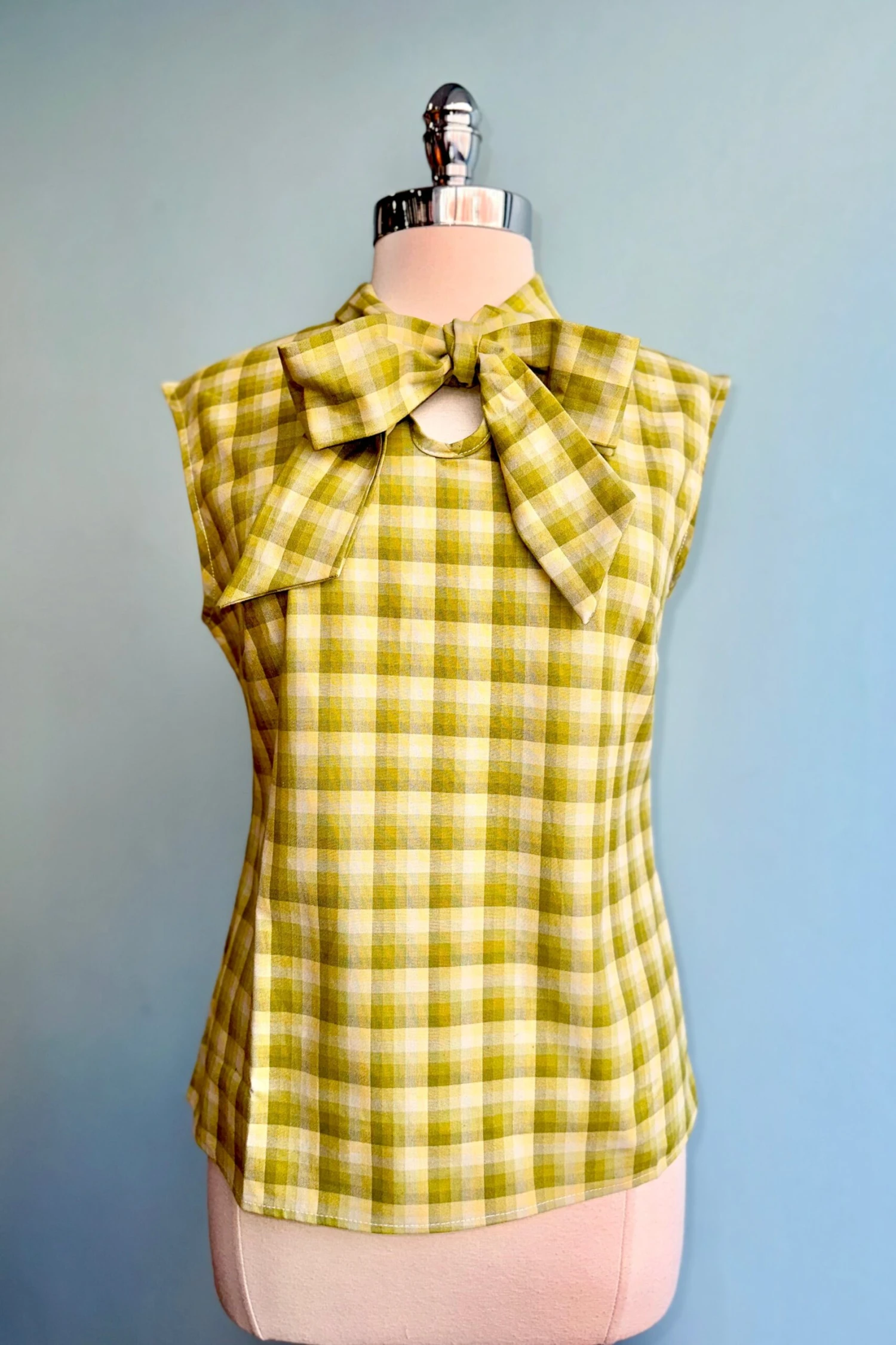 A sleeveless bow top in green, yellow, and white plaid with an adjustable tie at the neck and keyhole opening. Made of 100% cotton and zips up the side.