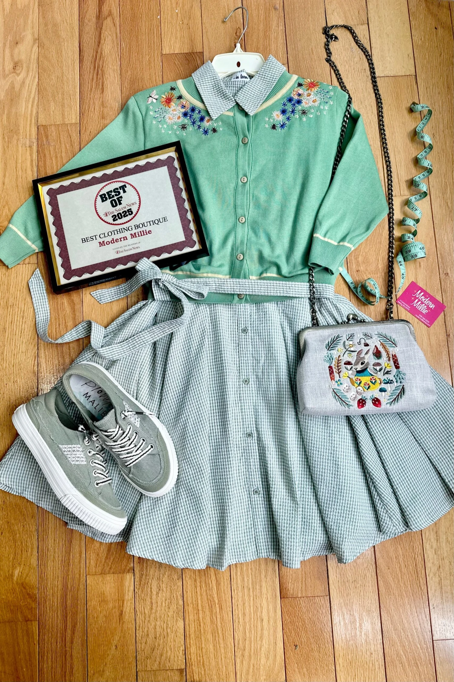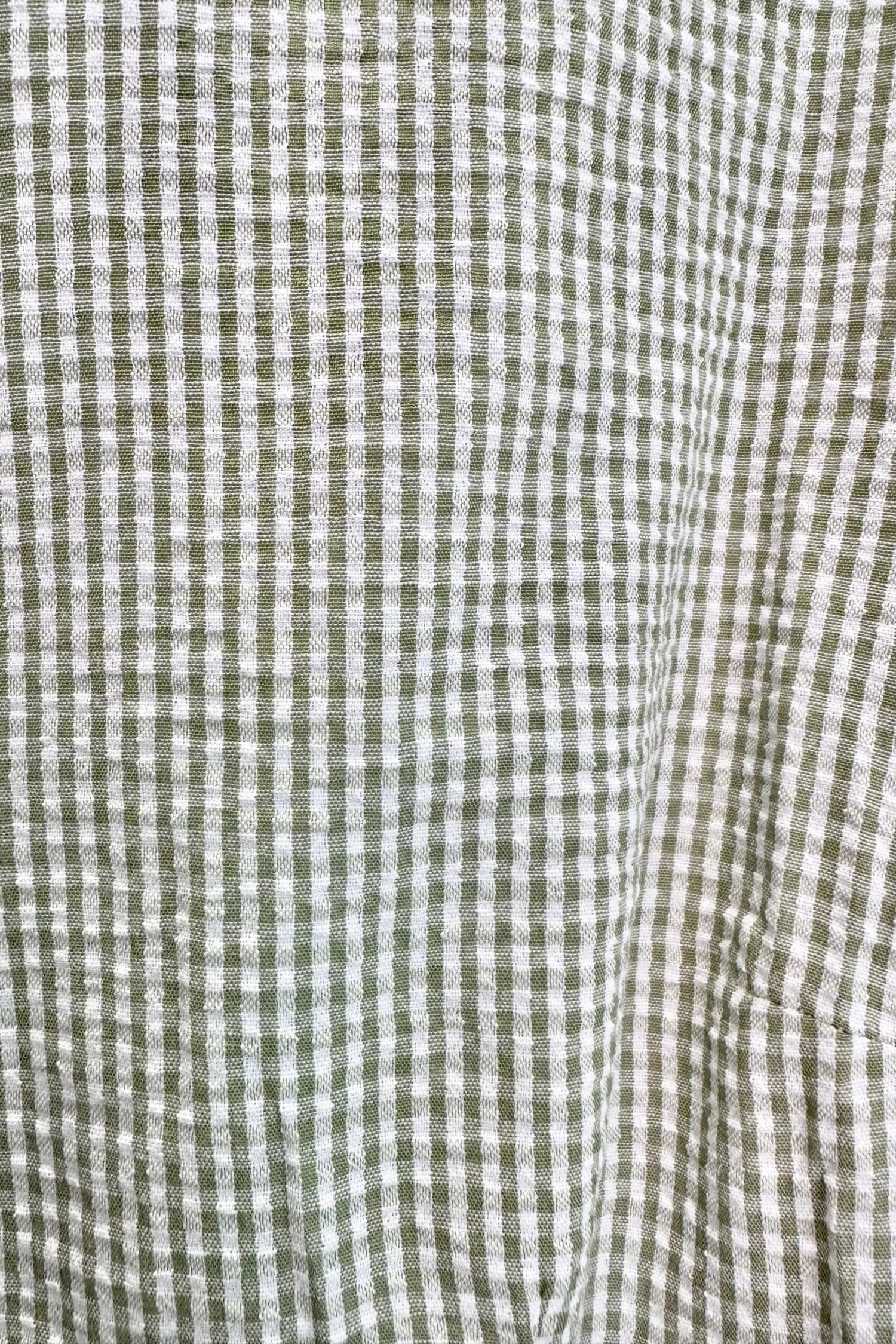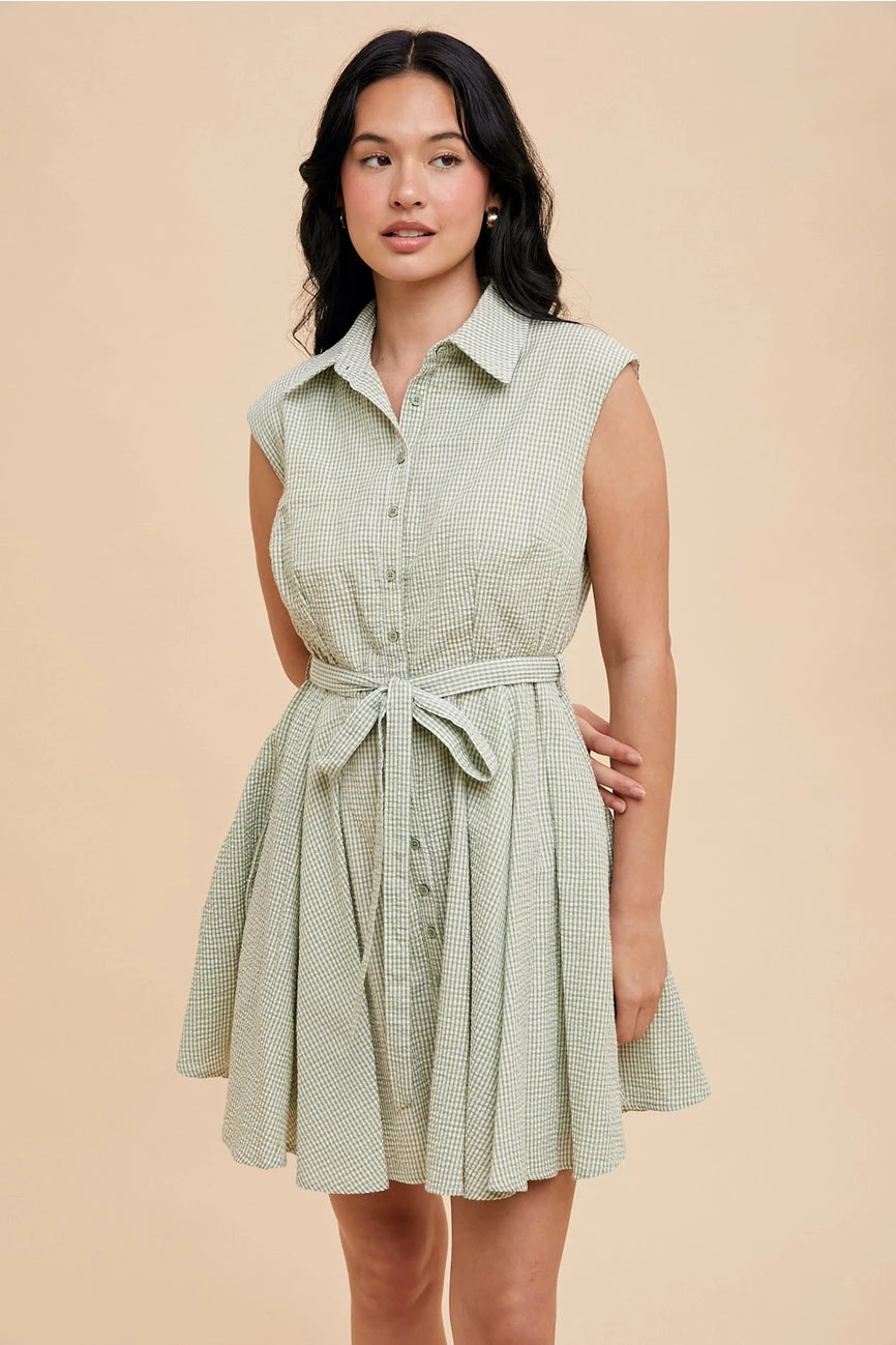 Mini dress in green and white seersucker. This dress has a shirt dress summary front, a removable sash belt, and a fold over collar. The skirt is short and full with side pockets and an elastic back waist. This dress is fully lined.
