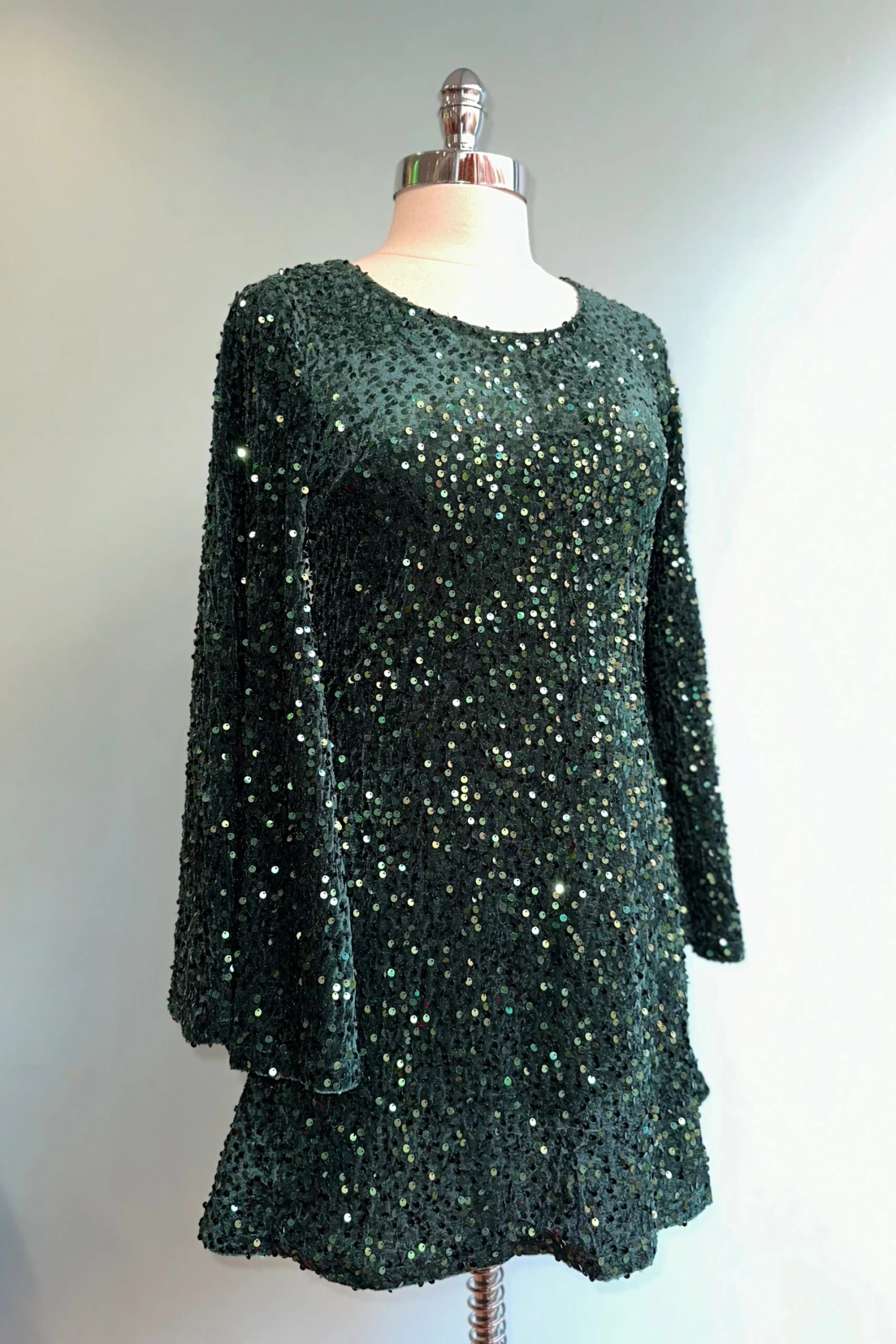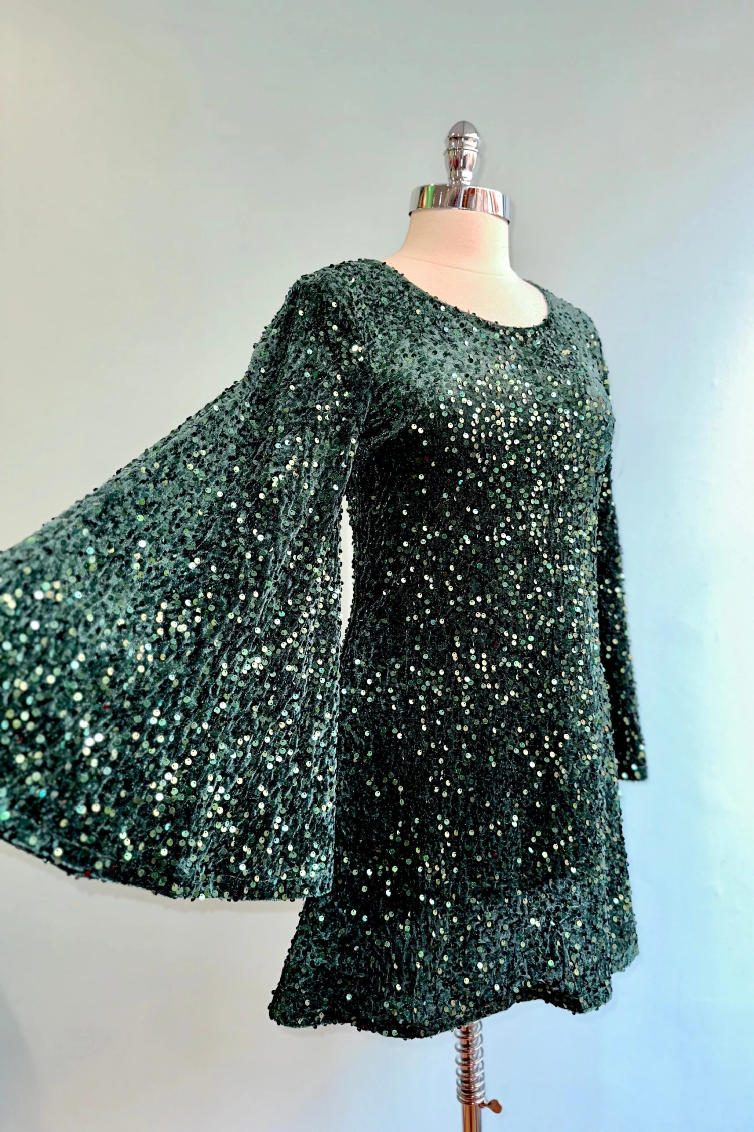 Look at this sleeve! Long bell sleeve mini dress forest green sequins. This dress is unlined and has pockets. The bodice has bust darts for a fitted shape, falling softly over the waist and hips. Pullover style with a little stretch.
