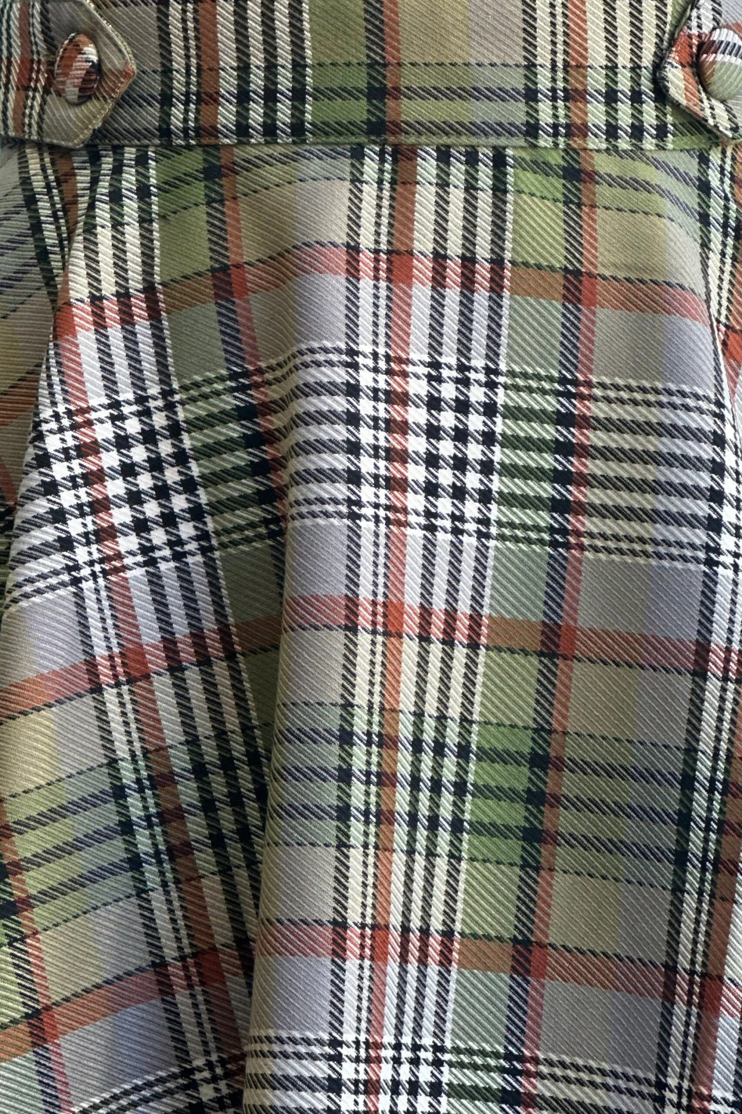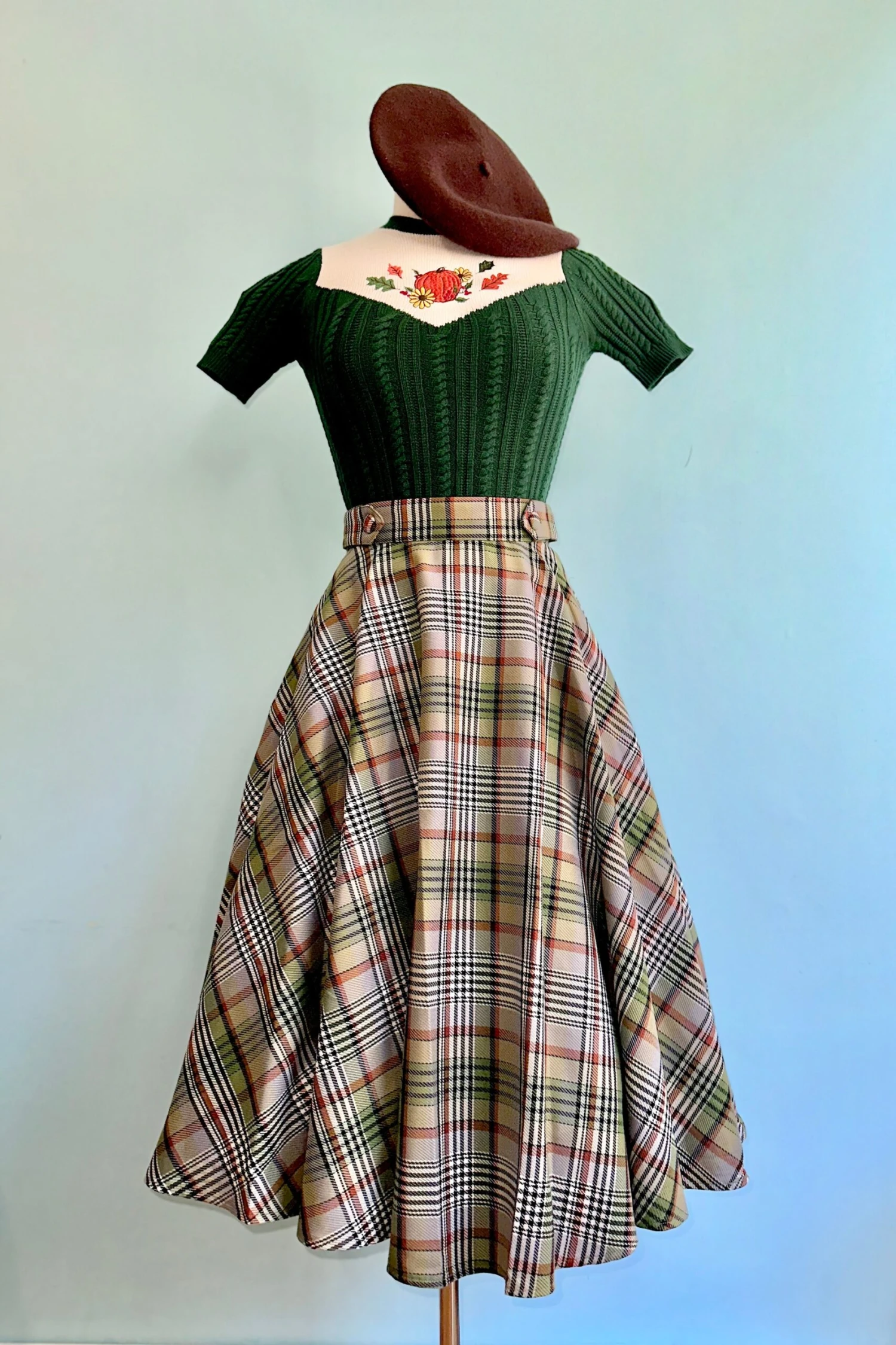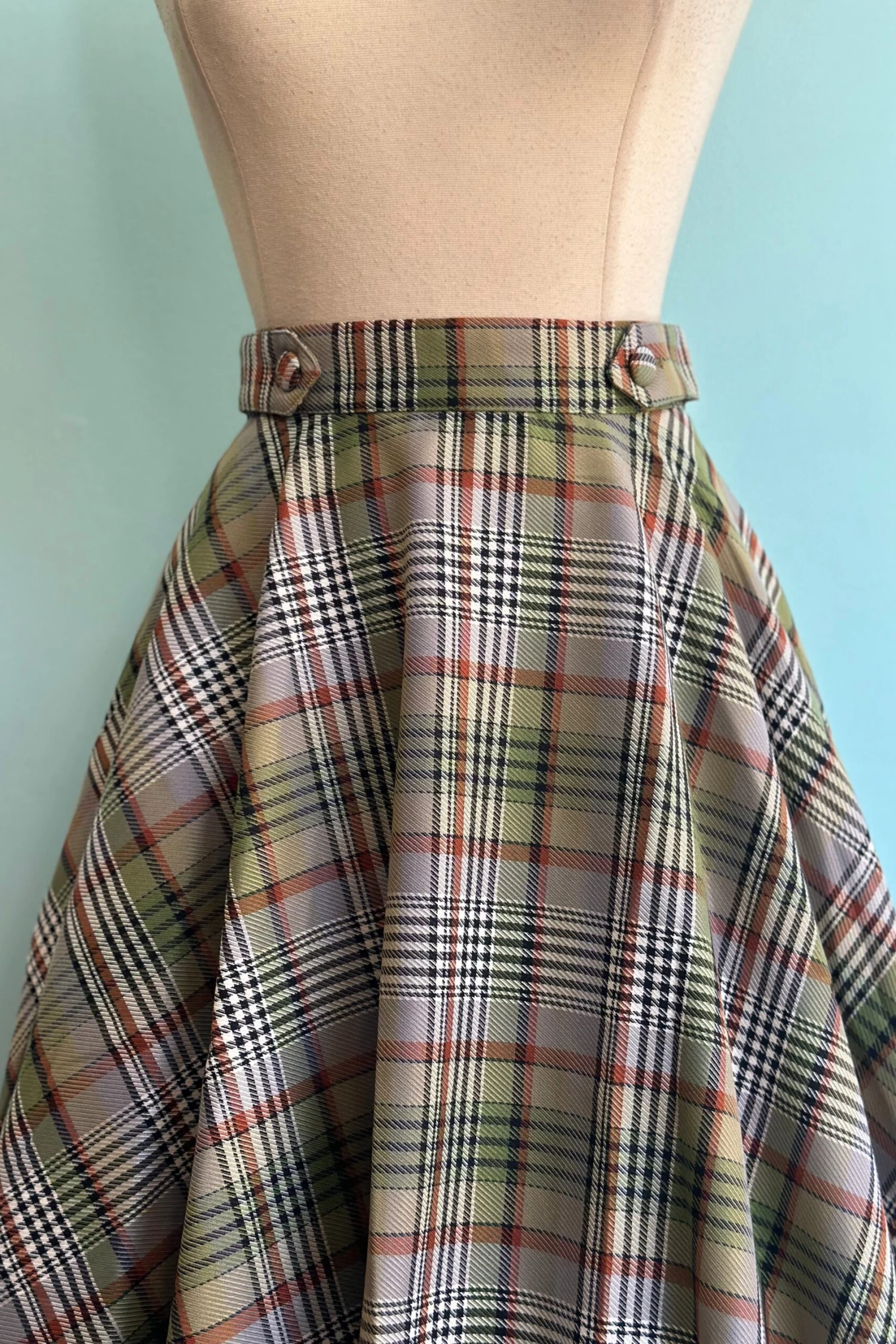 Green, rust, grey, black and white plaid skirt, a wardrobe staple for fall and winter! This skirt zips up the back, has hidden side pockets and is not lined.
