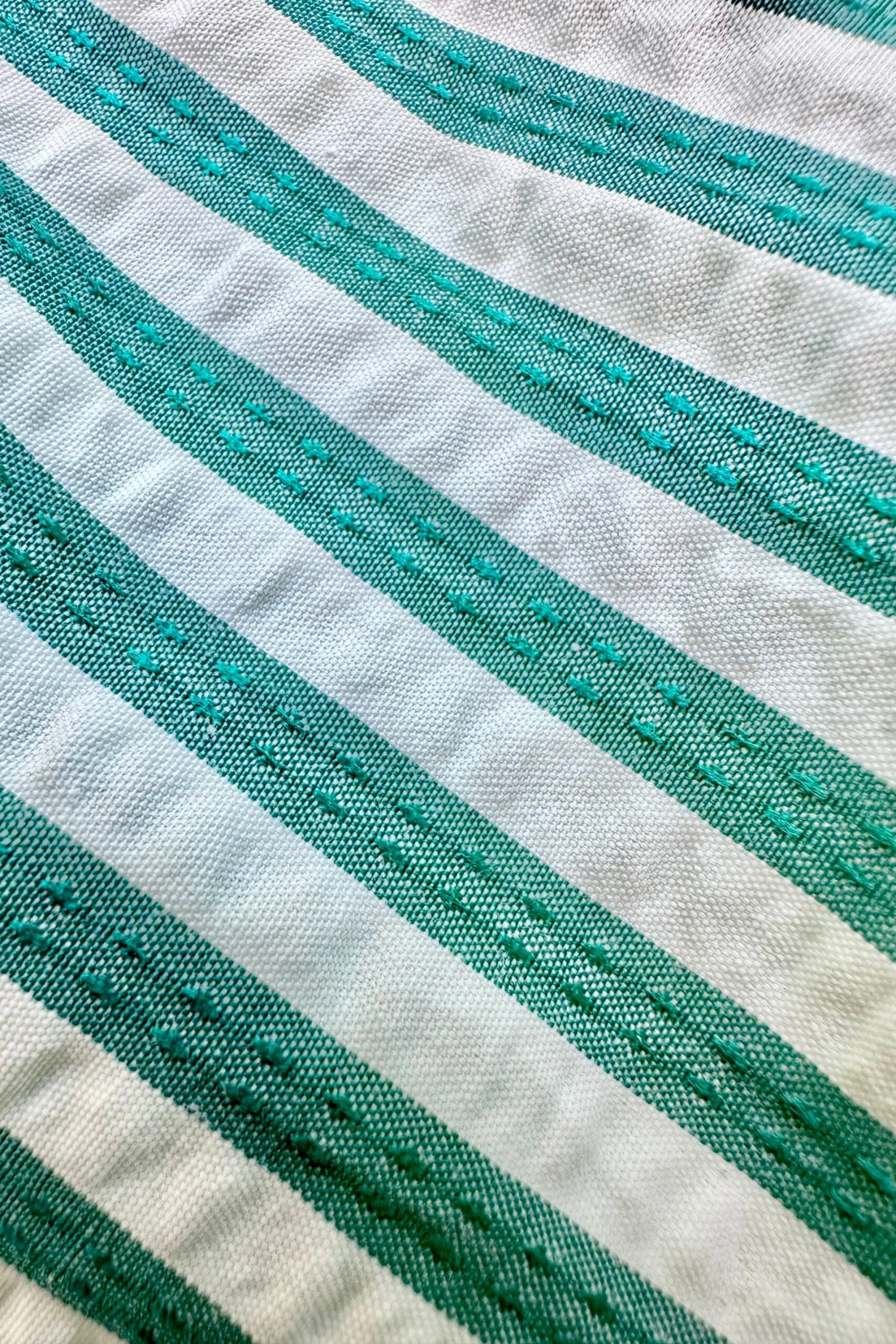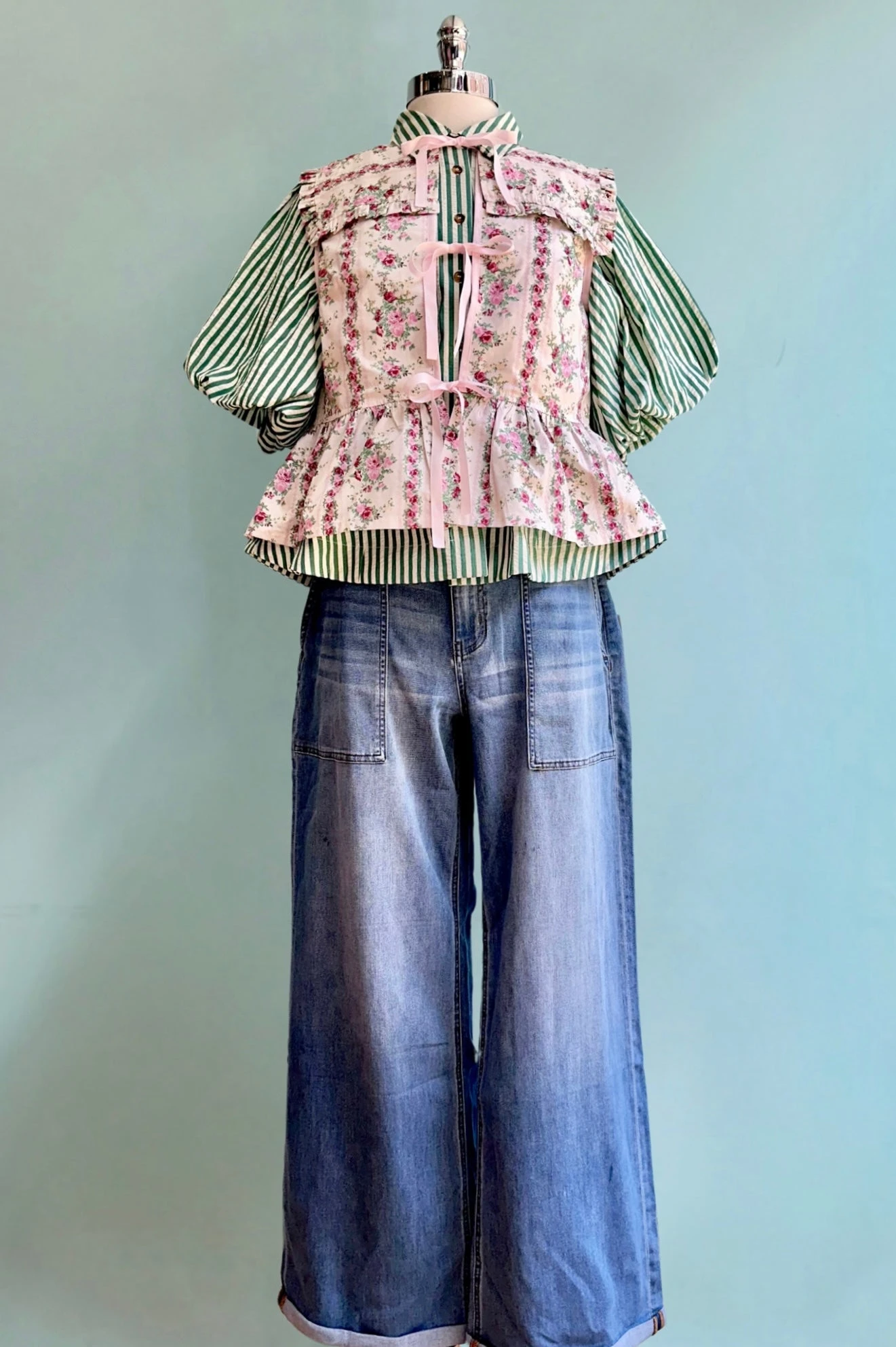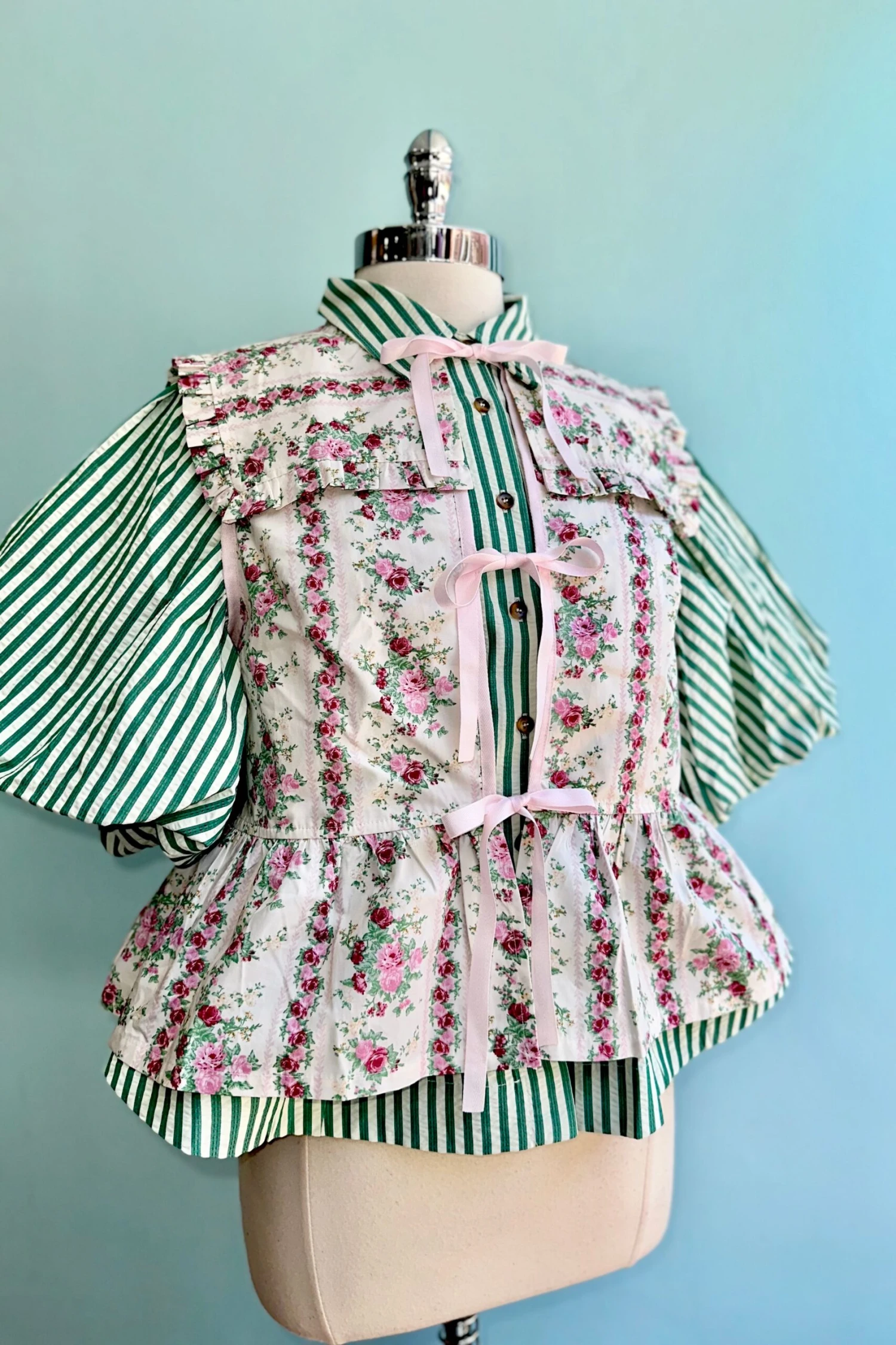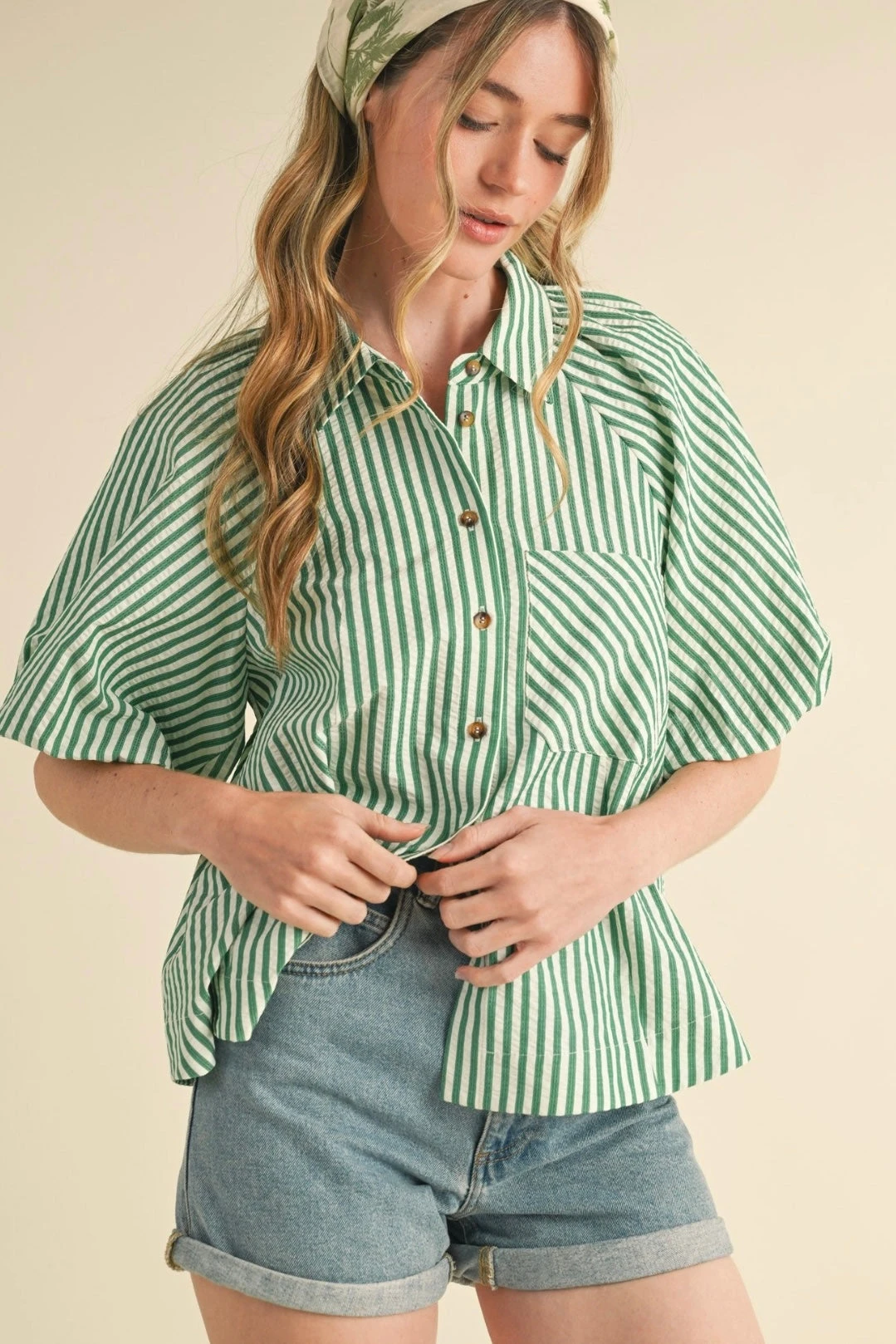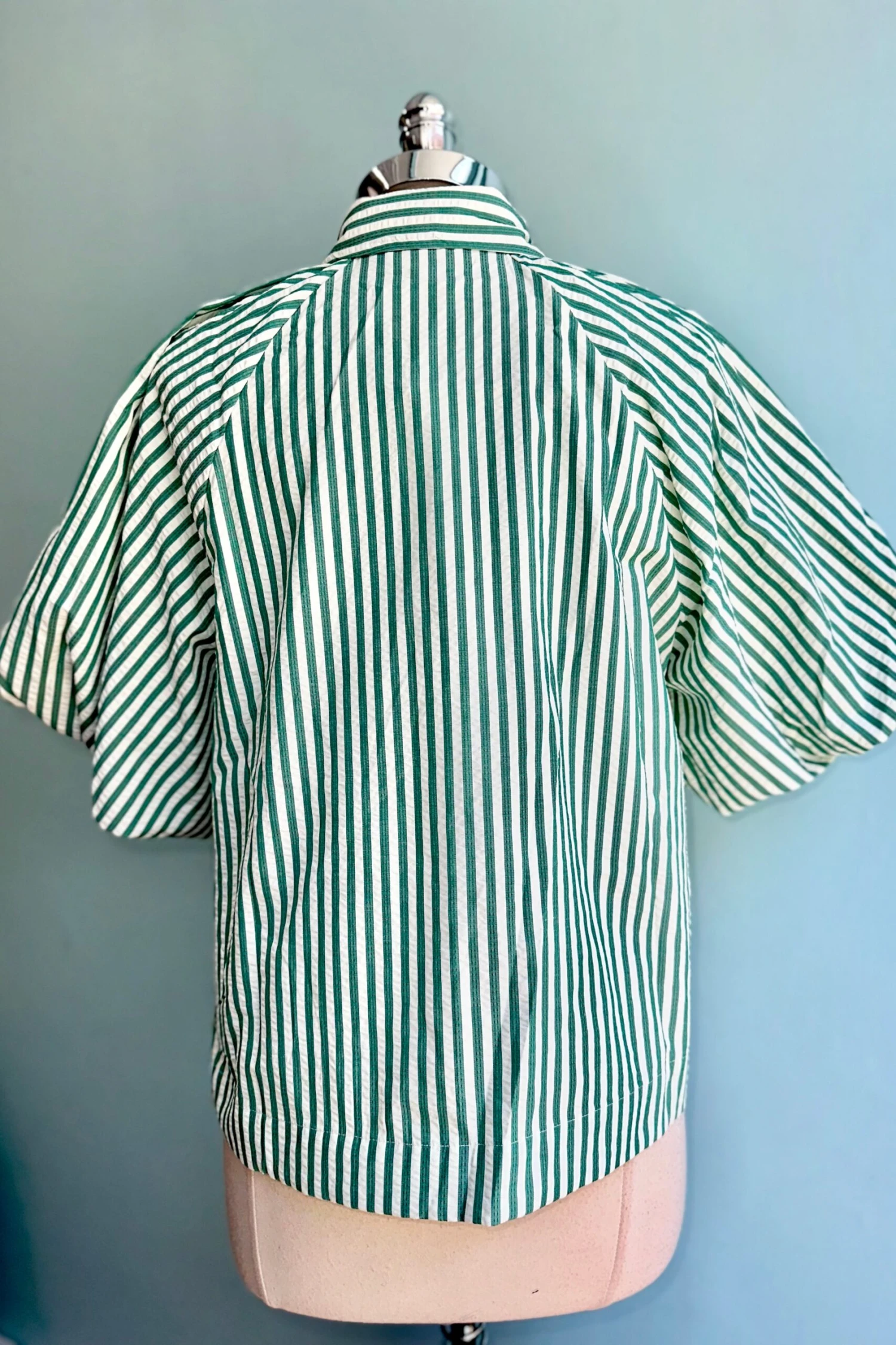 Button down top in ivory and green stripe with elbow length balloon sleeves. This top is textured like seersucker. The front has summary closures and the neckline has a fold over collar.