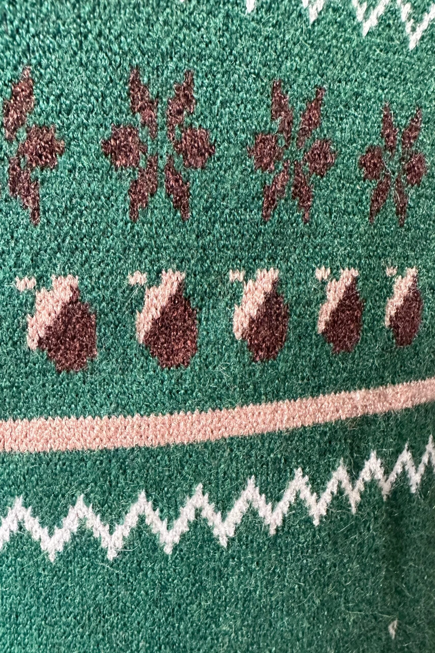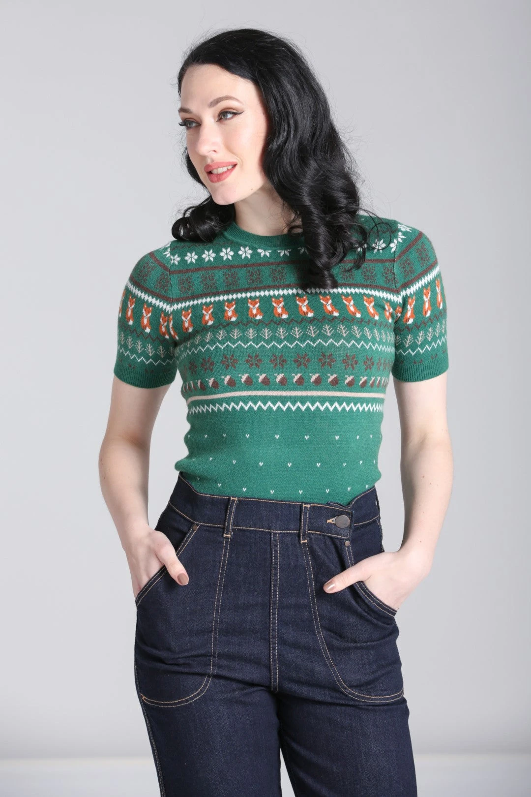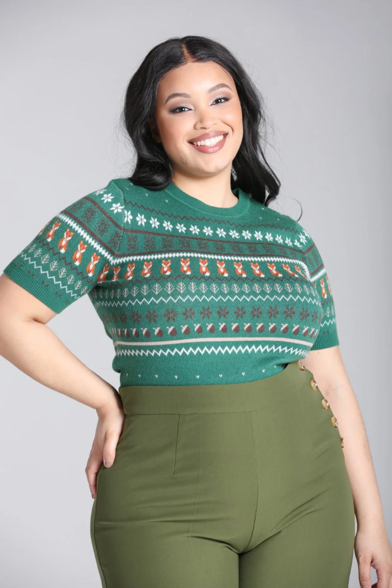 Fair isle short sleeve sweater in green with a print of foxes, acorns and fall leaves.