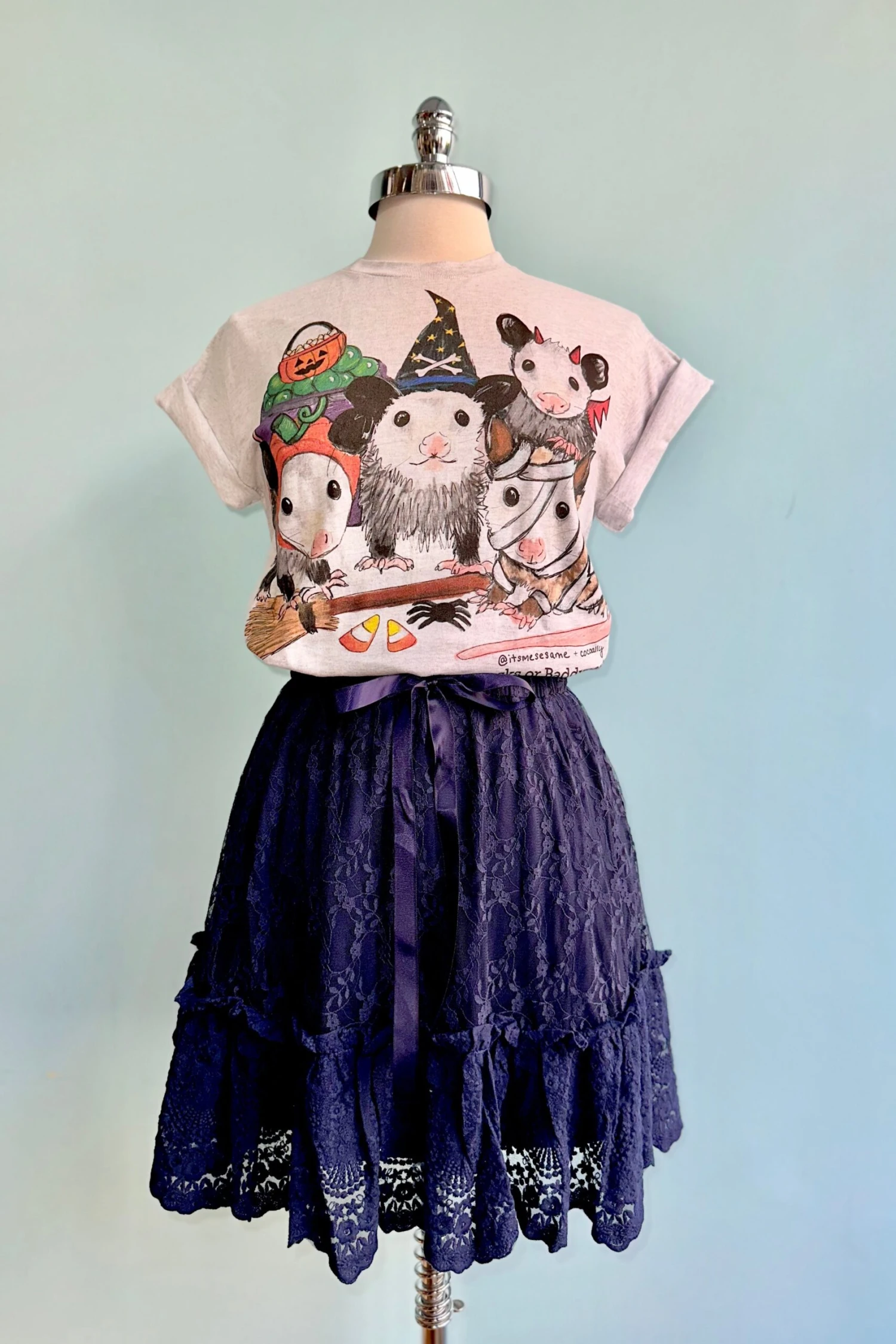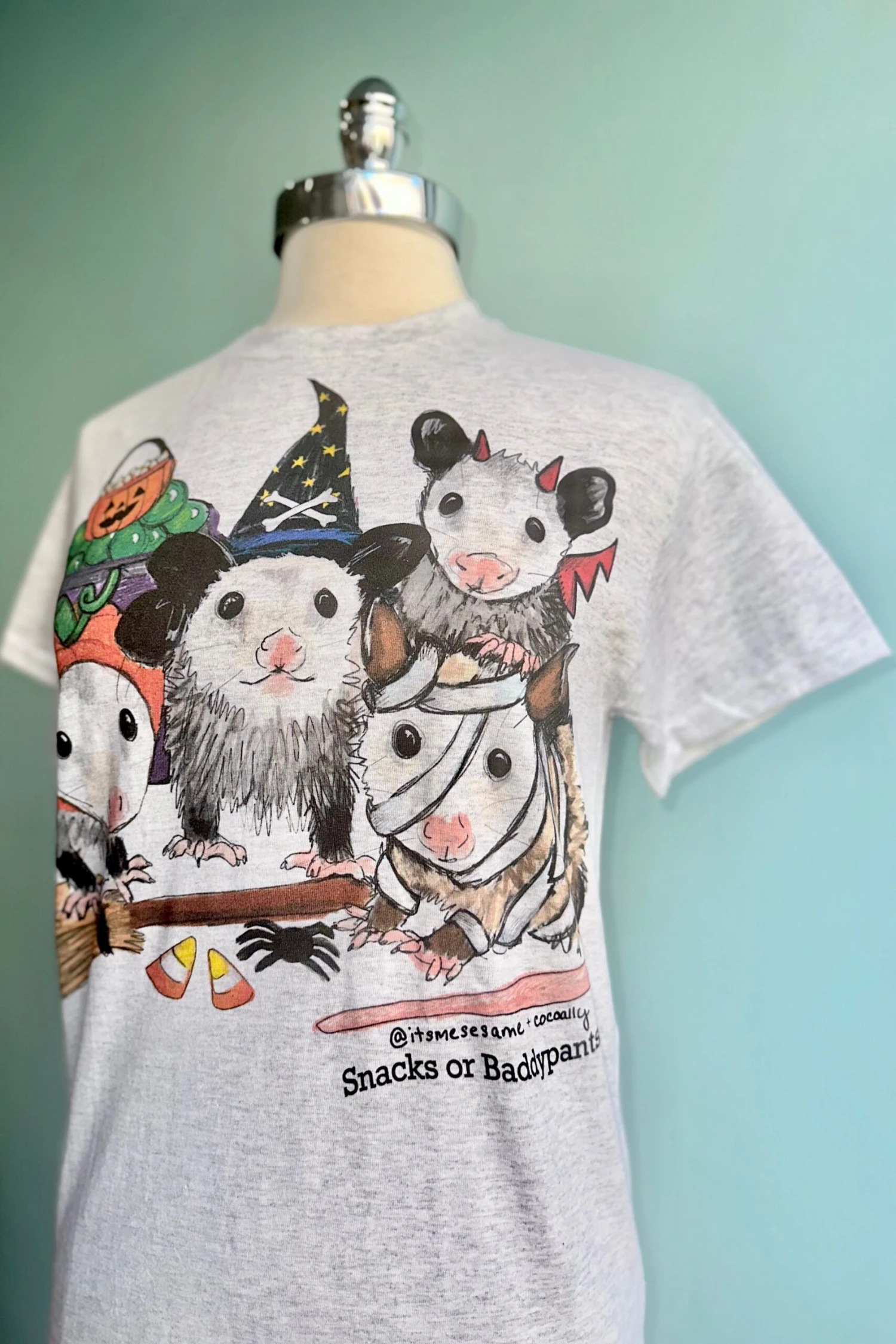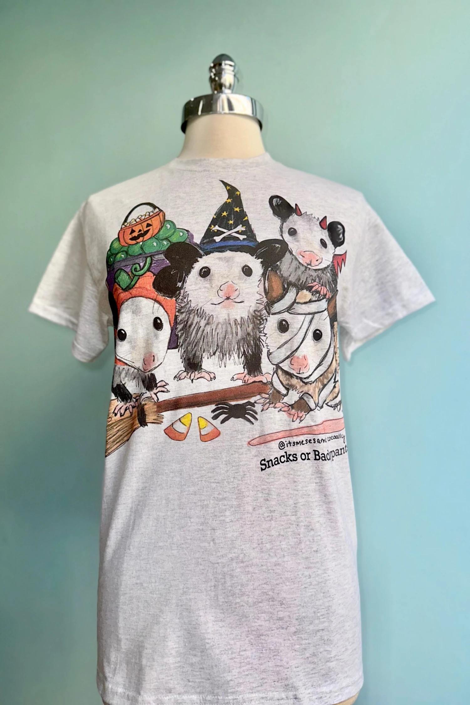 Halloween costumes possum t-shirt in grey. Unisex sizing and made of 100% Cotton.