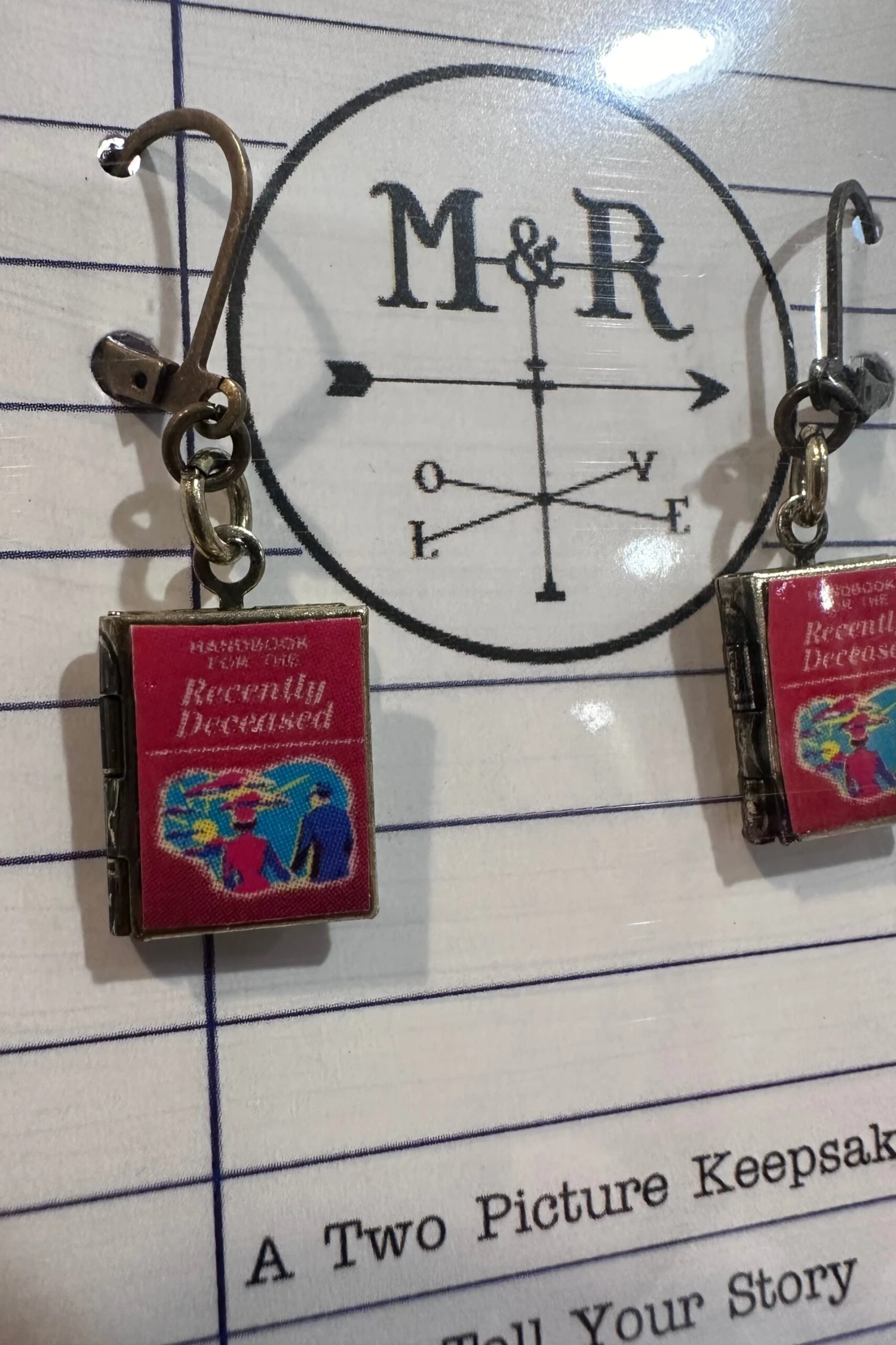 Book Locket earrings in The Handbook for the recently deceased from Beetlejuice! Our new book locket earrings are made with nickel free materials and feature the most beloved classic and modern books! They are on lever back style backers and are sealed with a gloss finish for durability. Each little locket measures about 1/2 long and 3/8 wide and is a little less than 1 1/2 inch long while wearing them.