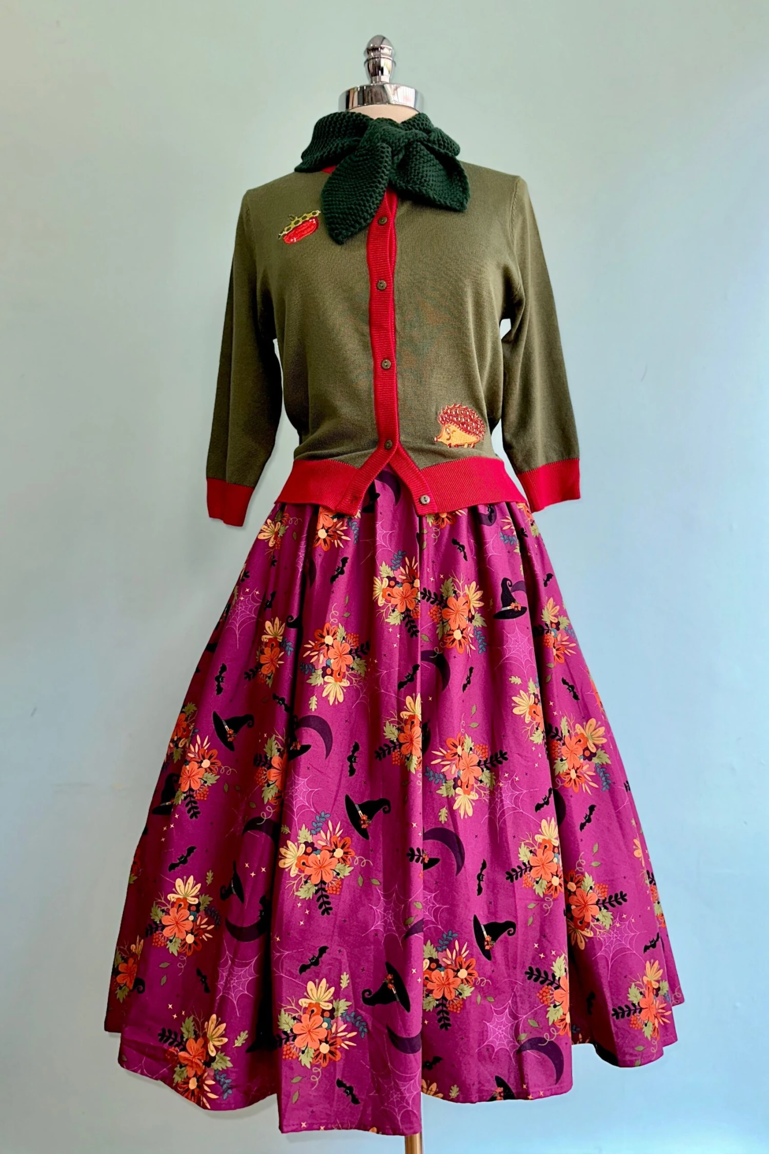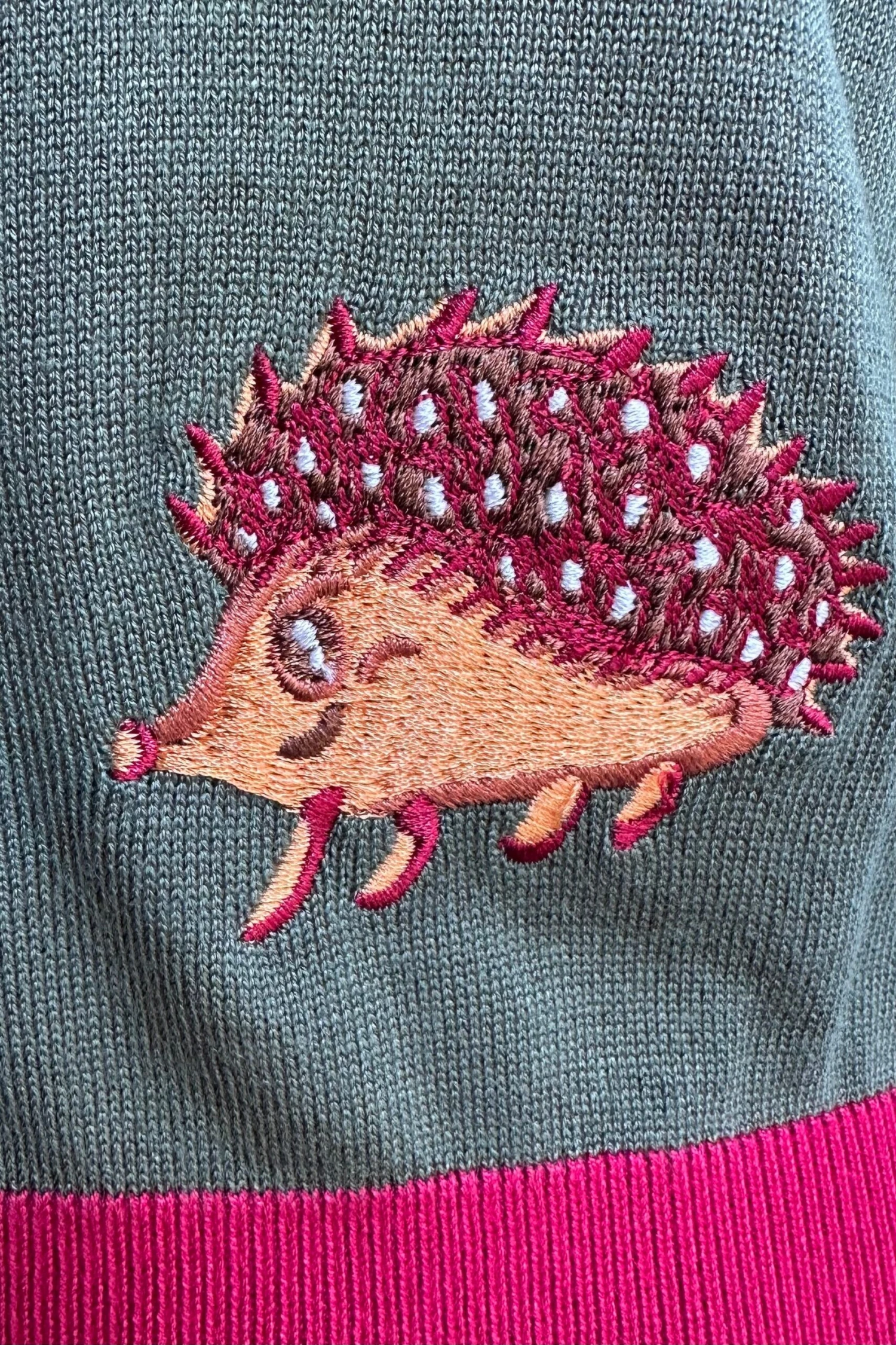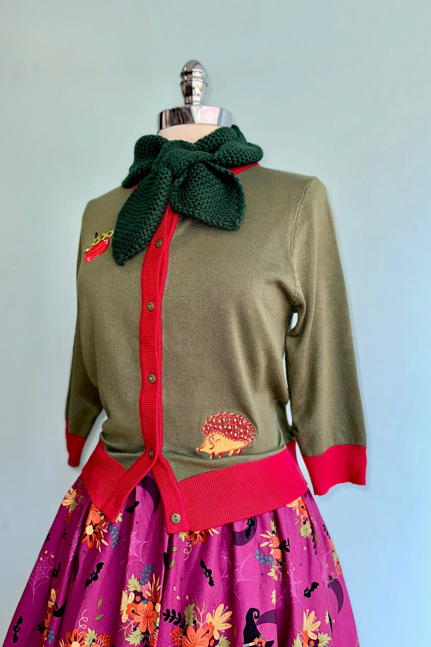 Short cardigan sweater in green with red trim and an embroidered acorn in red and hedgehog in brown on the front. This cardigan has 3/4 sleeves, a summary front and a crewneck.