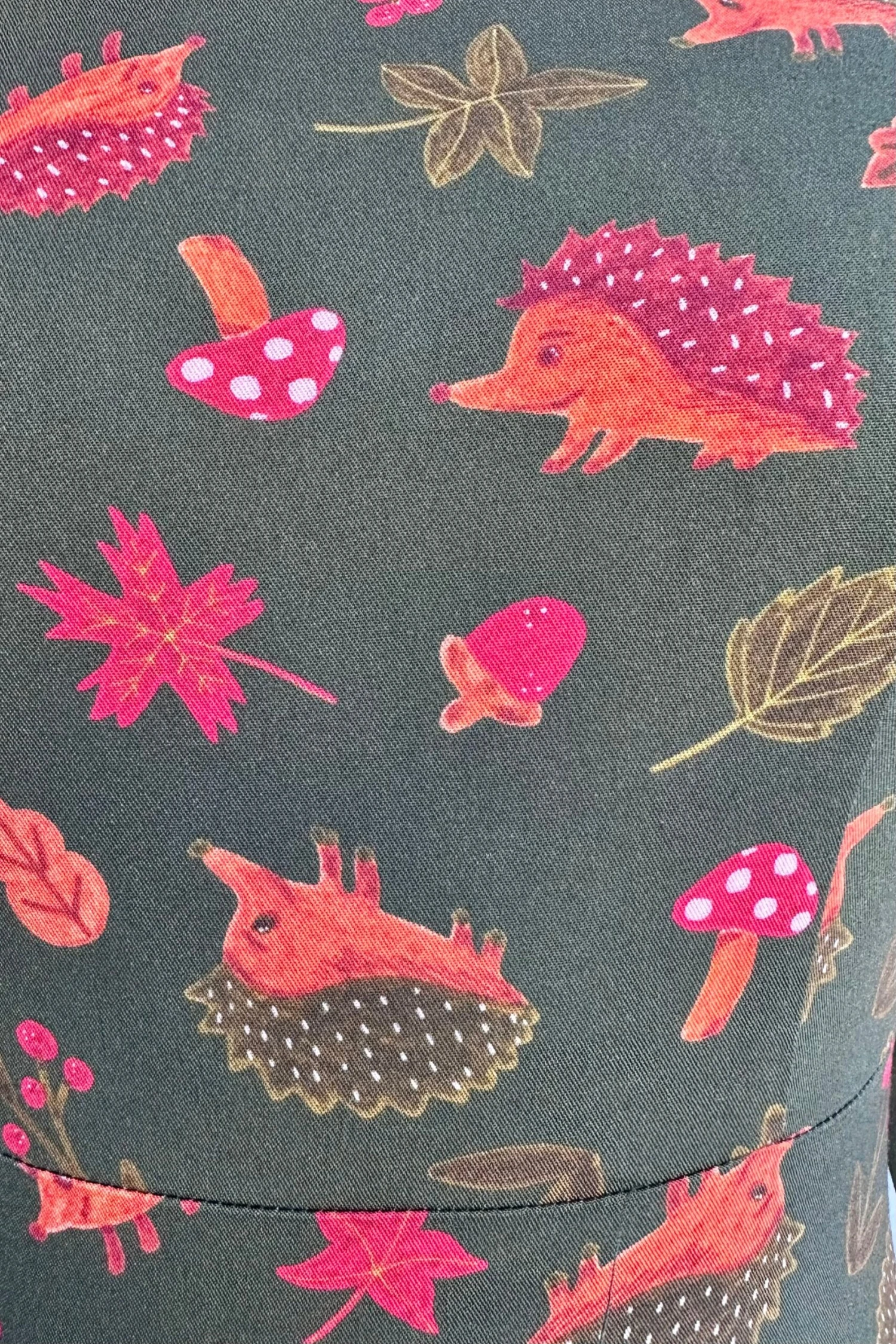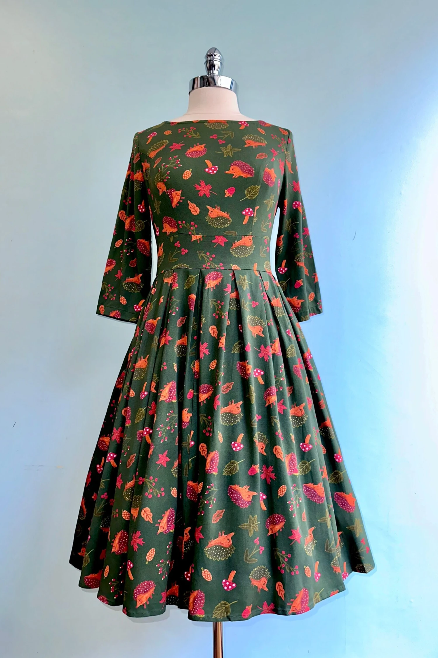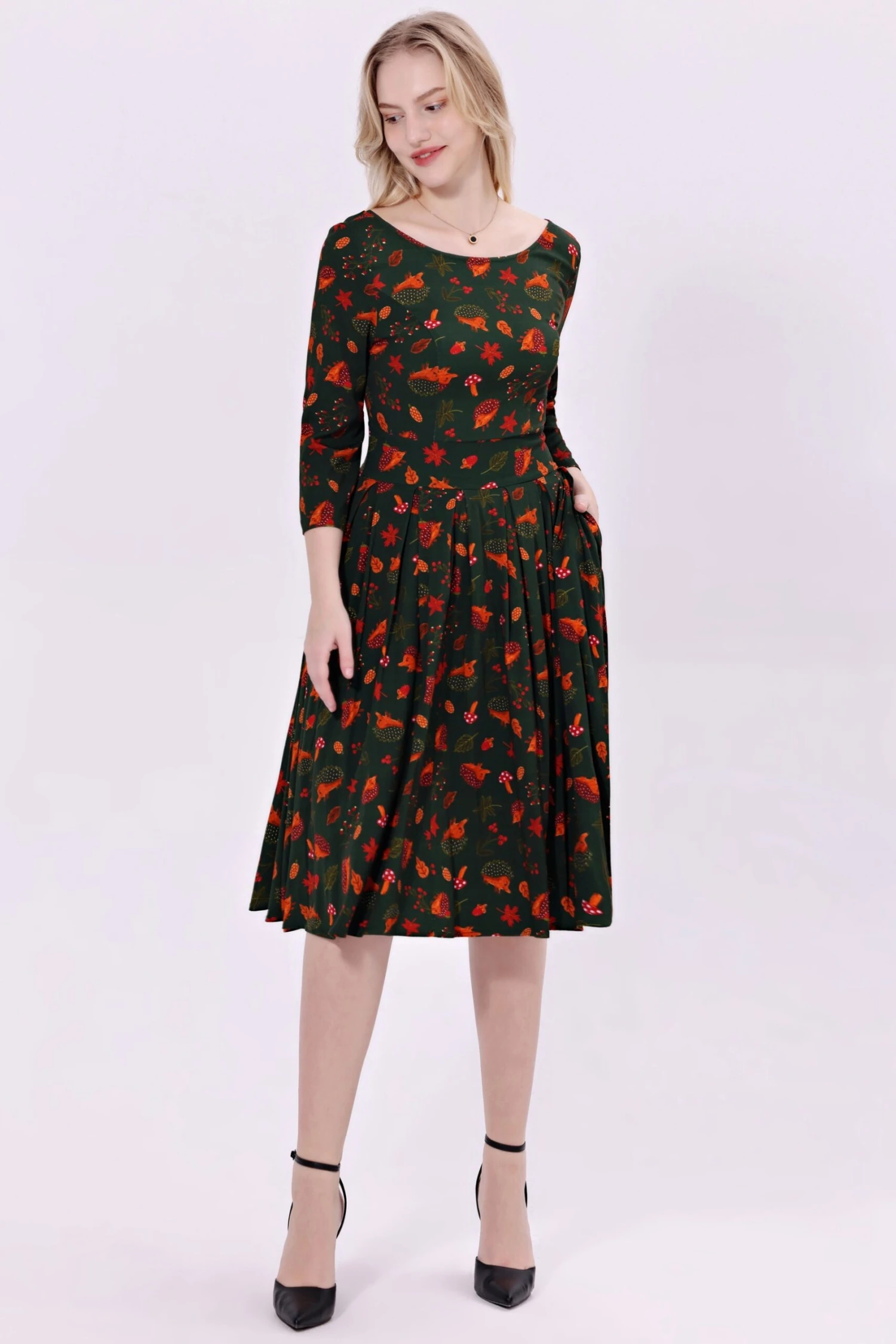 Boat neck dress in forest green with red mushrooms, leaves, holly and hedgehogs throughout. This dress has 3/4 sleeves a V-neck in the back, a back zip closure and a full skirt. This dress is not lined and has side pockets. Original print artwork by Sweven Print Design.