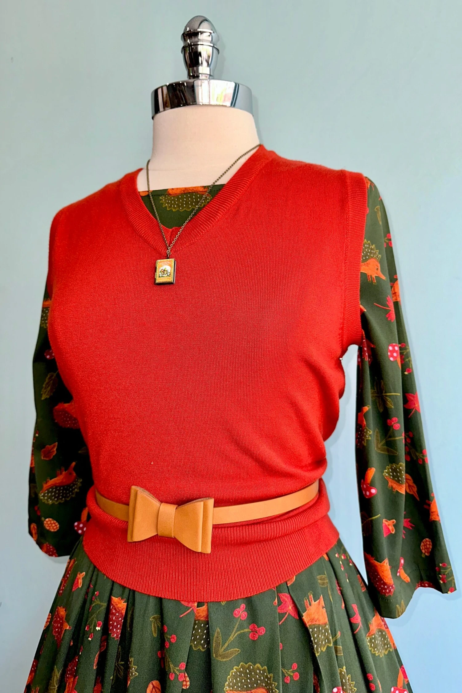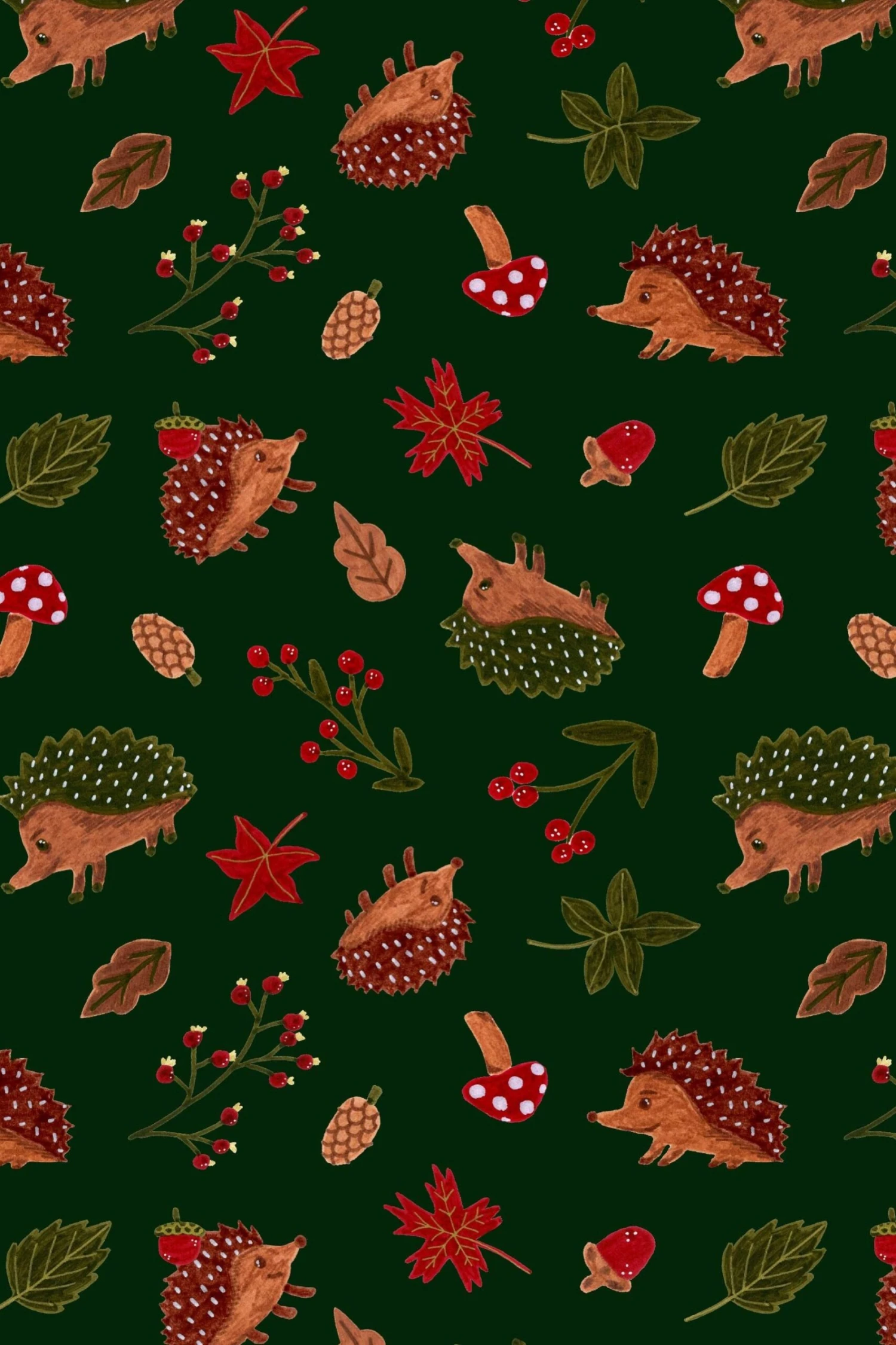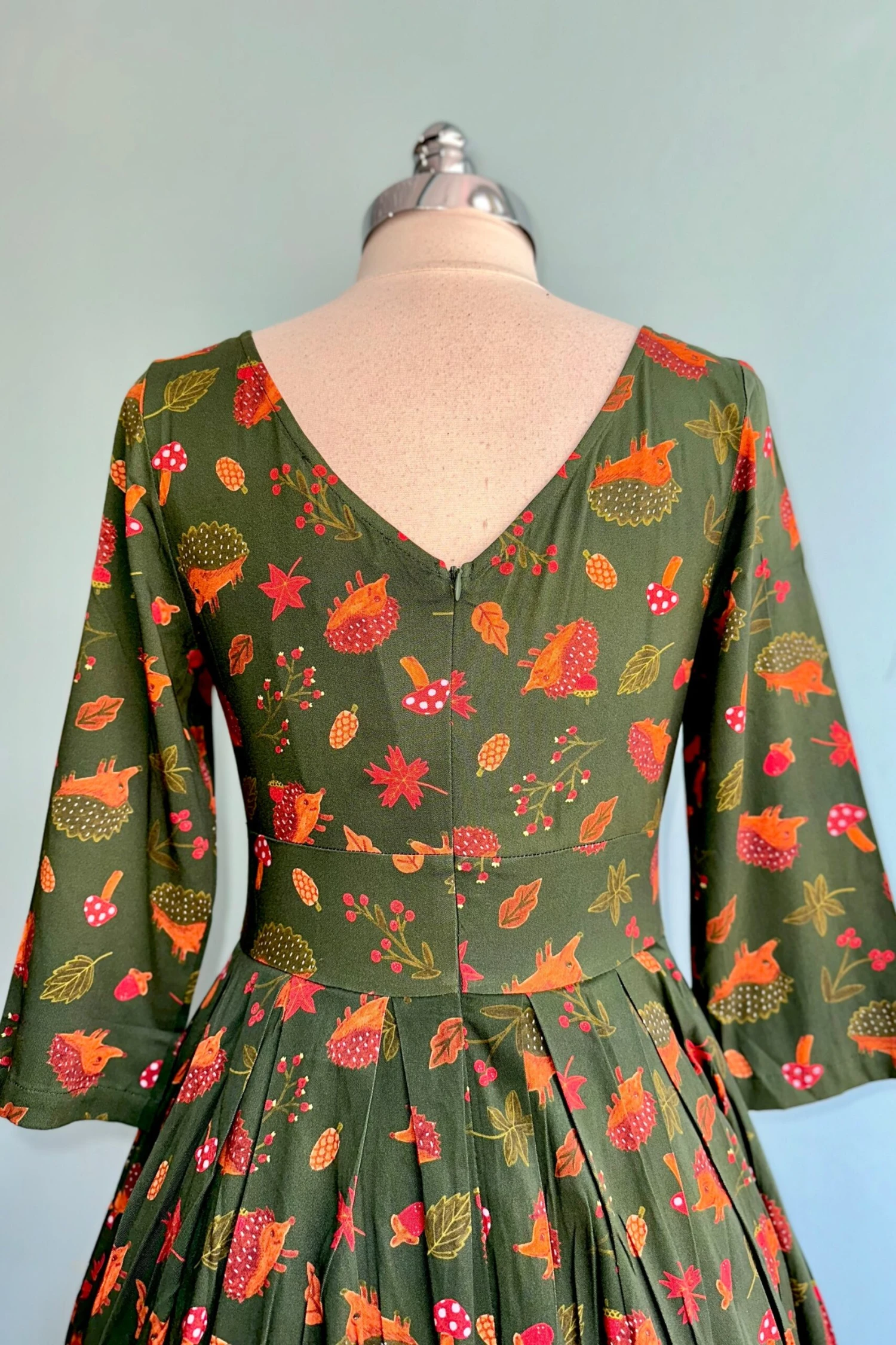 Boat neck dress in forest green with red mushrooms, leaves, holly and hedgehogs throughout. This dress has 3/4 sleeves a V-neck in the back, a back zip closure and a full skirt. This dress is not lined and has side pockets. Original print artwork by Sweven Print Design.