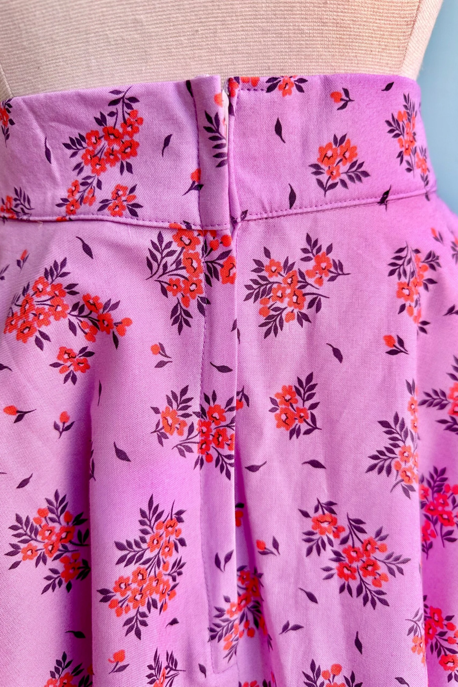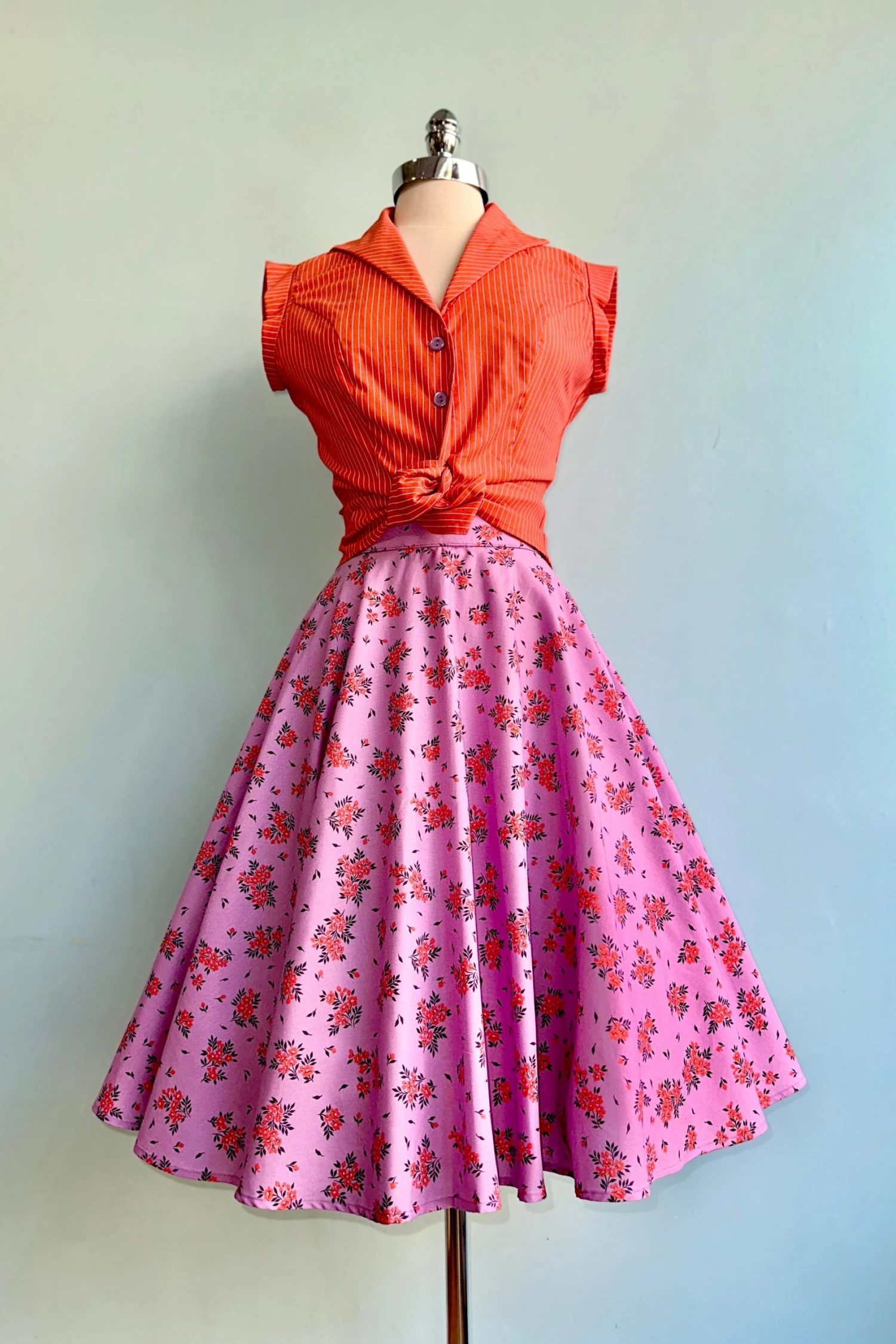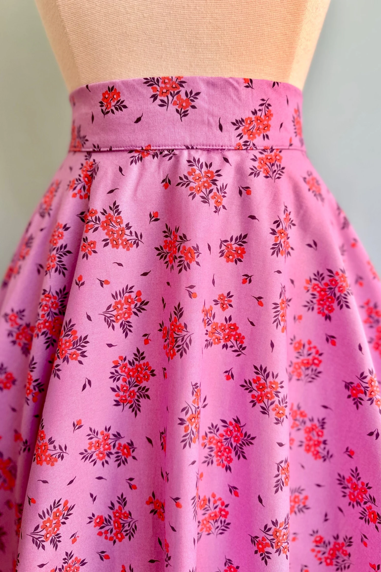 Circle skirt in lavender with little purple and coral bouquets This skirt pairs perfectly with our Wildfire Striped Erika Top. This is 100% cotton, has pockets and zips up the back. Full circle skirt shape. Not lined.