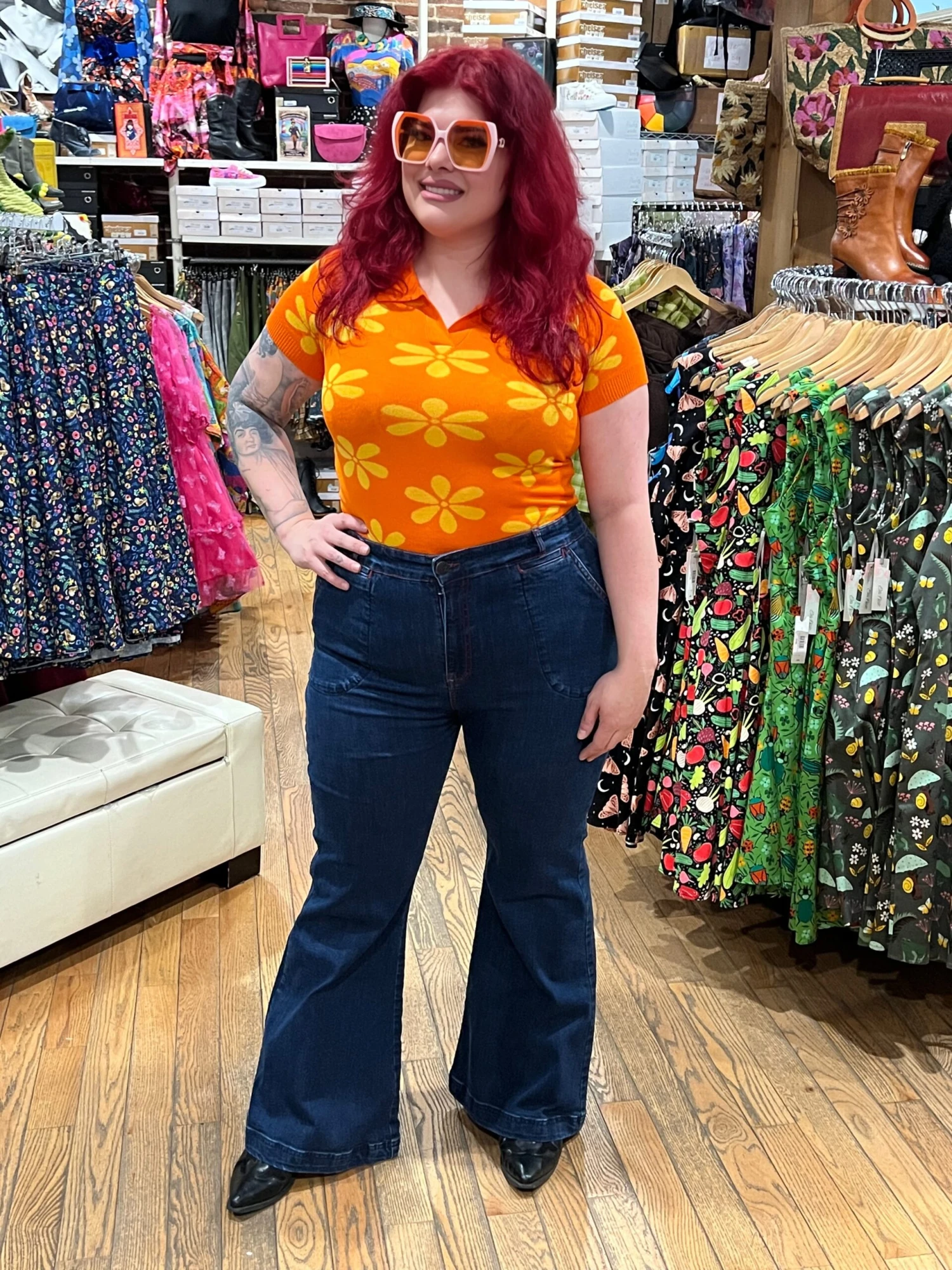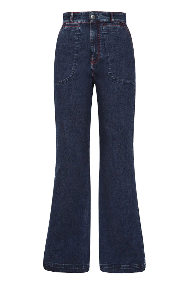 Yes Millie Babes we are getting into denim! These are high waisted, flare stretch denim jeans, with red top stitching. There are front and back pockets.