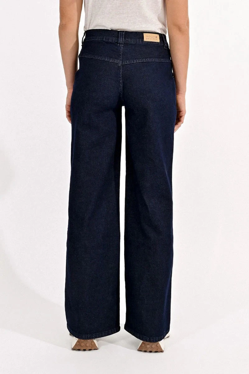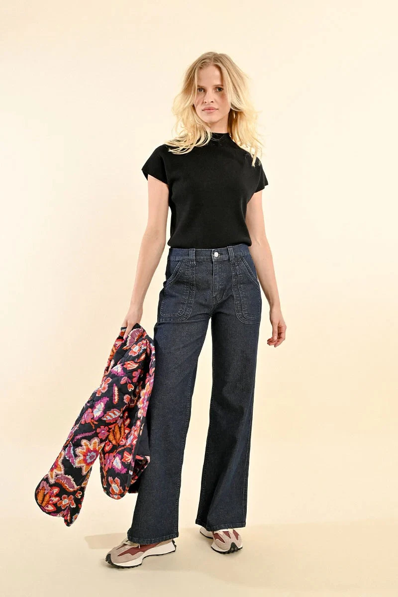 Expertly crafted by Molly Bracken, these high waisted wide front pocket jeans are designed for both style and practicality. These jeans are a dark wash with a wide waistband and large square pockets.