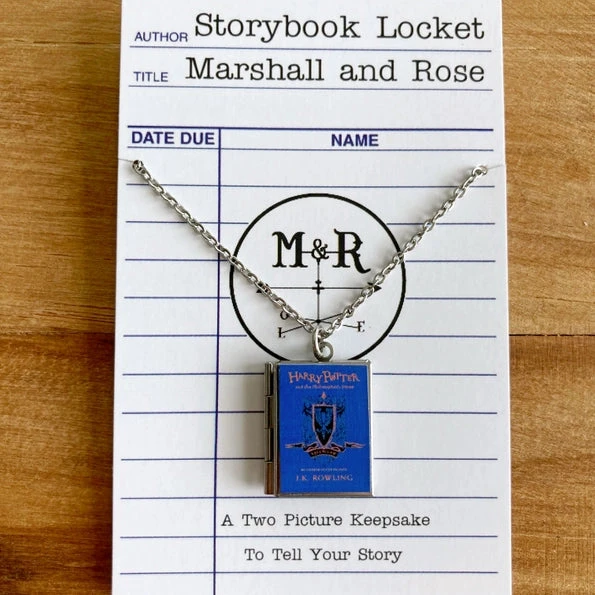 Book locket in Harry Potter, House Ravenclaw! Our book lockets are made with nickel free materials and feature the most beloved classic and modern books! They are on 24-inch chains and are sealed with a gloss finish for durability. Each locket can hold two pictures.