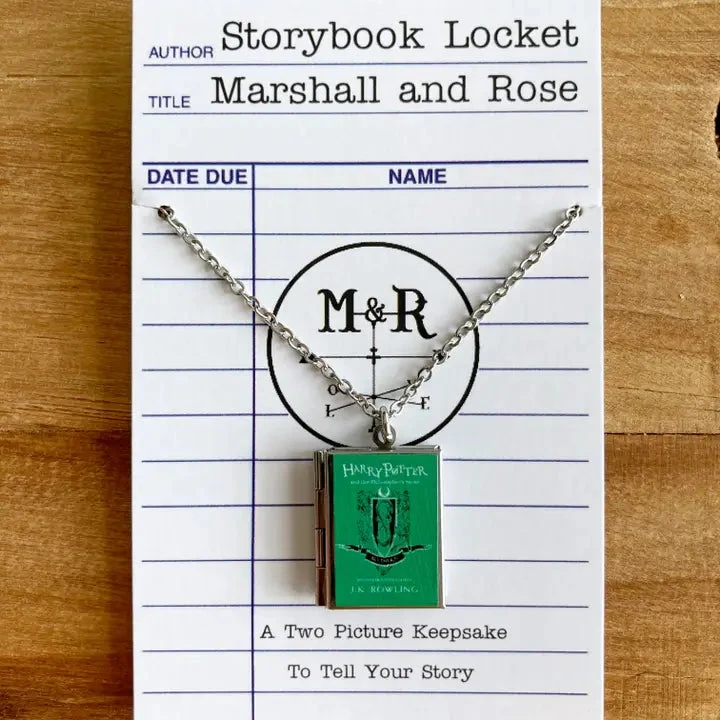 Book locket in Harry Potter, House Slytherin! Our book lockets are made with nickel free materials and feature the most beloved classic and modern books! They are on 24-inch chains and are sealed with a gloss finish for durability. Each locket can hold two pictures.