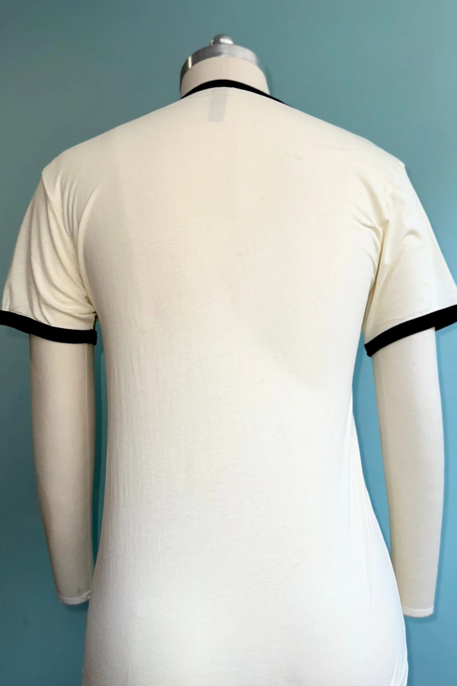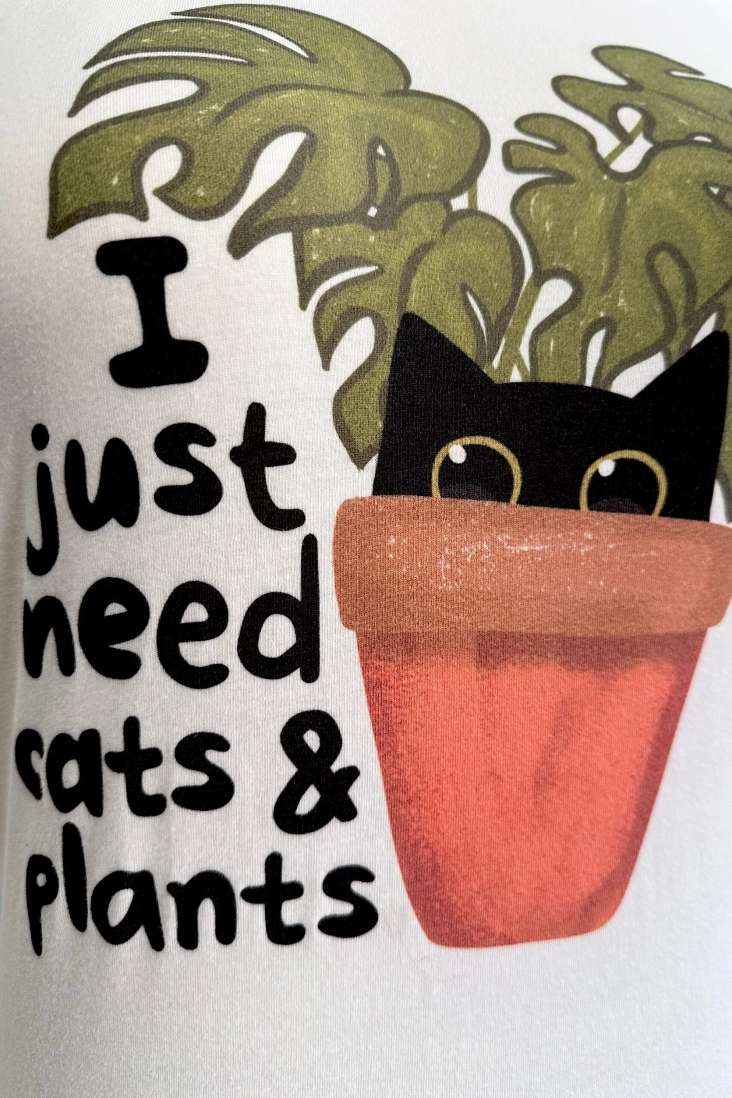 I Just Needs Cats and Plants ringer T-shirt in off-white with black contrast. Unisex sizing and made of 100% Cotton. Fabric has a good amount of stretch!