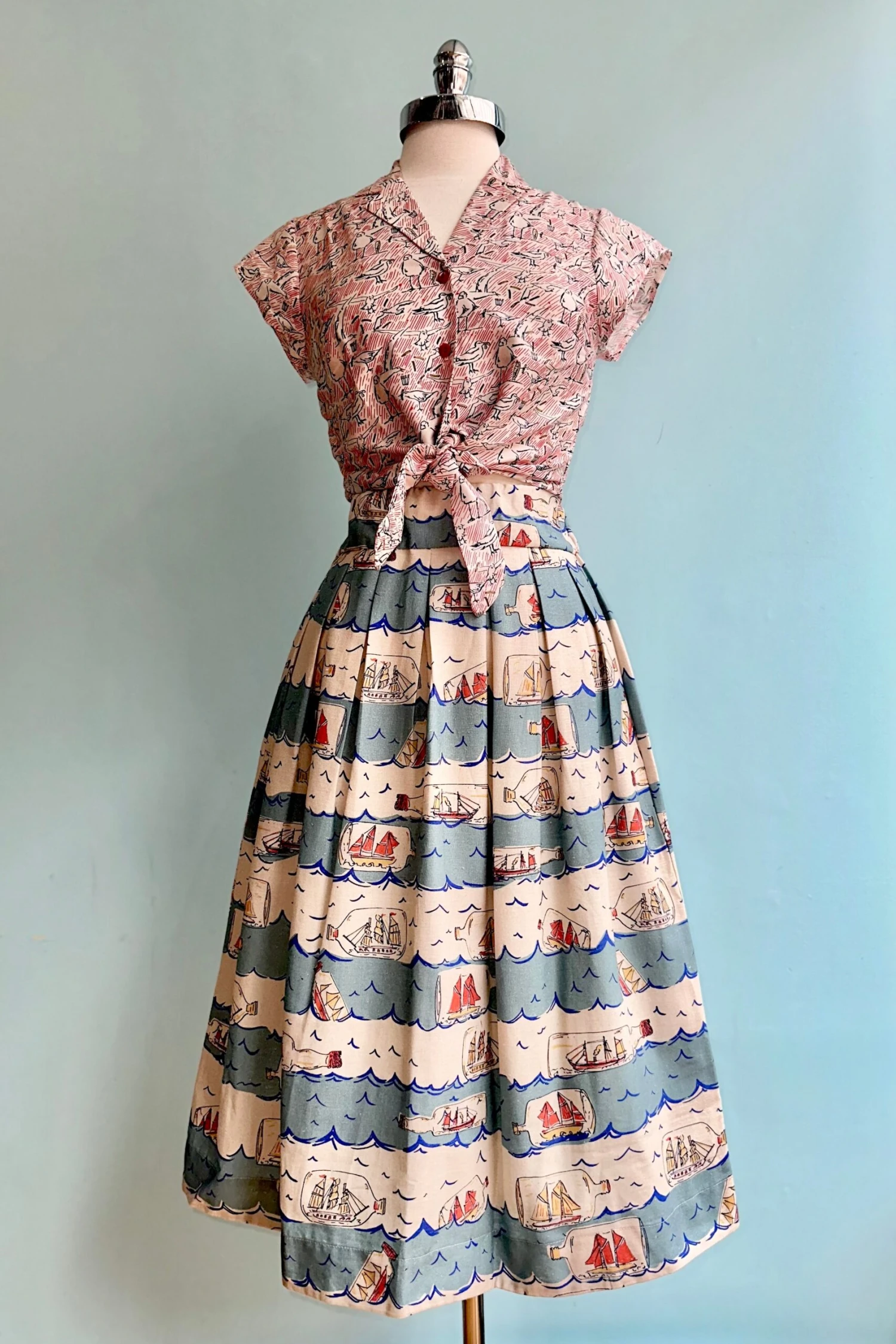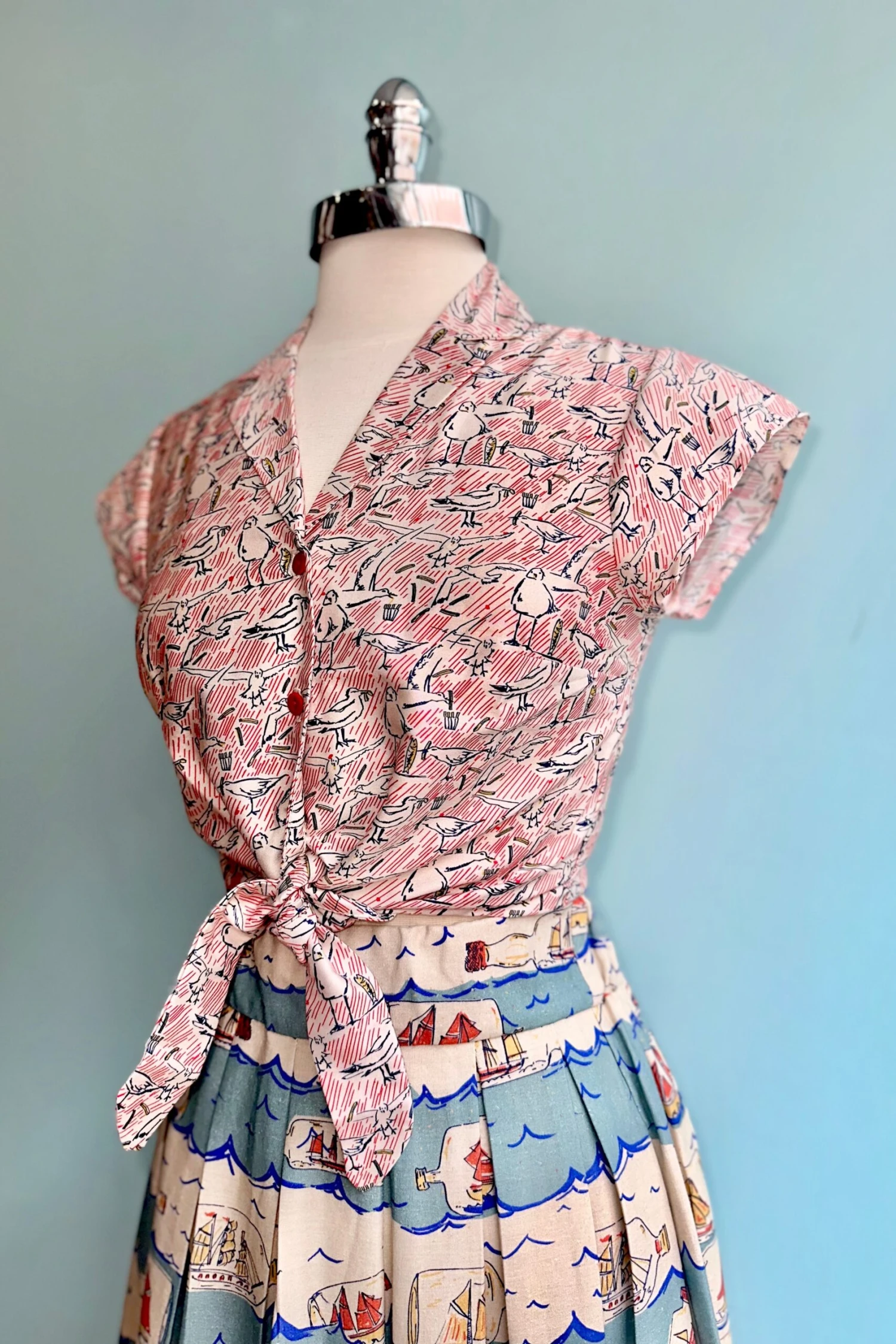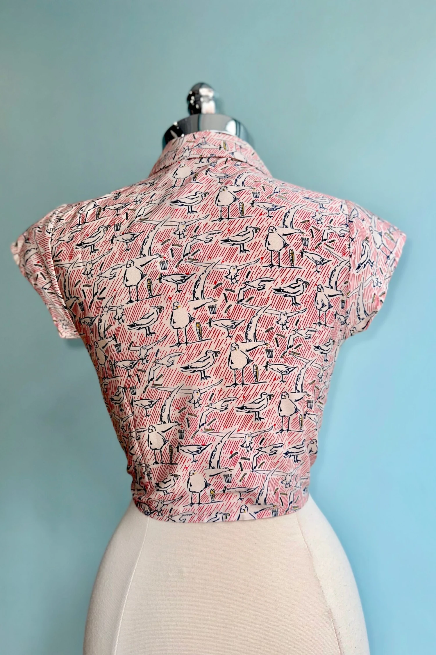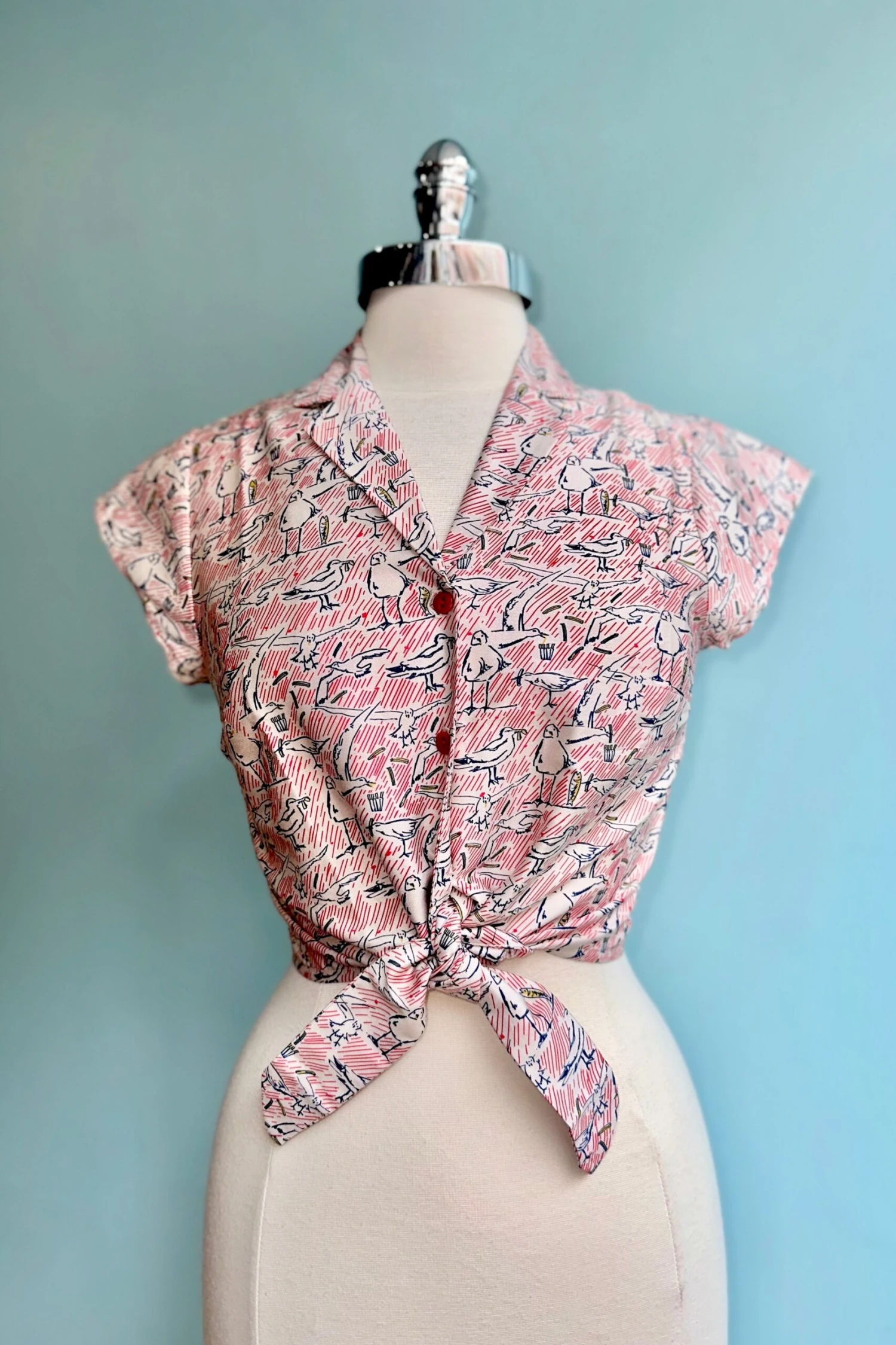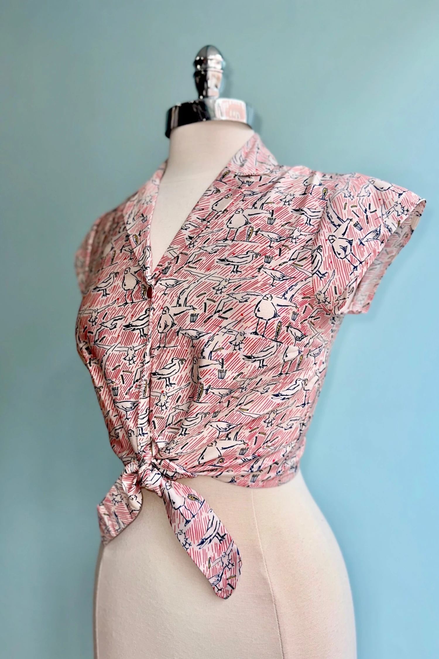 A white top with a print in blue and red of seagulls, stripes, fish, and chips. The Peggy top is a Millie favorite with a summary down front, cropped tie waist and pretty cap sleeves. This top goes perfectly with high waisted trousers, a summer skirt or over a dress!