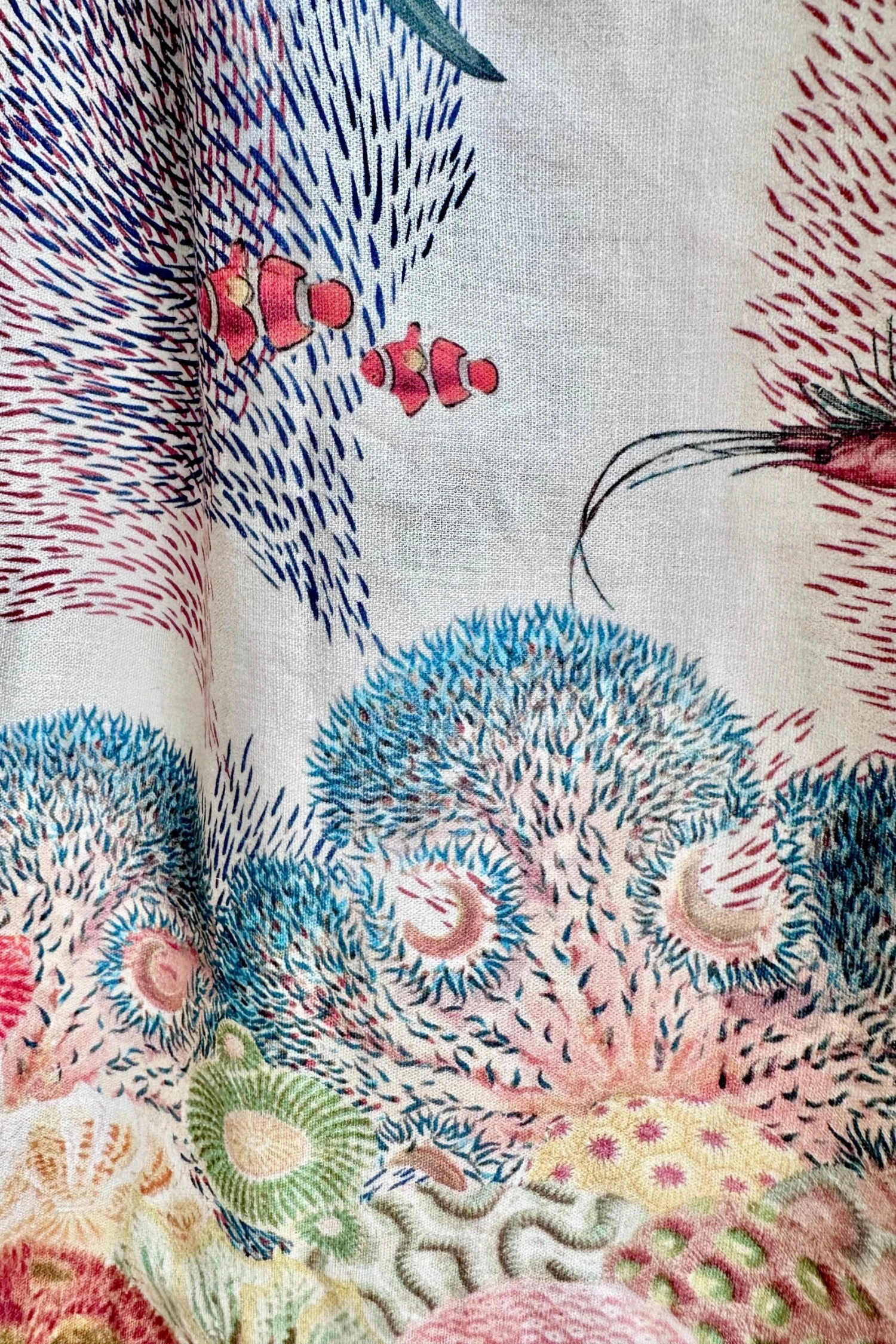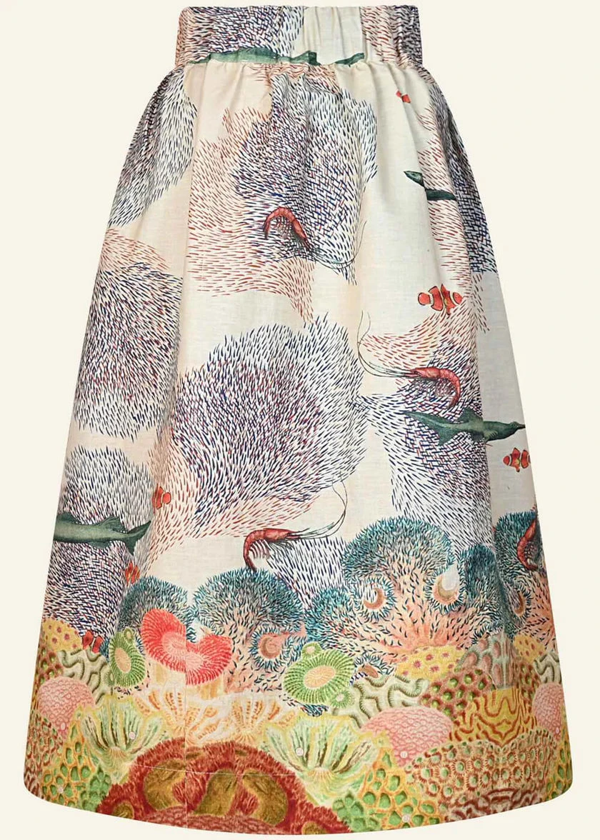 Stunning work of wearable art from Palava’s collab with the Natural History Museum. This skirt has a light tan background with a print of various sea life. There is an elastic back waist and no other closure. The skirt has pleating at the waist and is about midi length. There are side pockets and is not lined.